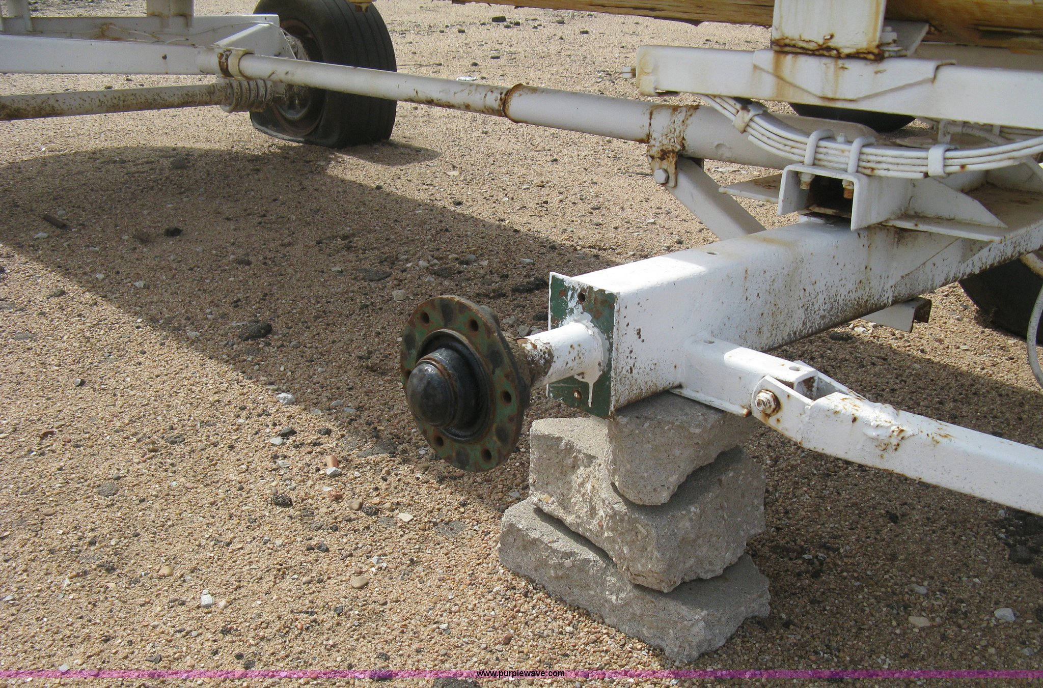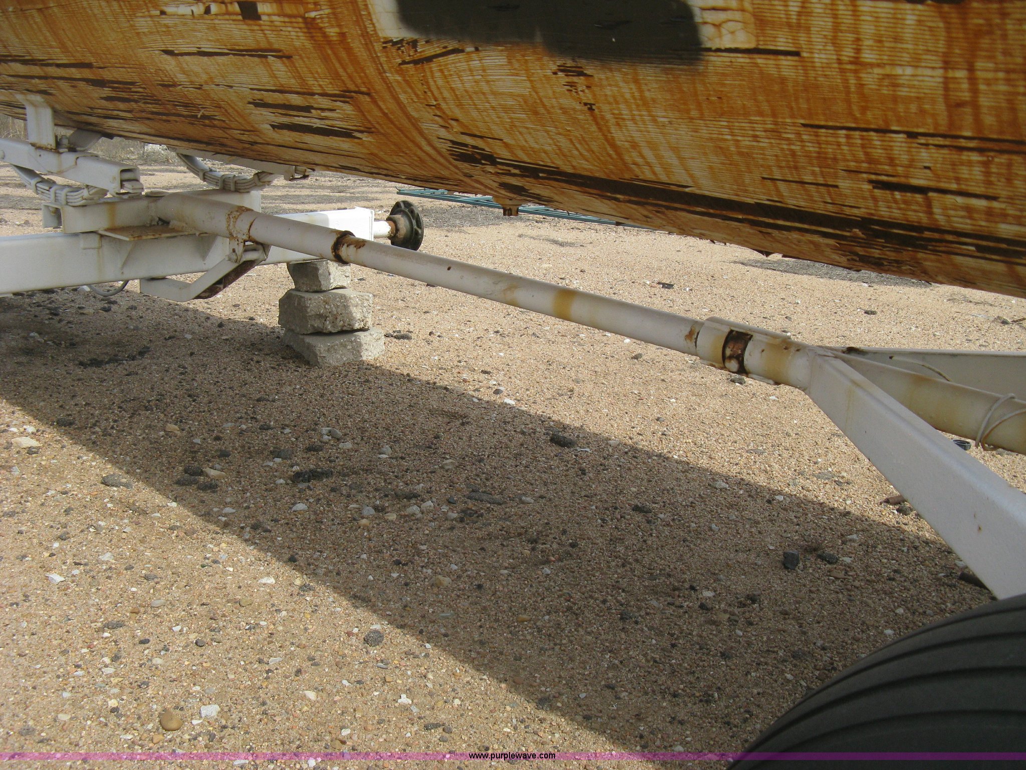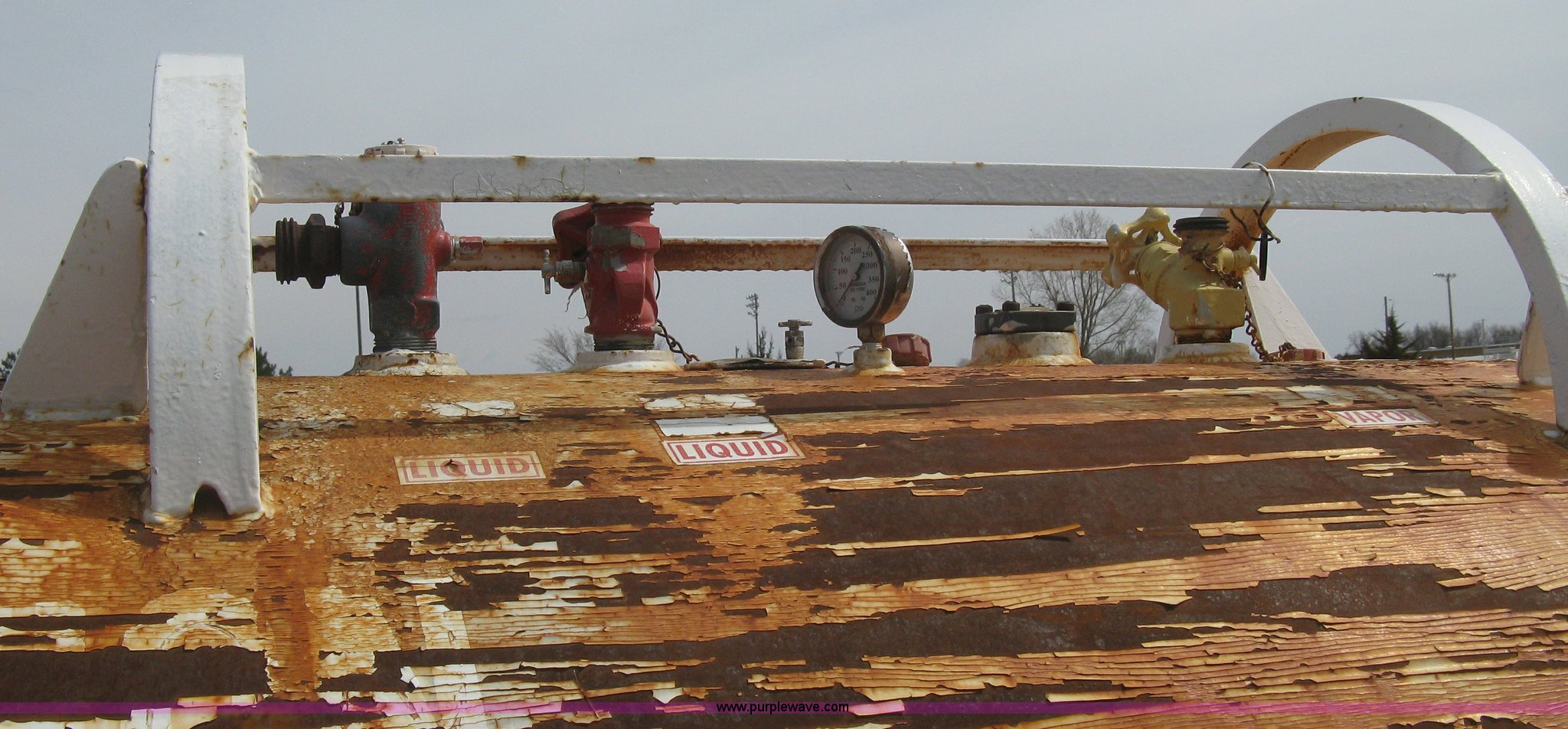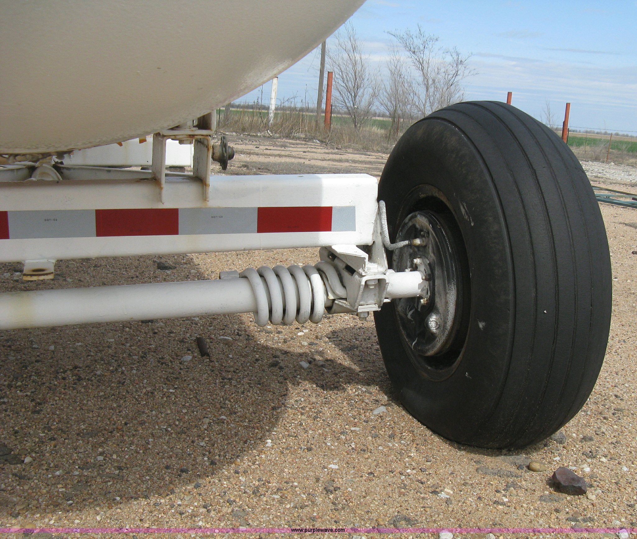 Purple Wave is selling a used Applicator Attach. in Kansas. This item is a Anhydrous ammonia tank with the following: 1,000 gallon capacity, Running gear, Pin hitch tongue, Rear pin hitch, (3) 11L-15 tires, six lug, One missing wheel, Tank failed inspection