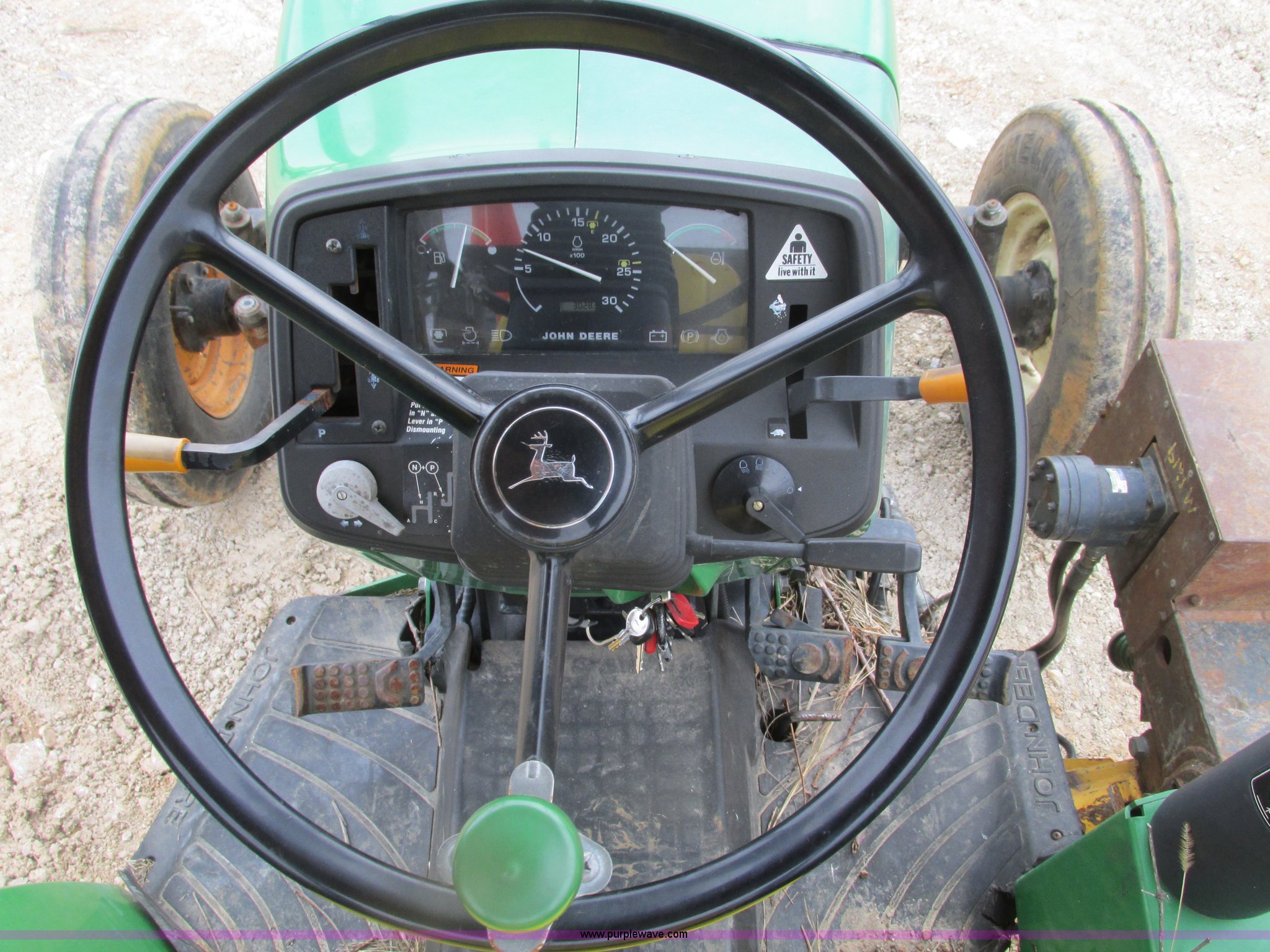 Purple Wave is selling a used Tractor in Missouri. This item is a 2002 John Deere 5220 tractor with the following: 3,028 hours on meter, John Deere four cylinder diesel engine, Manual transmission, Canopy, Front mounted toolbox, Rear auxiliary hydraulic tank for sickle mower, Rear wheel weights, 6' side sickle mower, Joystick control, 7.50-16 front tires, 380/85R16 rear tires, Three point arms and draw bar missing, Serial LV5220P226021, MODOT ID O5842