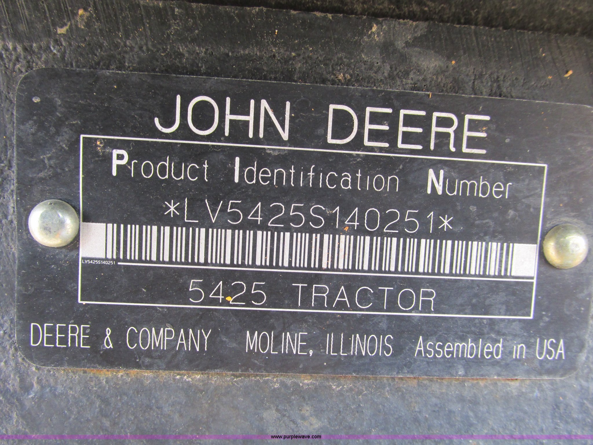 Purple Wave is selling a used Tractor in Missouri. This item is a 2005 John Deere 5425 tractor with the following: 1,246 hours on meter, John Deere 4.5L four cylinder diesel engine, Manual transmission, 9F-3R gears, Canopy, Rear auxiliary hydraulics, 7.50-16 front tires, 380/85R28 rear tires, No draw bar, Serial LV5425S140251, MODOT ID O5986