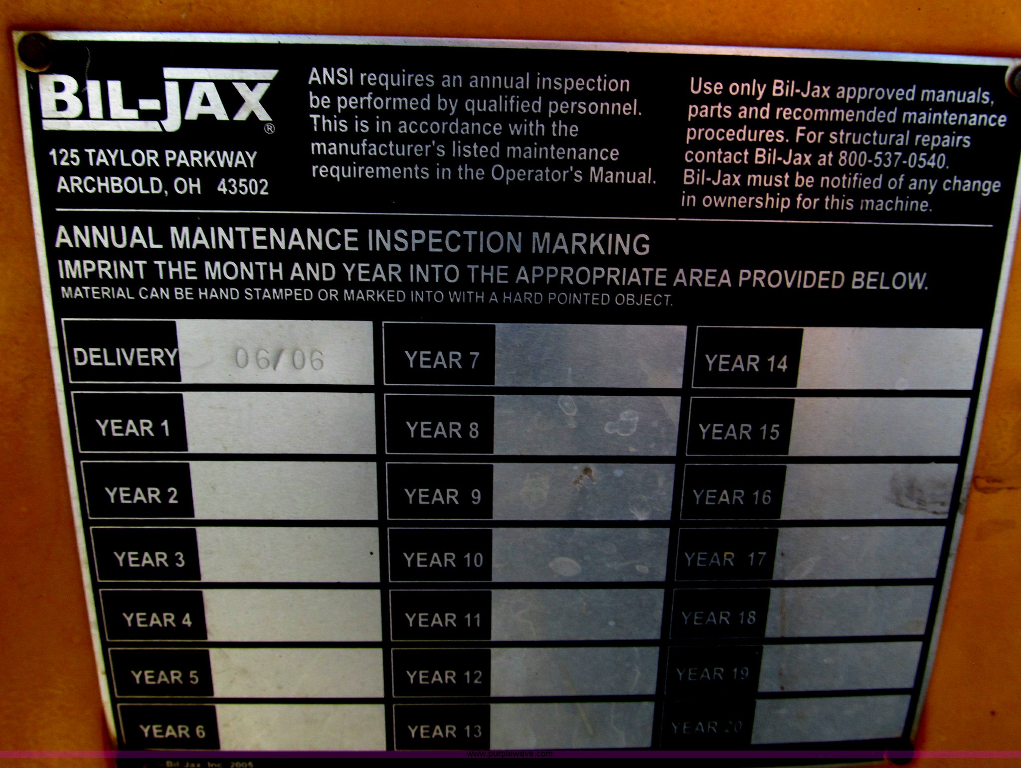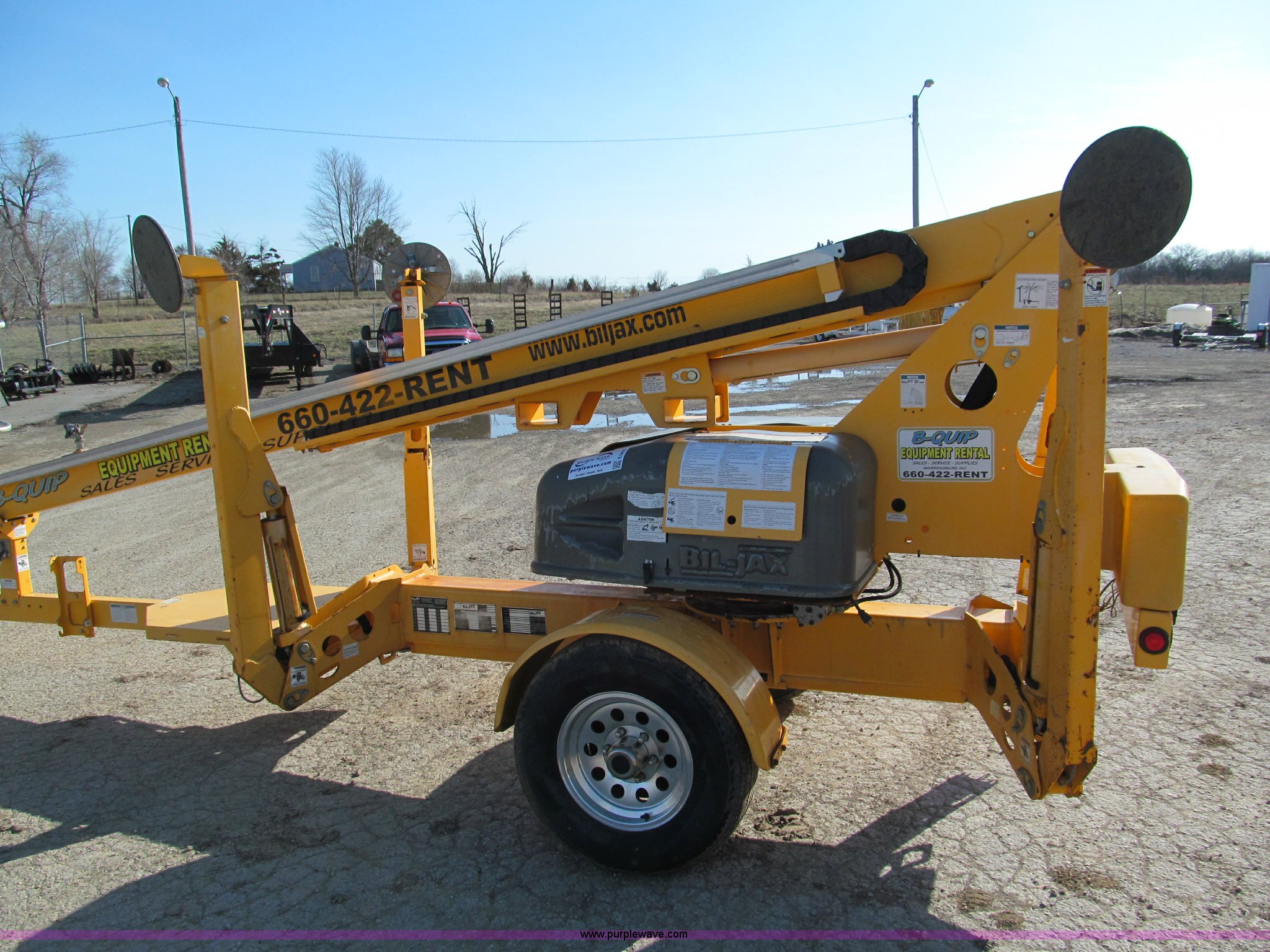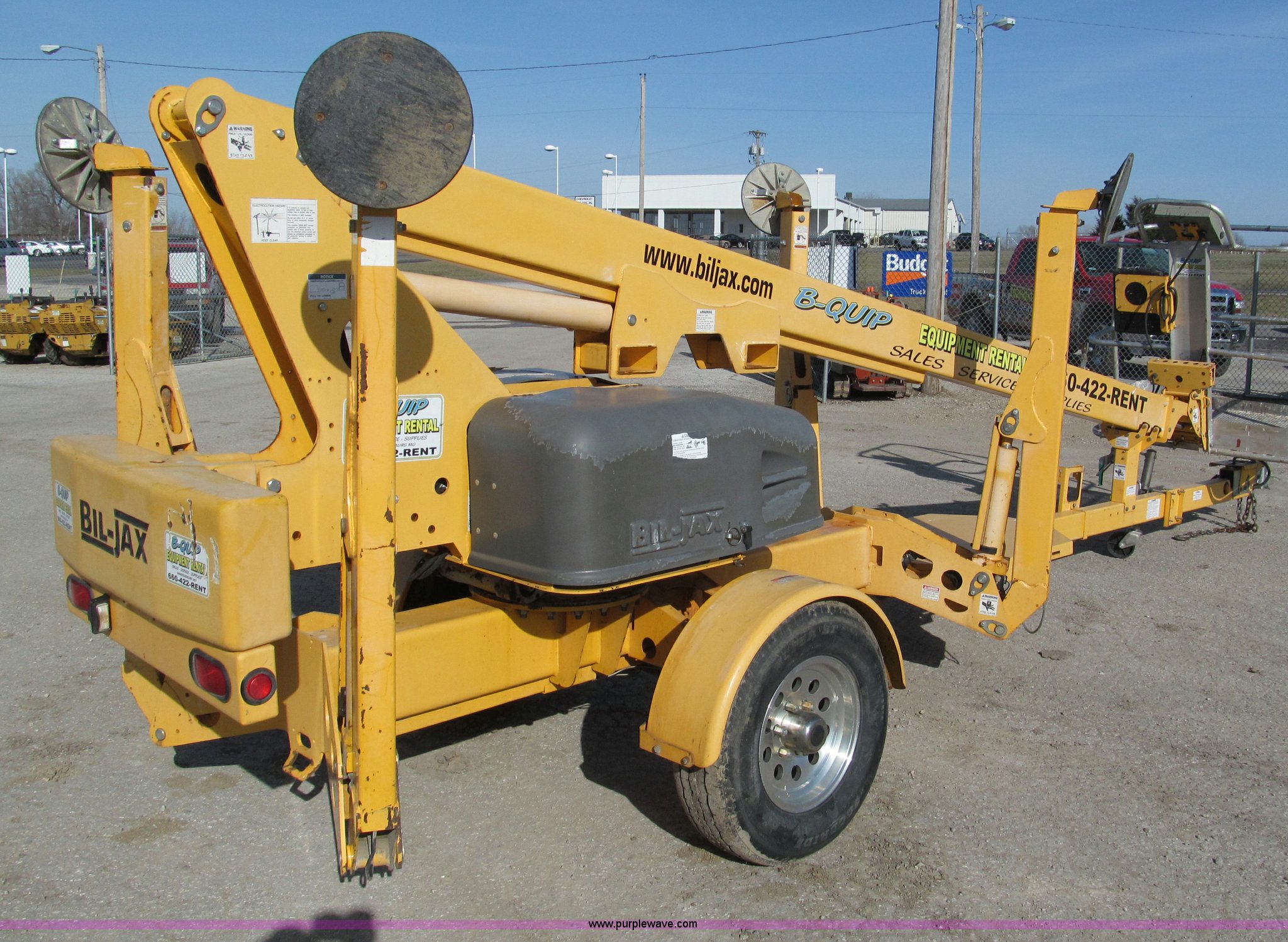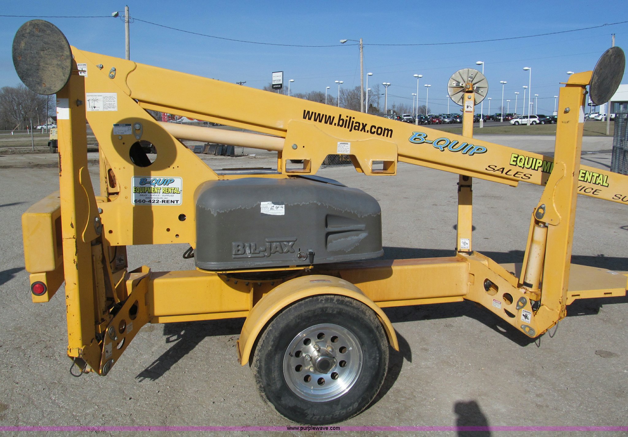 Purple Wave is selling a used Boom Lift in Missouri. This item is a 2006 Biljax 3632T towable boom with the following: 36' maximum platform height, 32' maximum platform reach, 500 lbs maximum capacity, Two person capacity, 28" x 48" platform, 24V, Auto leveling outriggers, 360 degree rotation, Upper and lower controls, Power to platform, 2" platform, Surge brakes, Aluminum wheels, 225/75R15 tires, GVWR 5,240 lbs, Recently replaced electric motor and hydraulic pump, Serial 36T0600338