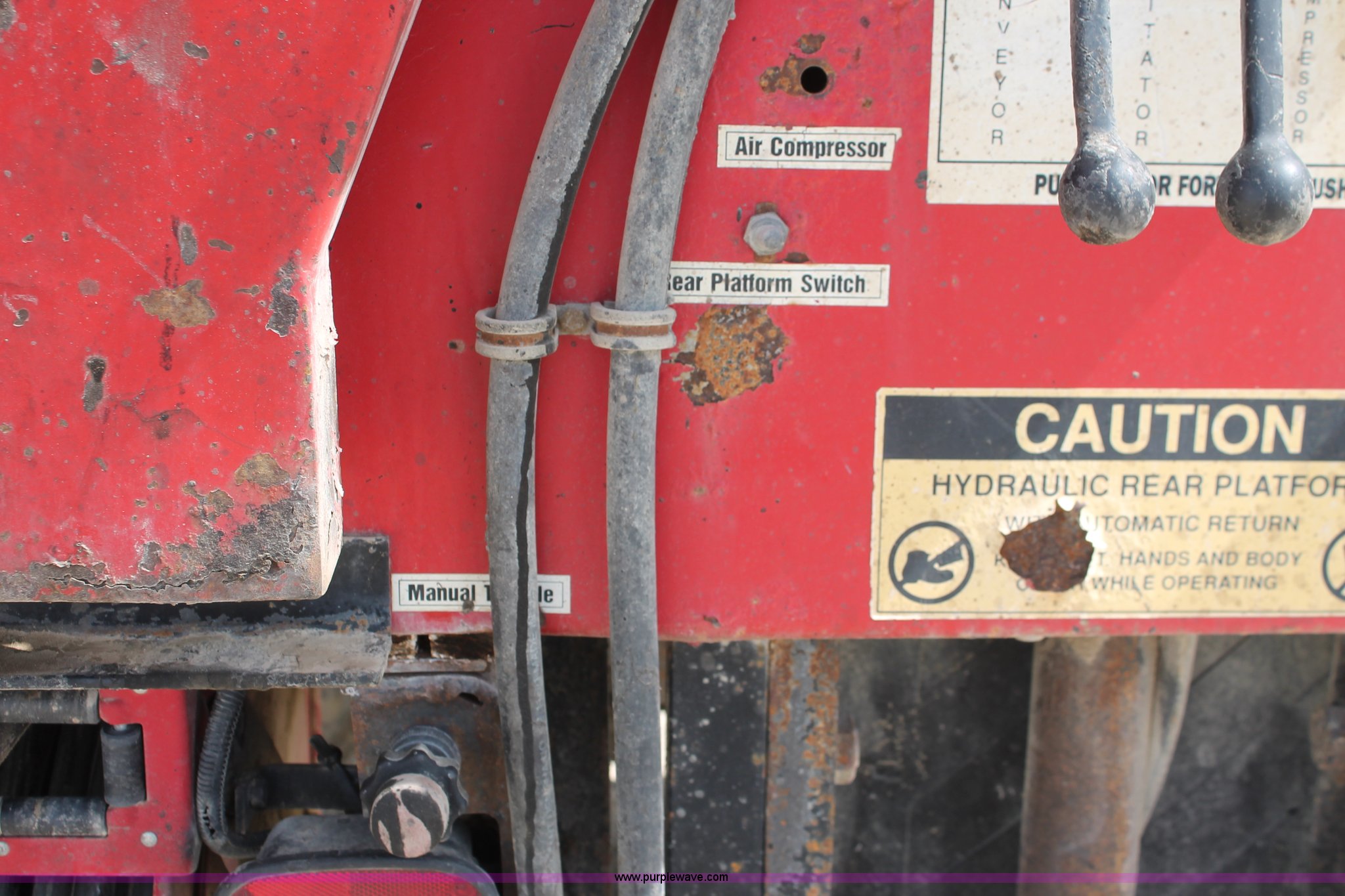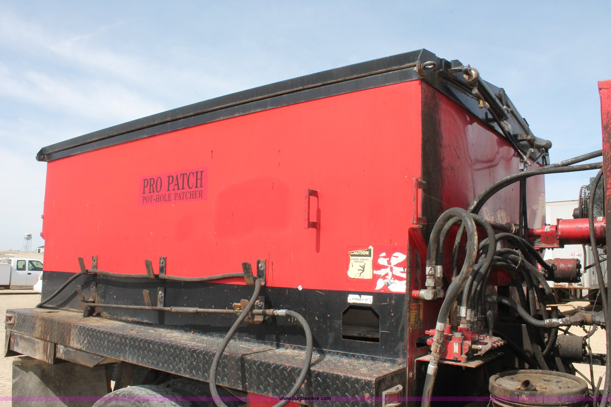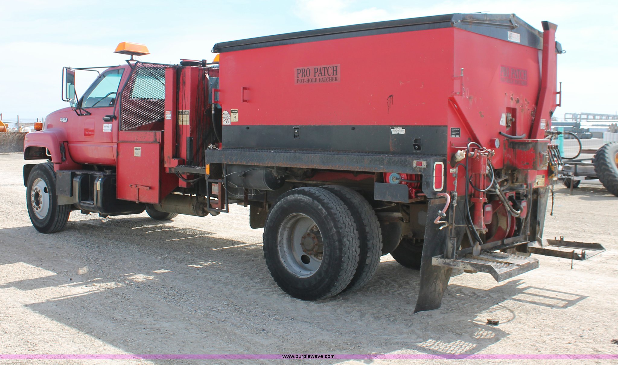 Purple Wave is selling a used Oil Distributor Truck in Kansas. This item is a 1995 GMC TopKick pothole patch truck with the following: 73,309 miles on odometer, Caterpillar 3116 6.6L six cylinder diesel engine, 215 HP, Automatic transmission, AC and heat, AM/FM, PTO, 50 gallon fuel tank, Pro patch pothole patcher bed, Model 415-160, Serial 0287-0CW, IMT 1143 hydraulic air compressor