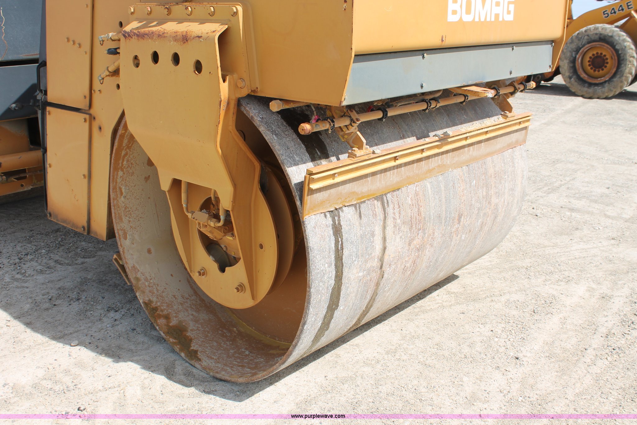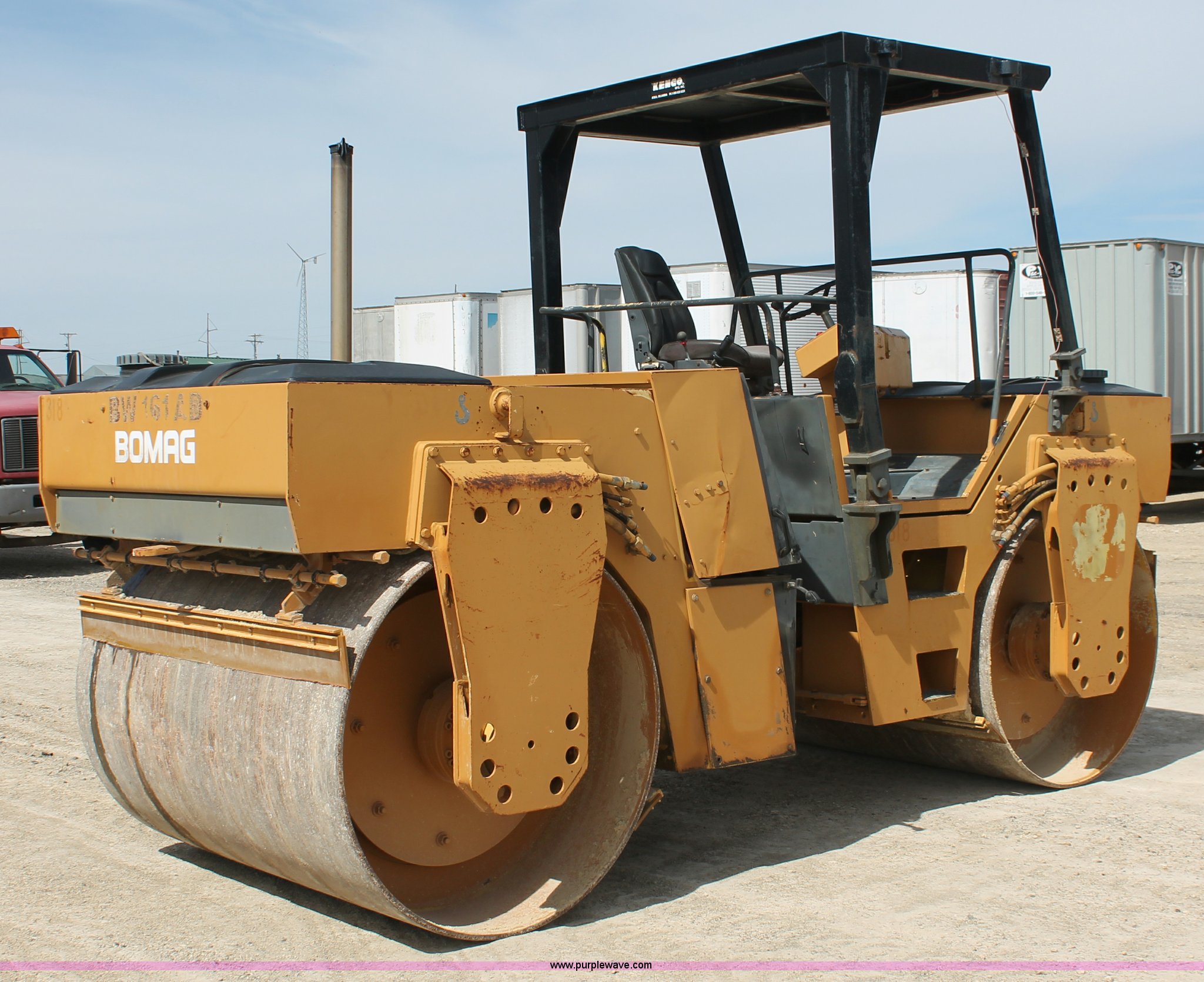 Purple Wave is selling a used Double Drum Roller Compactor in Kansas. This item is a 1991 Bomag BW161AD double drum roller with the following: 2,128 hours on meter, Deutz four cylinder diesel engine, 100 HP, Hydrostatic transmission, 66"W rollers, Canopy, Water tank, Spray bar, 9,098 lbs. base operating weight, Serial 109640500104