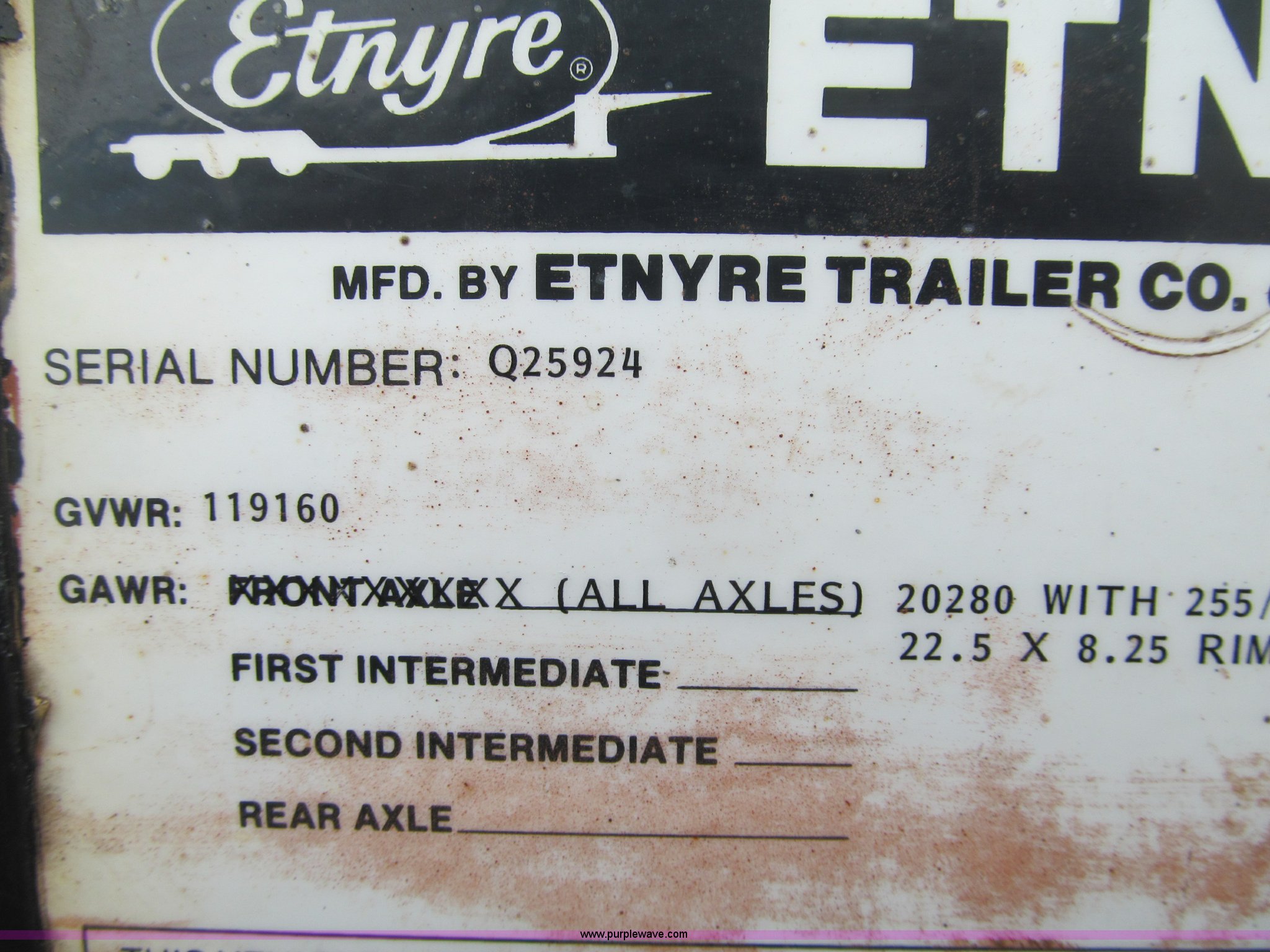 Purple Wave is selling a used Equip. Trailer in Wisconsin. This item is a 1996 Etnyre triple axle lowboy trailer with the following: Model PRTN50T03-T1, 24' well, 102"W, Wood deck, Outriggers, Honda gas engine, Electric start, Spare tire, Air grakes, 255/70R22.5 tires, GVWR 119,160 lbs