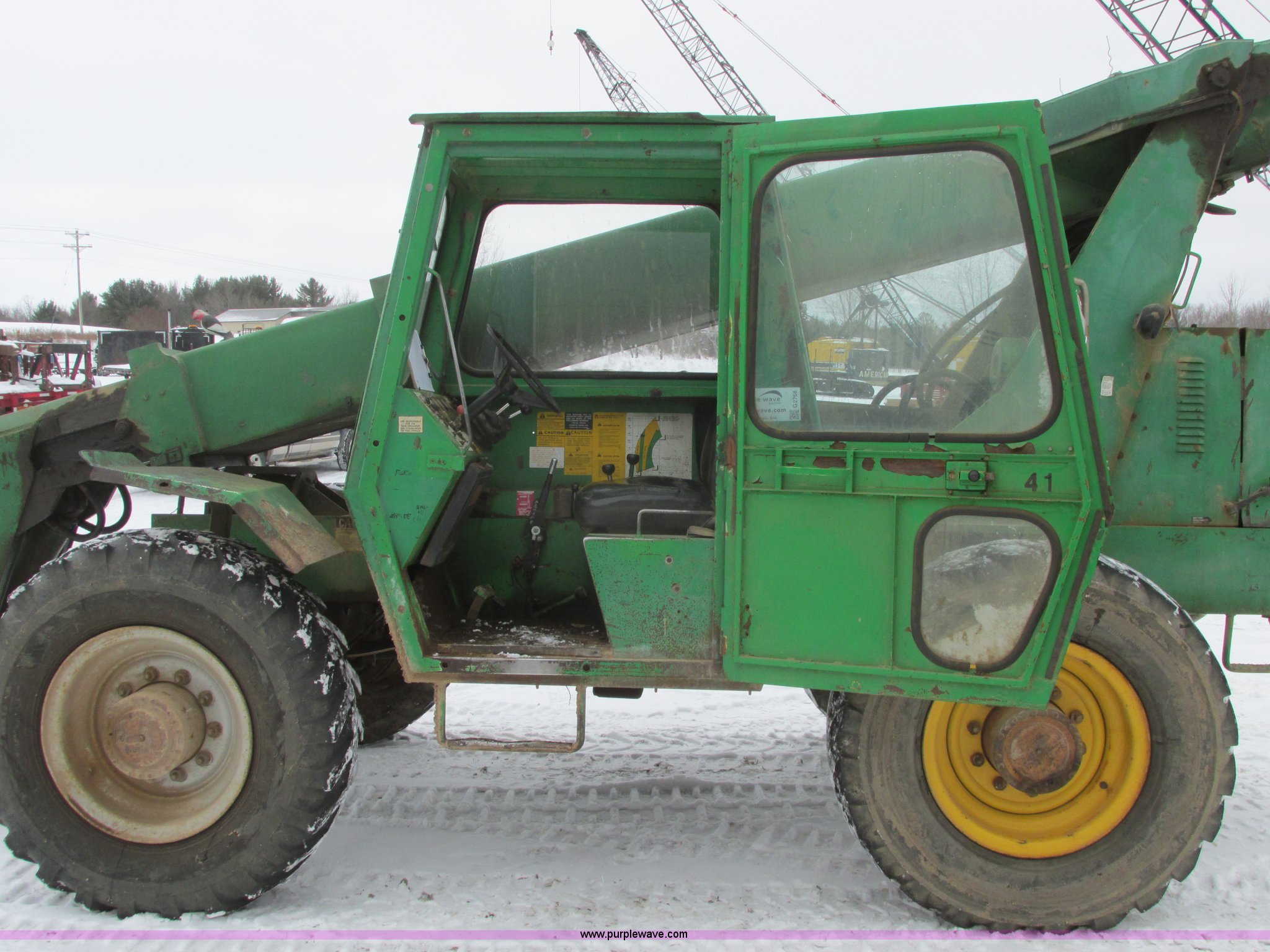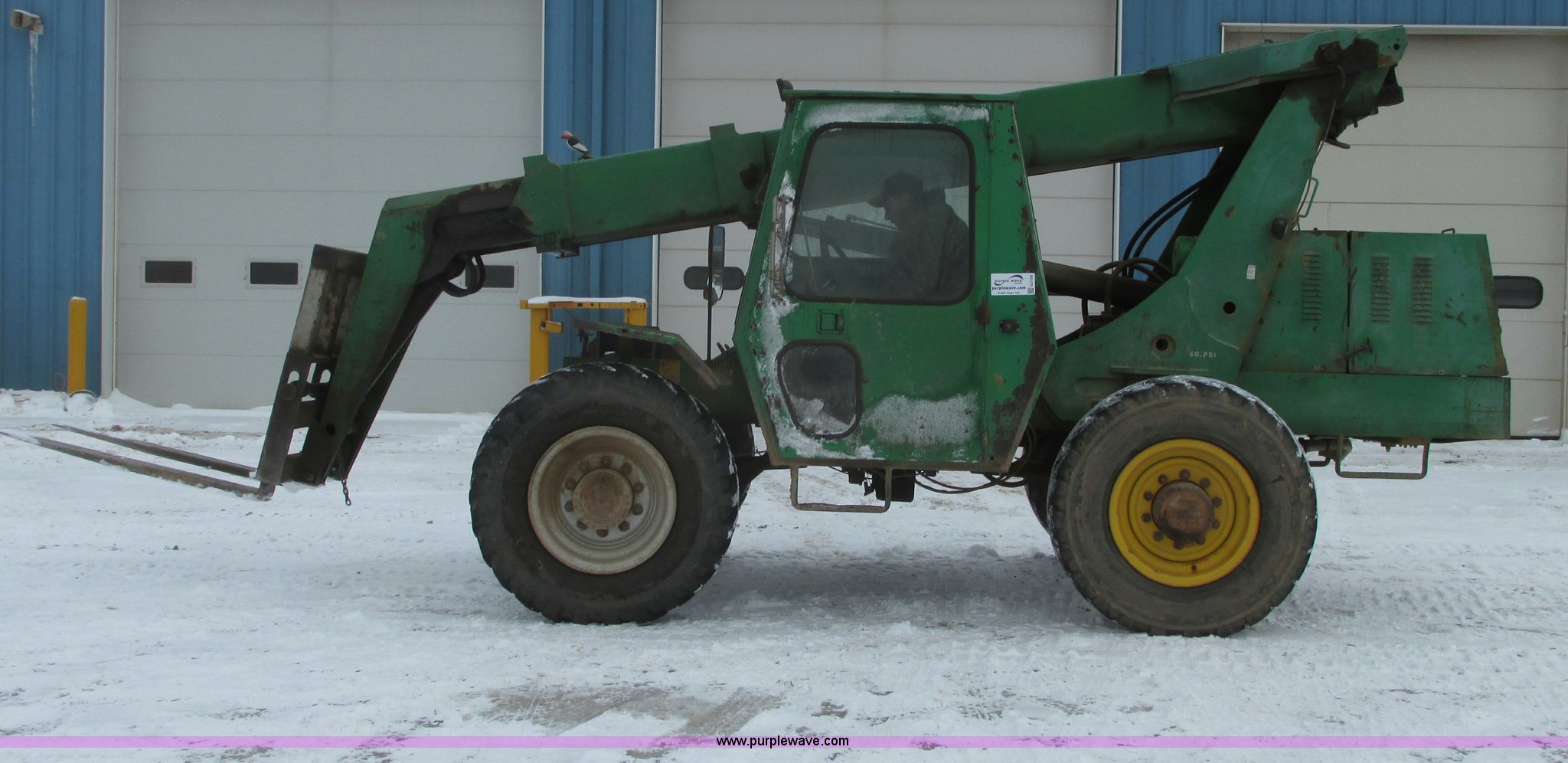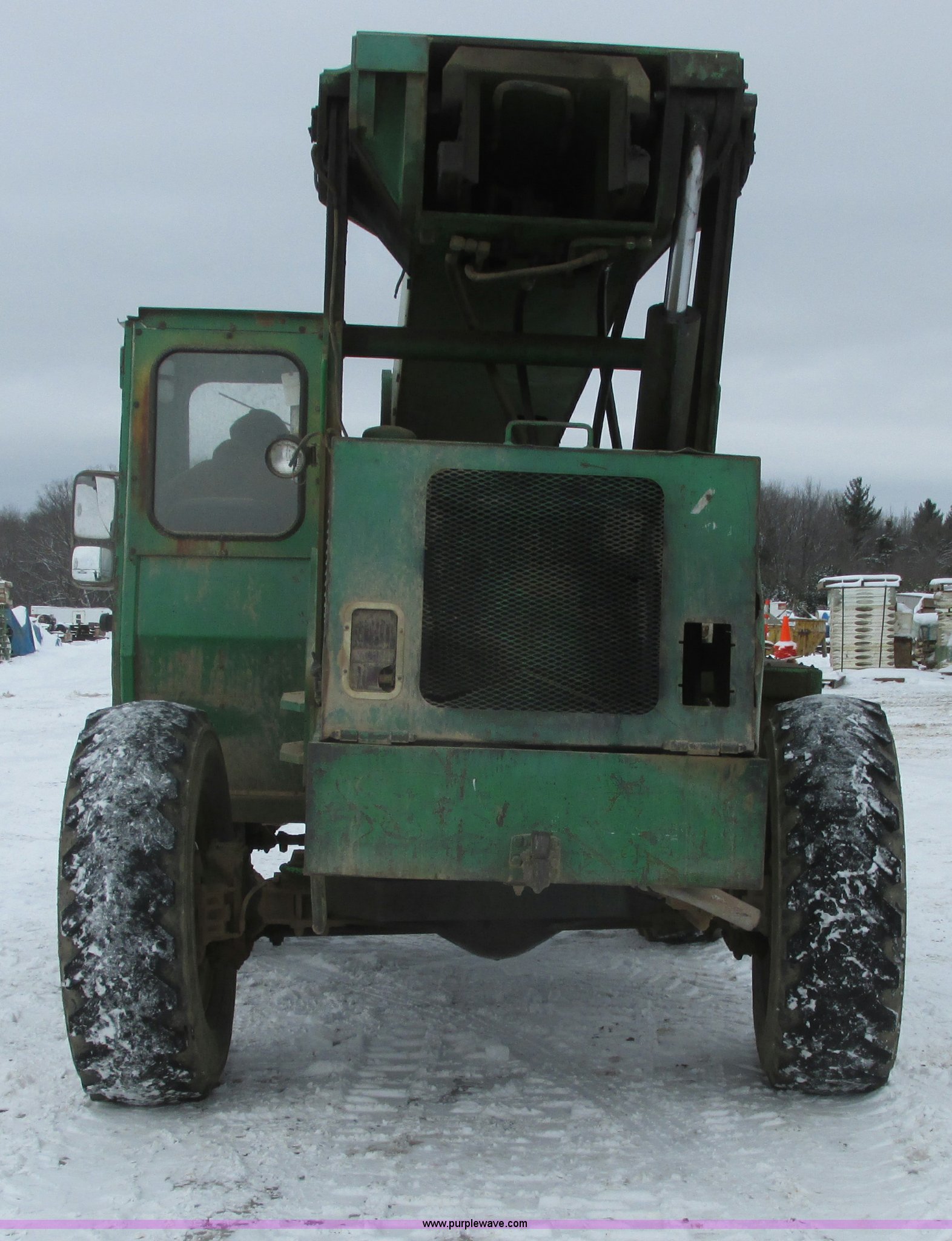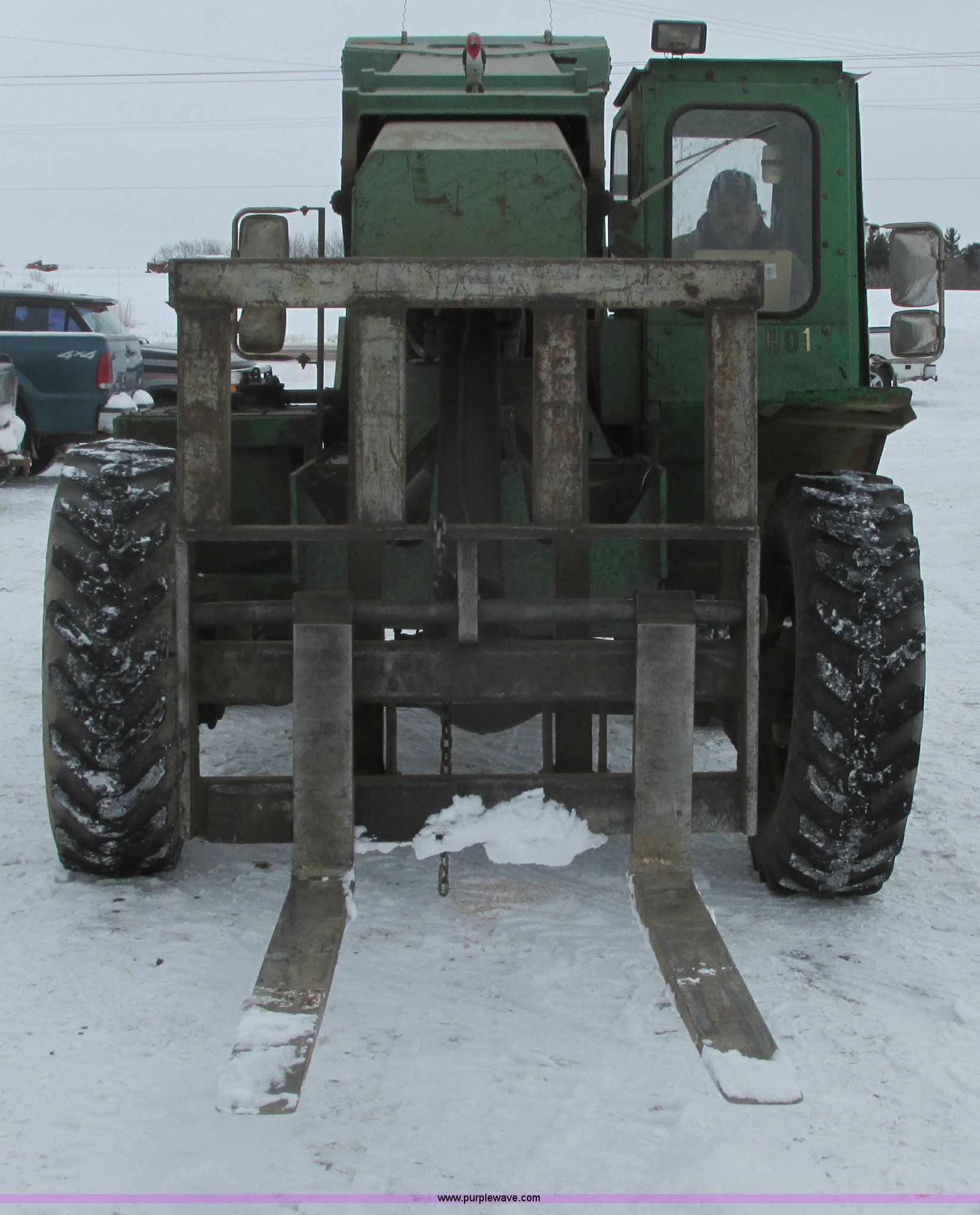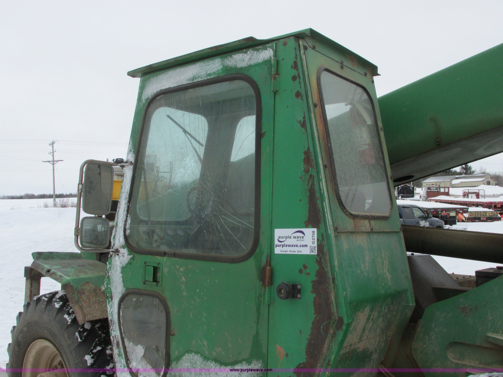 Purple Wave is selling a used Telehandler in Wisconsin. This item is a Dynalift D4P60 telehandler with the following: 2,363 hours on meter, John Deere four cylinder diesel engine, Powershift transmission, 3F-3R, Four wheel drive, Crab steer, Circle steer, Enclosed cab, 6,000 lb lift capacity, 36'L reach, (2) boom sections, 48"L forks, Hydraulic leveling, 48"W carriage, 13.00-24 fluid filled tires, 21,300 lbs. base operating weight, Hydraulic pump replaced two years ago, Main extension cylinder has a bond in it that causes it to leak, Door glass broken, Heat inoperable, Lights inoperable, Serial JD091190