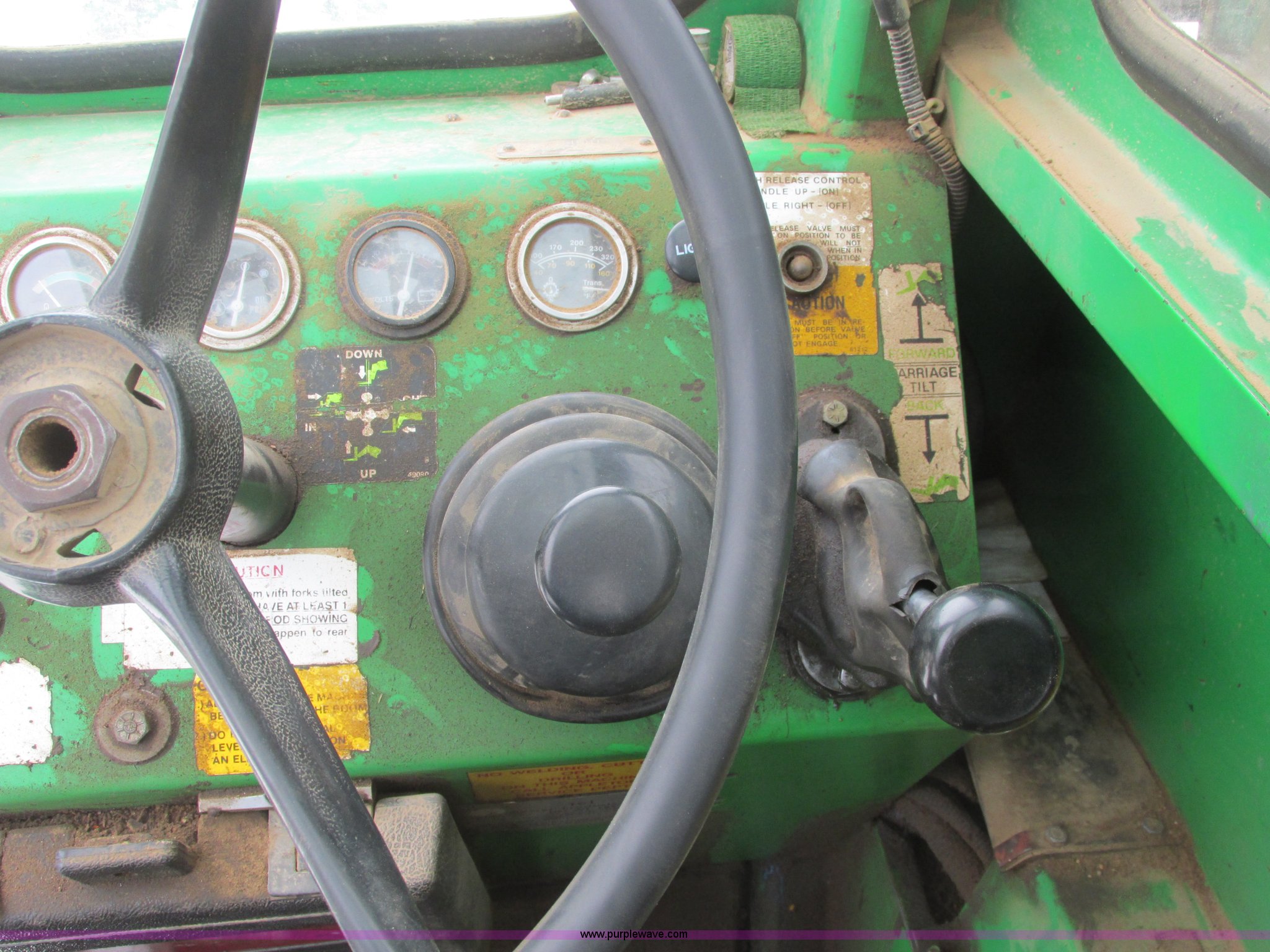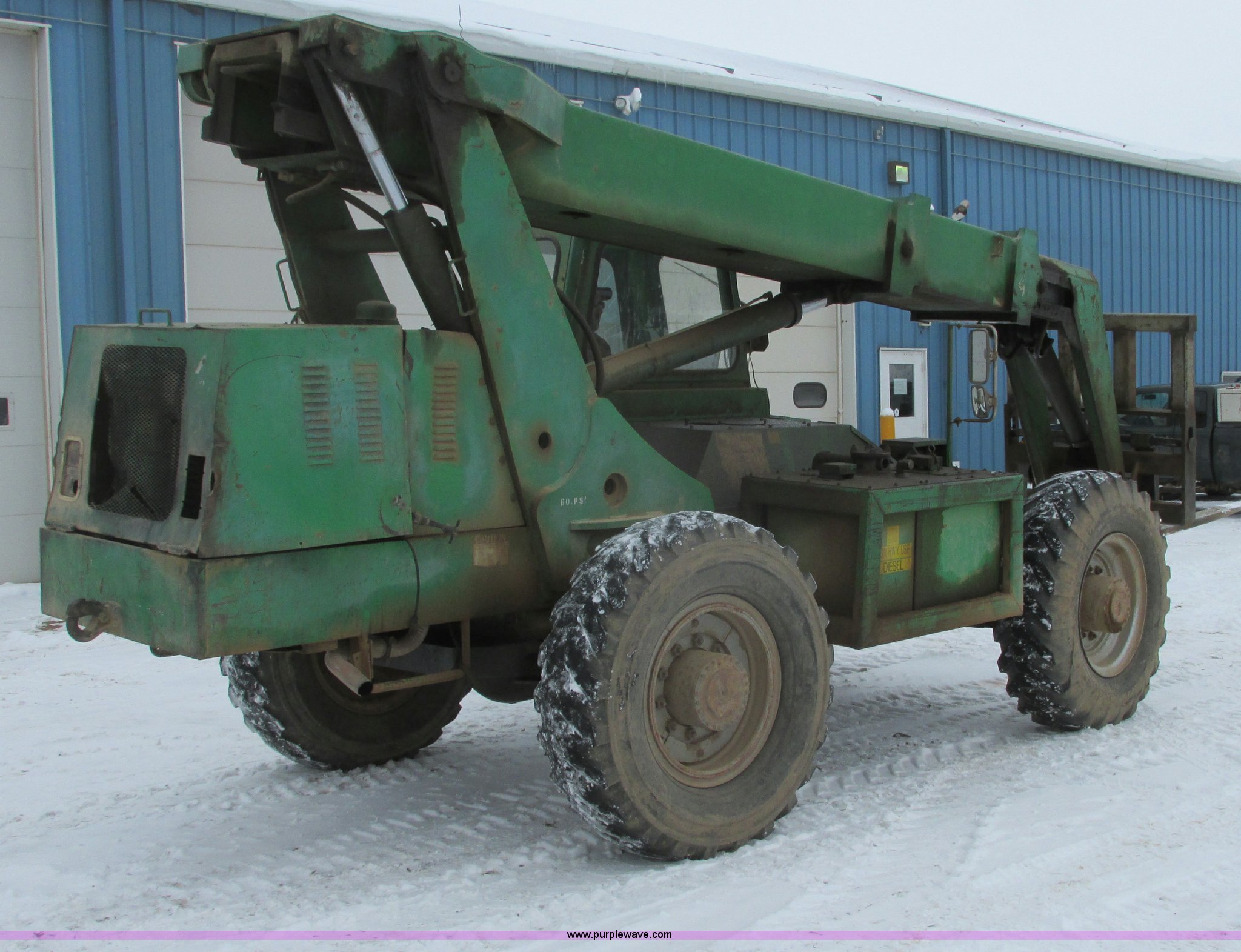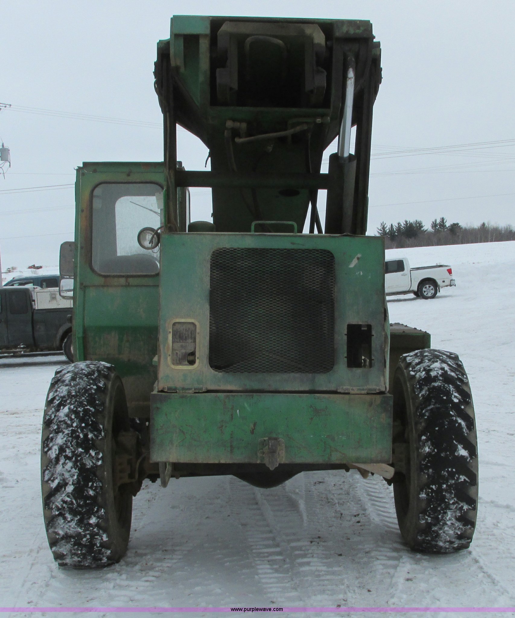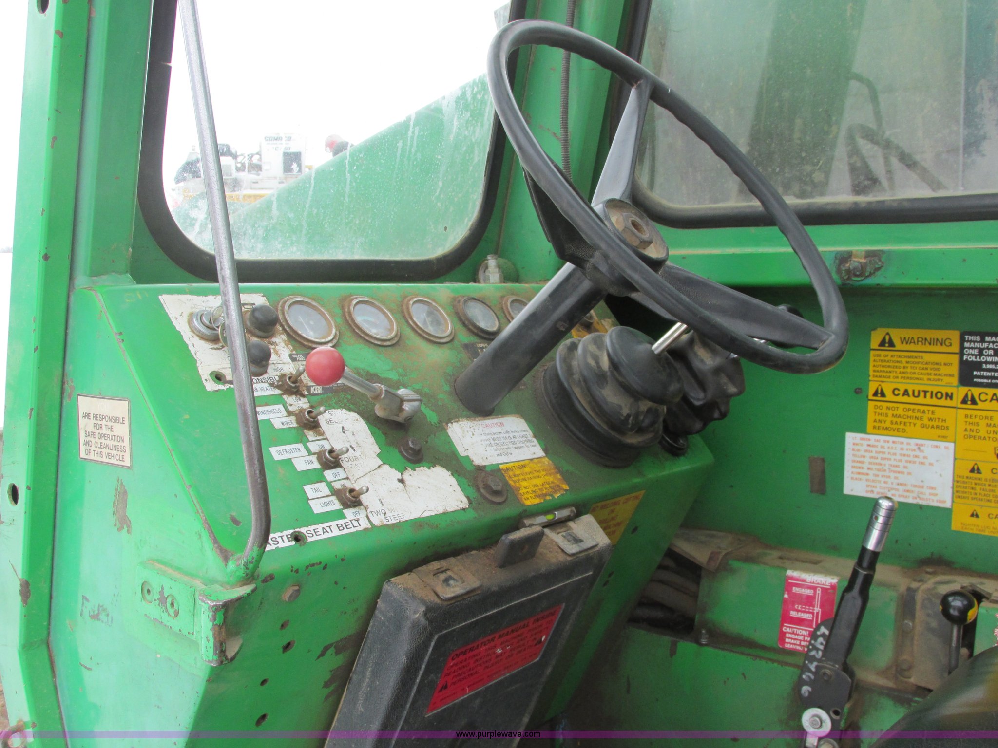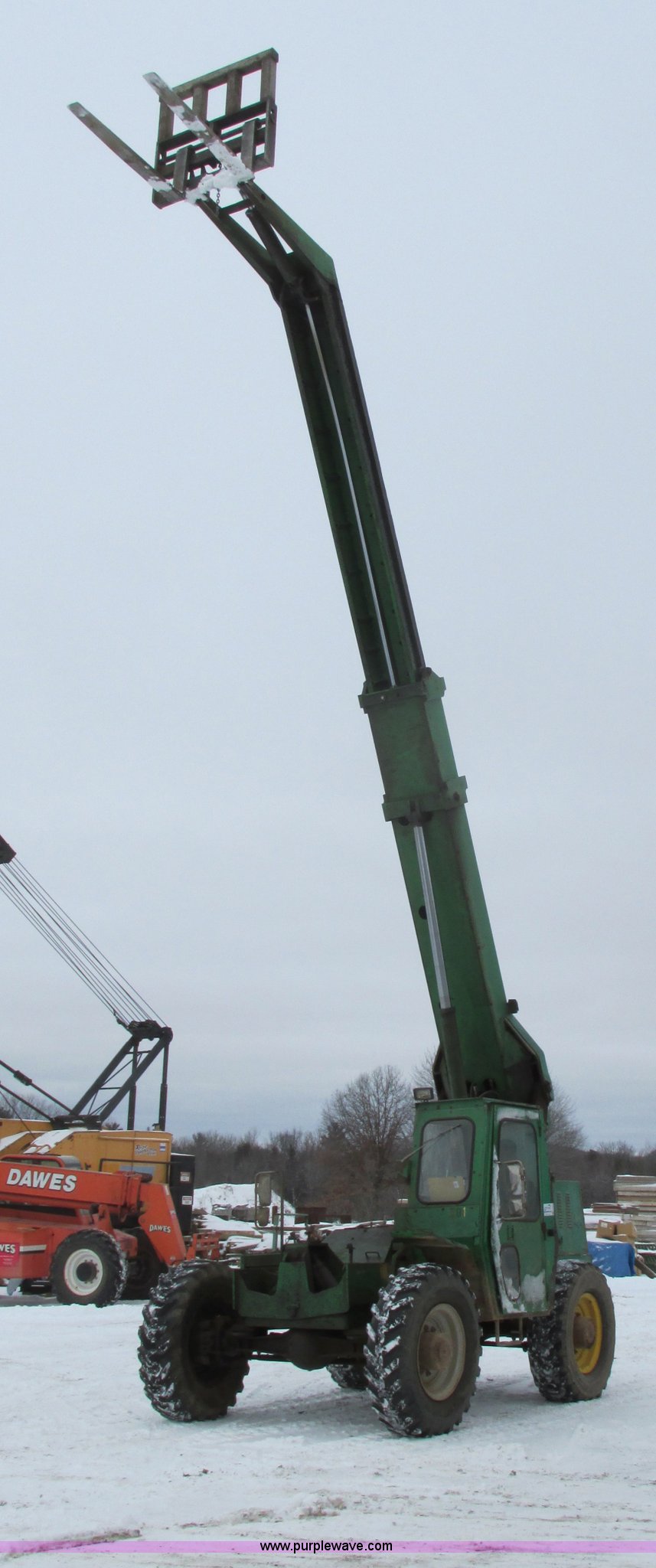 Purple Wave is selling a used Telehandler in Wisconsin. This item is a Dynalift D4P60 telehandler with the following: 2,363 hours on meter, John Deere four cylinder diesel engine, Powershift transmission, 3F-3R, Four wheel drive, Crab steer, Circle steer, Enclosed cab, 6,000 lb lift capacity, 36'L reach, (2) boom sections, 48"L forks, Hydraulic leveling, 48"W carriage, 13.00-24 fluid filled tires, 21,300 lbs. base operating weight, Hydraulic pump replaced two years ago, Main extension cylinder has a bond in it that causes it to leak, Door glass broken, Heat inoperable, Lights inoperable, Serial JD091190