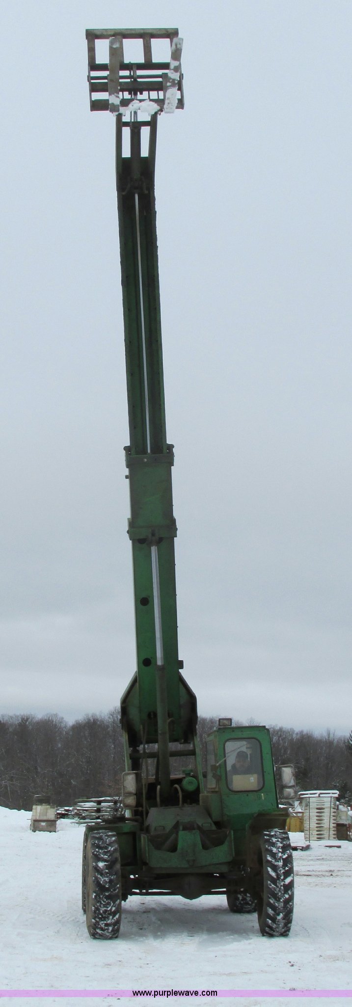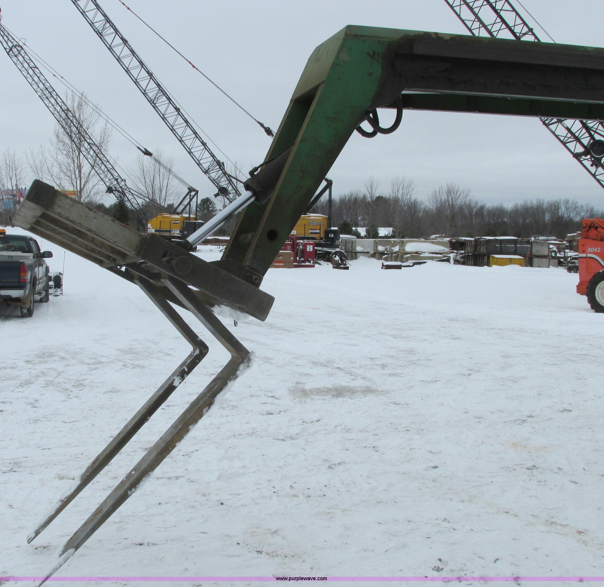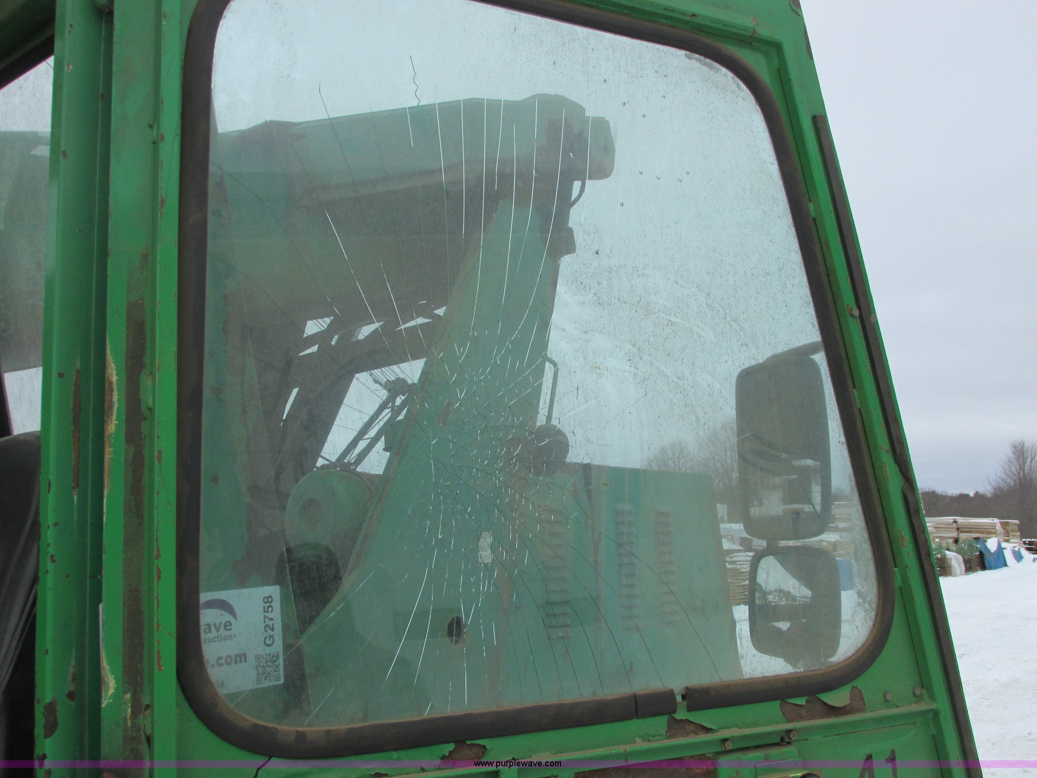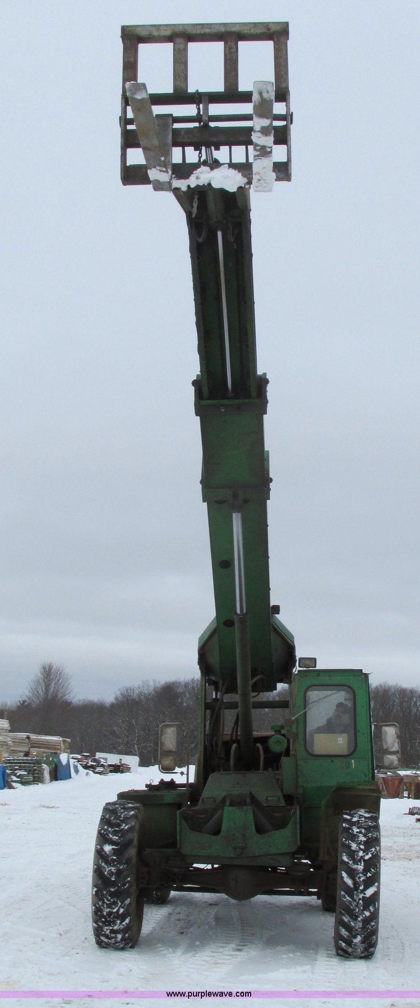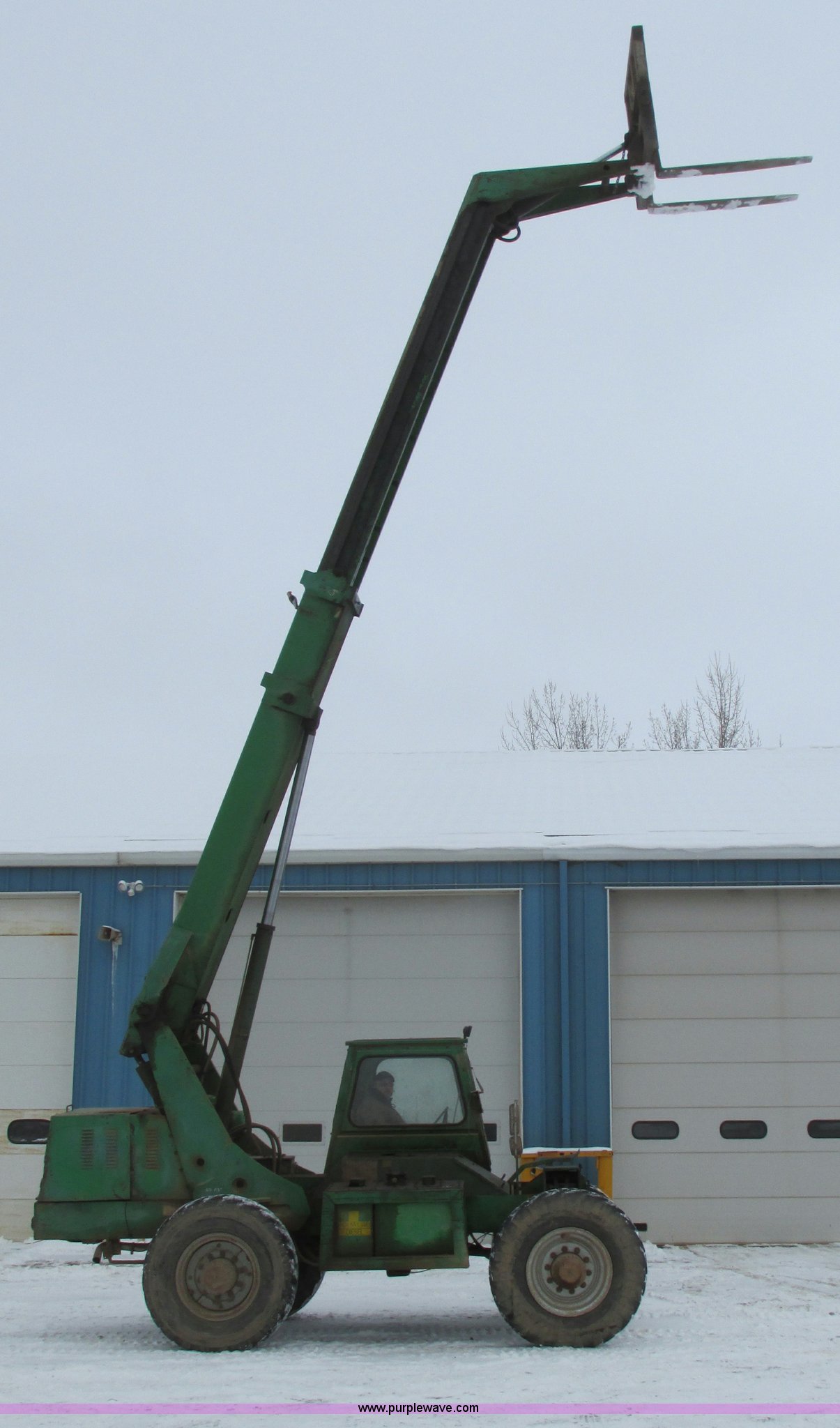 Purple Wave is selling a used Telehandler in Wisconsin. This item is a Dynalift D4P60 telehandler with the following: 2,363 hours on meter, John Deere four cylinder diesel engine, Powershift transmission, 3F-3R, Four wheel drive, Crab steer, Circle steer, Enclosed cab, 6,000 lb lift capacity, 36'L reach, (2) boom sections, 48"L forks, Hydraulic leveling, 48"W carriage, 13.00-24 fluid filled tires, 21,300 lbs. base operating weight, Hydraulic pump replaced two years ago, Main extension cylinder has a bond in it that causes it to leak, Door glass broken, Heat inoperable, Lights inoperable, Serial JD091190