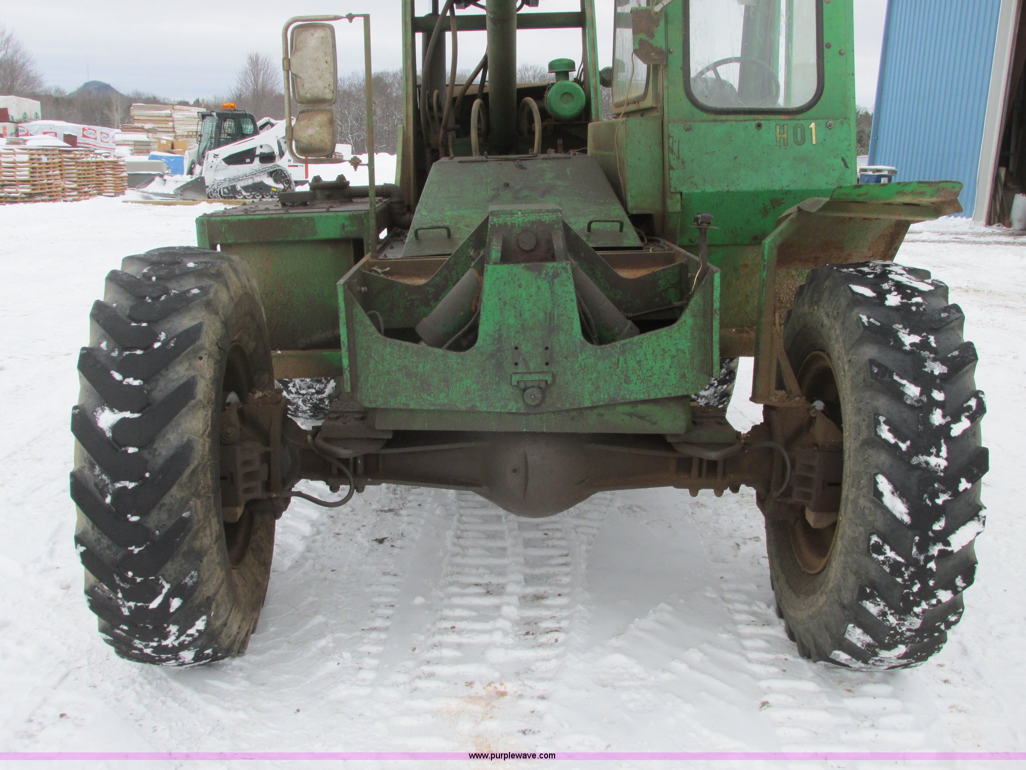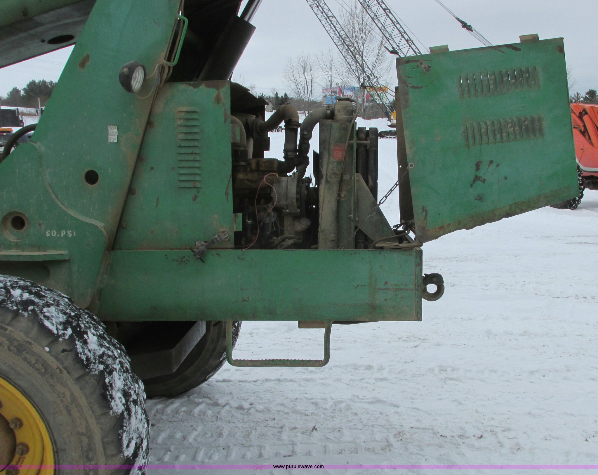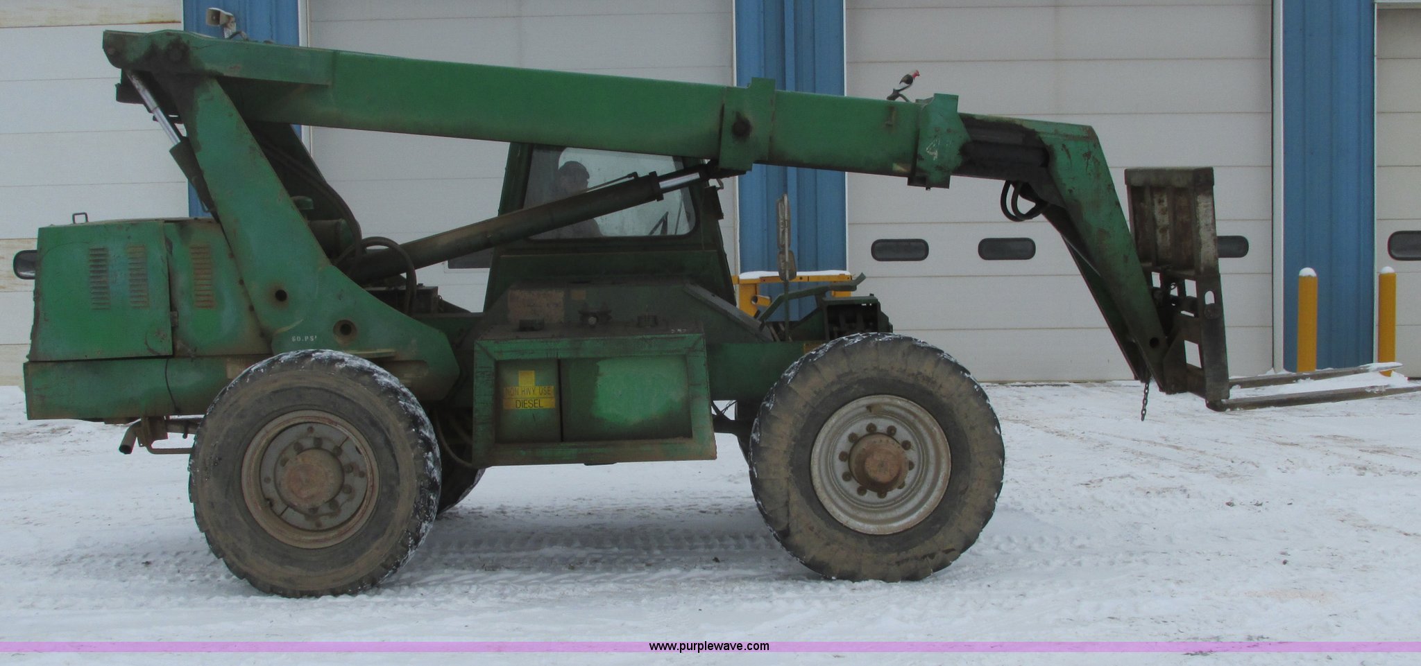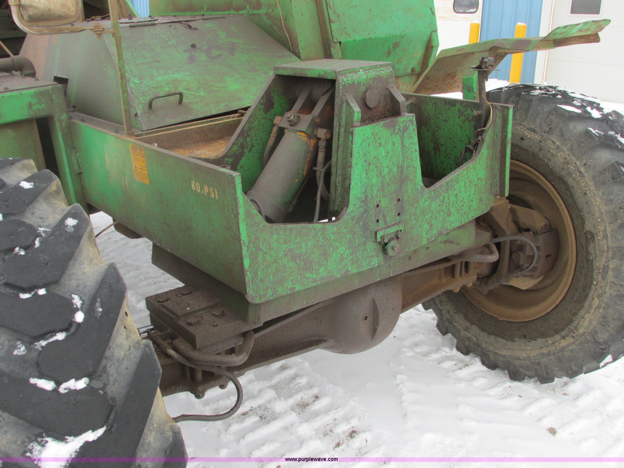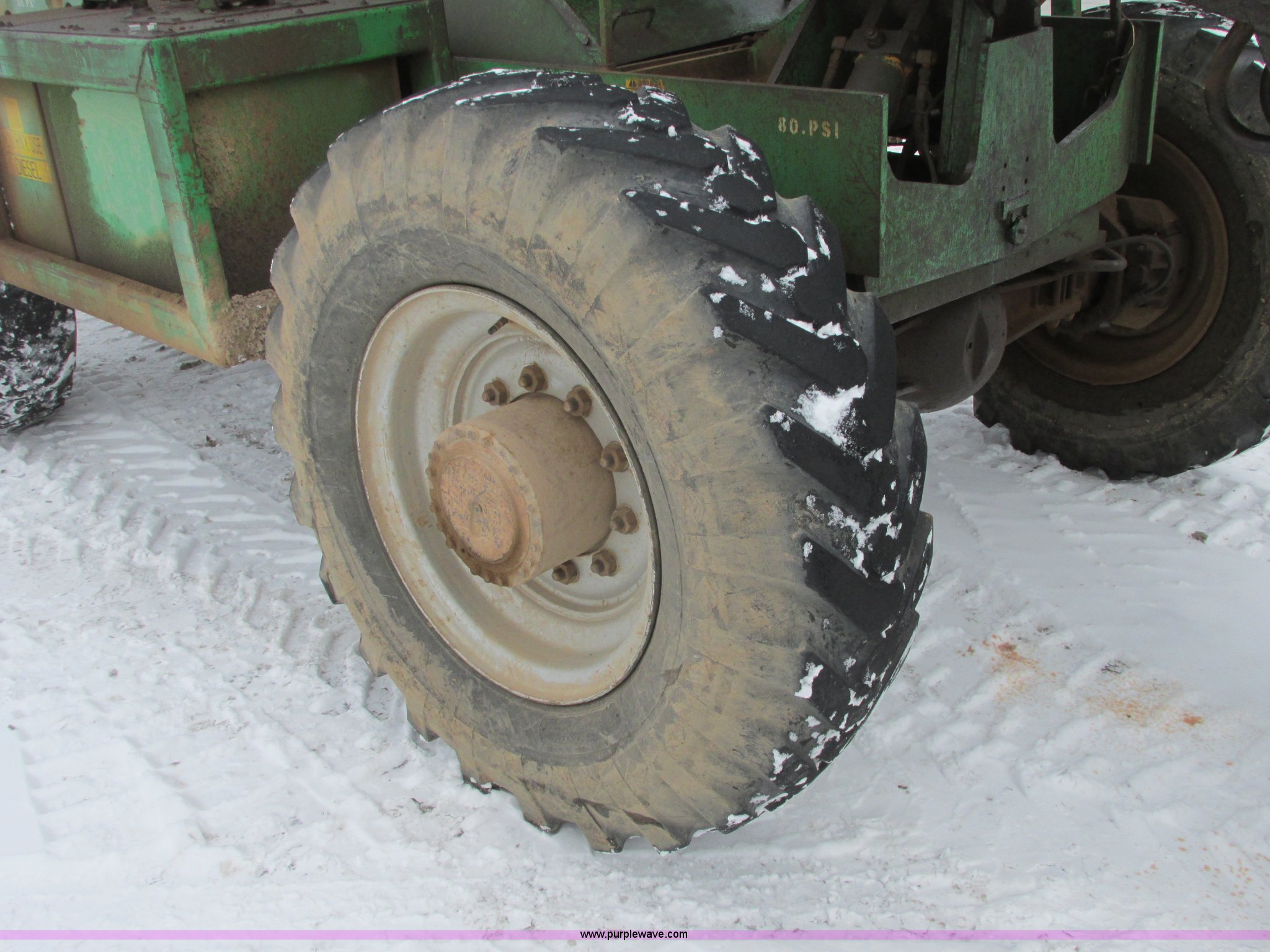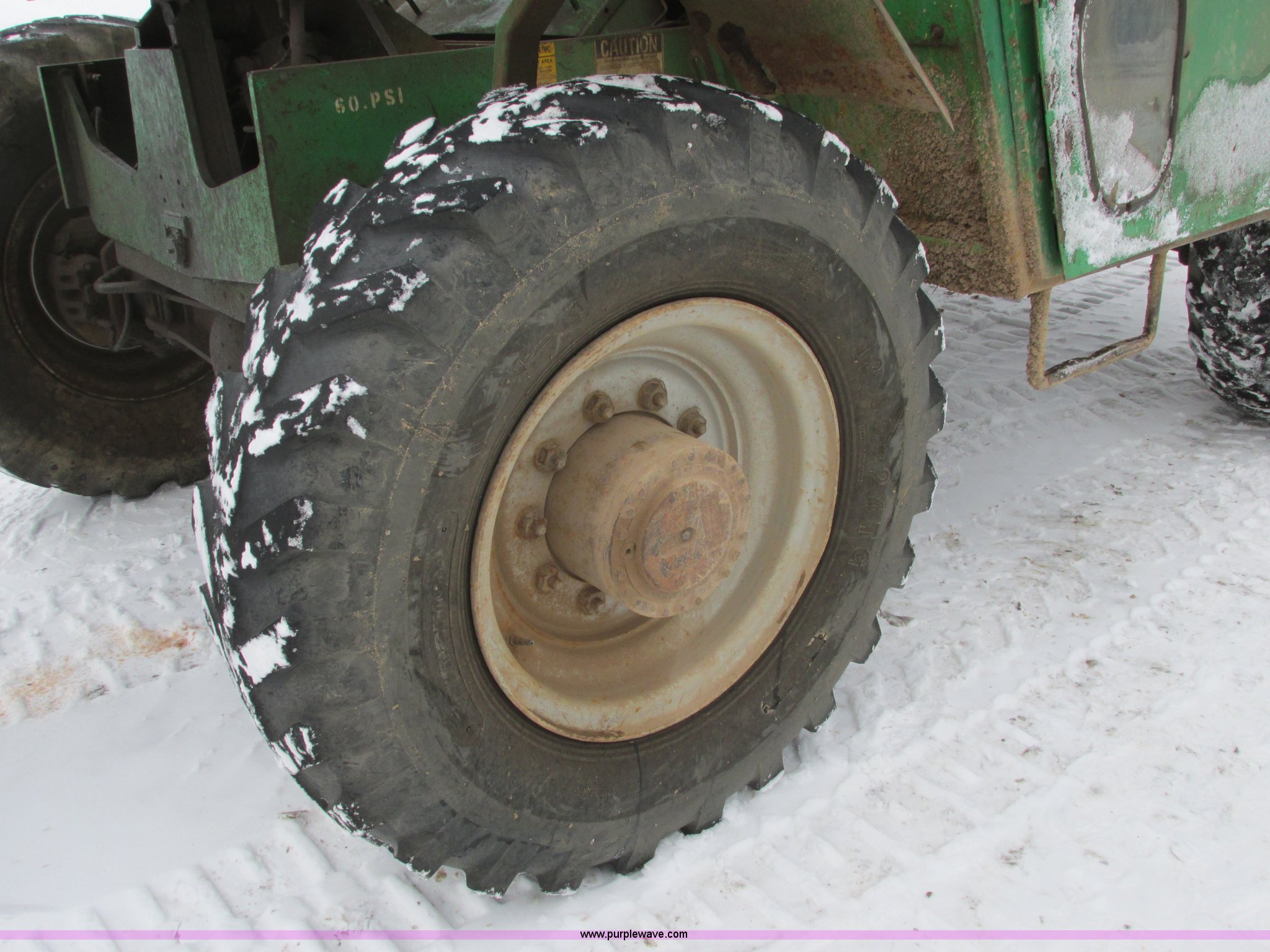 Purple Wave is selling a used Telehandler in Wisconsin. This item is a Dynalift D4P60 telehandler with the following: 2,363 hours on meter, John Deere four cylinder diesel engine, Powershift transmission, 3F-3R, Four wheel drive, Crab steer, Circle steer, Enclosed cab, 6,000 lb lift capacity, 36'L reach, (2) boom sections, 48"L forks, Hydraulic leveling, 48"W carriage, 13.00-24 fluid filled tires, 21,300 lbs. base operating weight, Hydraulic pump replaced two years ago, Main extension cylinder has a bond in it that causes it to leak, Door glass broken, Heat inoperable, Lights inoperable, Serial JD091190