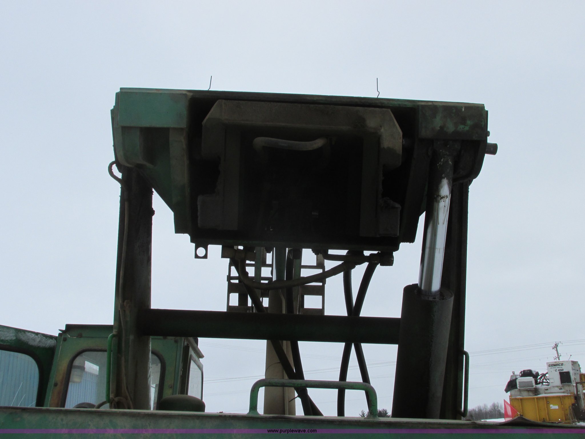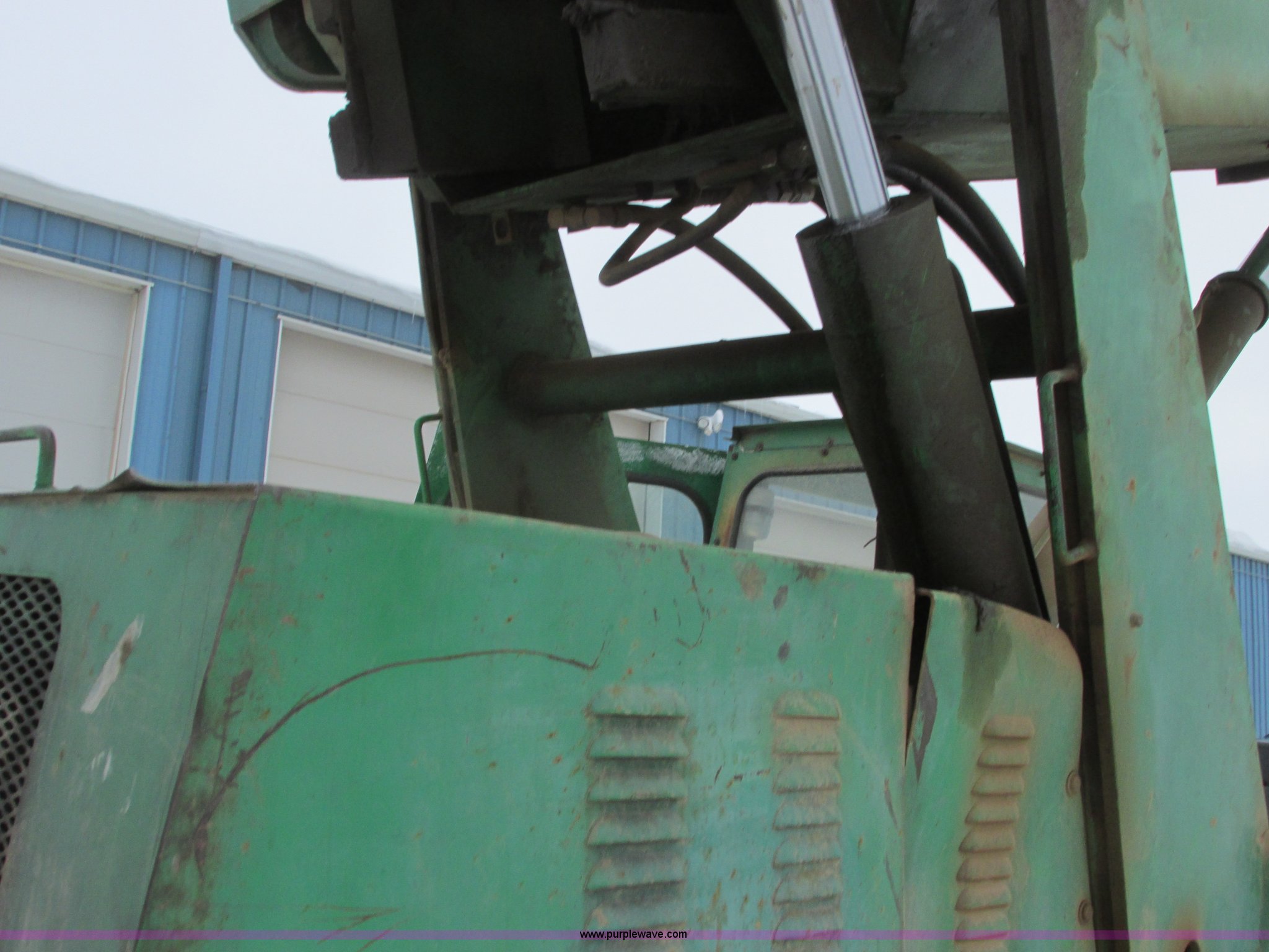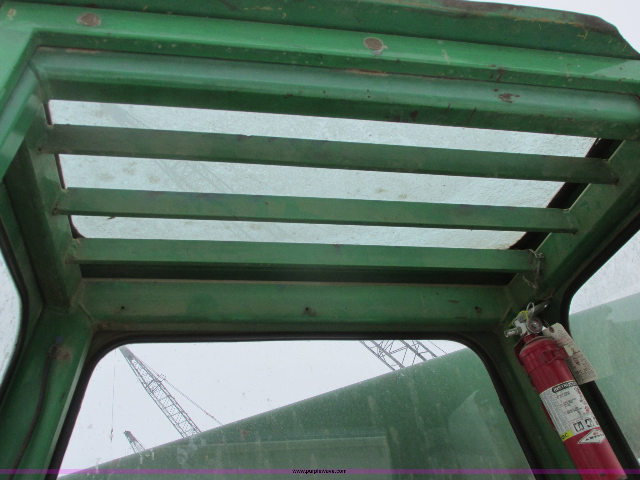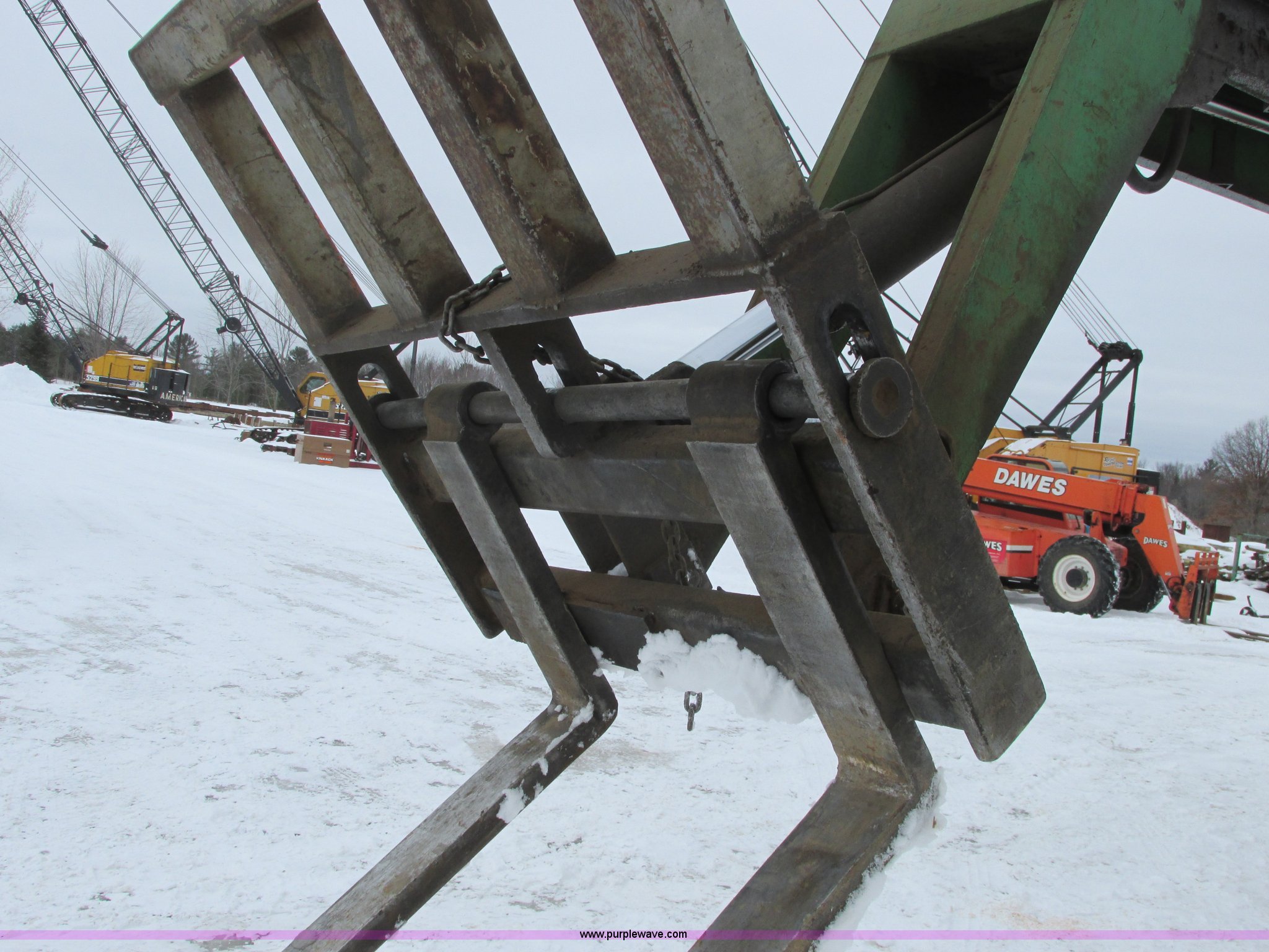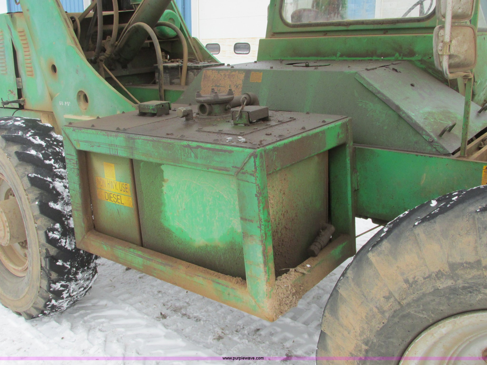 Purple Wave is selling a used Telehandler in Wisconsin. This item is a Dynalift D4P60 telehandler with the following: 2,363 hours on meter, John Deere four cylinder diesel engine, Powershift transmission, 3F-3R, Four wheel drive, Crab steer, Circle steer, Enclosed cab, 6,000 lb lift capacity, 36'L reach, (2) boom sections, 48"L forks, Hydraulic leveling, 48"W carriage, 13.00-24 fluid filled tires, 21,300 lbs. base operating weight, Hydraulic pump replaced two years ago, Main extension cylinder has a bond in it that causes it to leak, Door glass broken, Heat inoperable, Lights inoperable, Serial JD091190