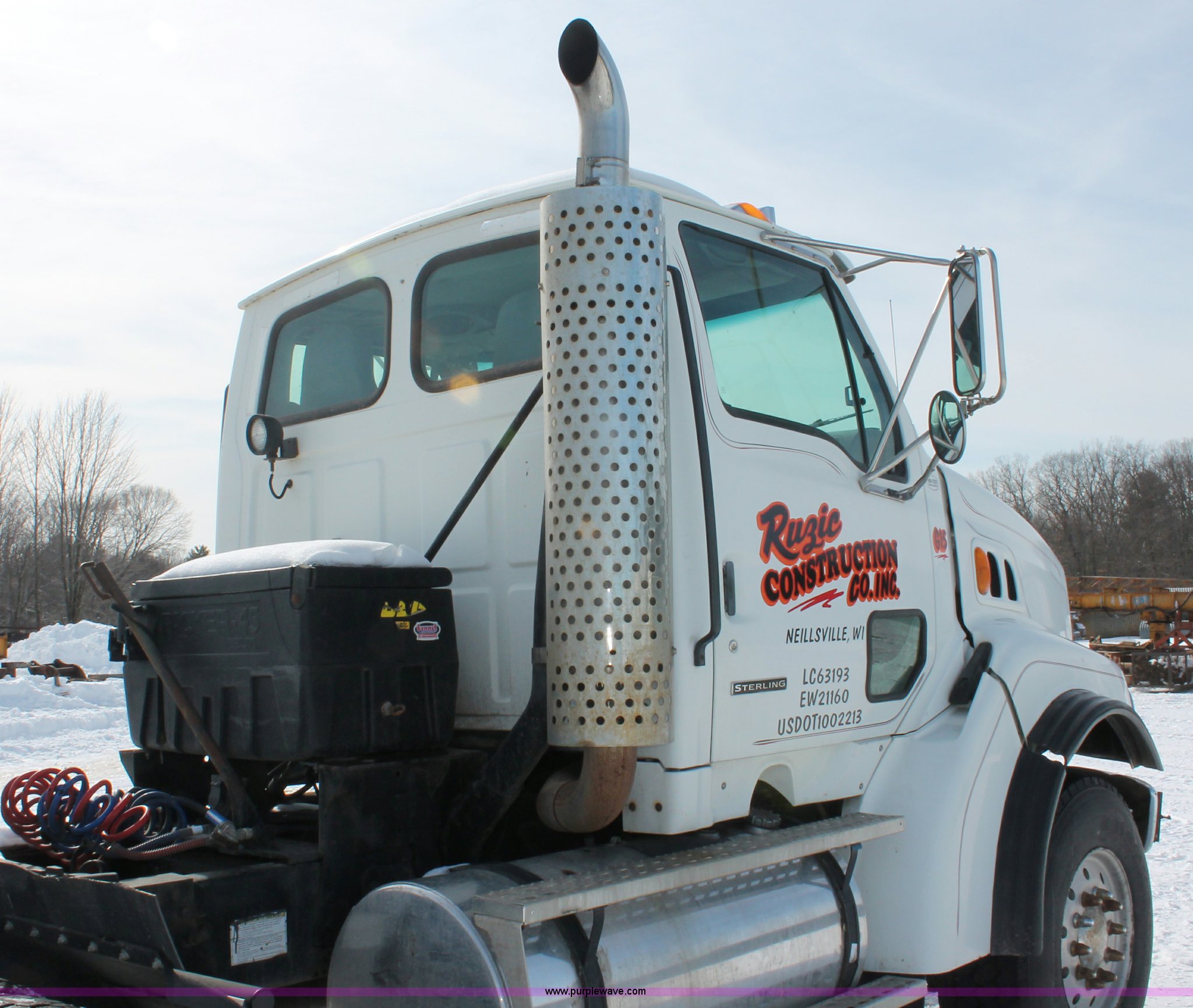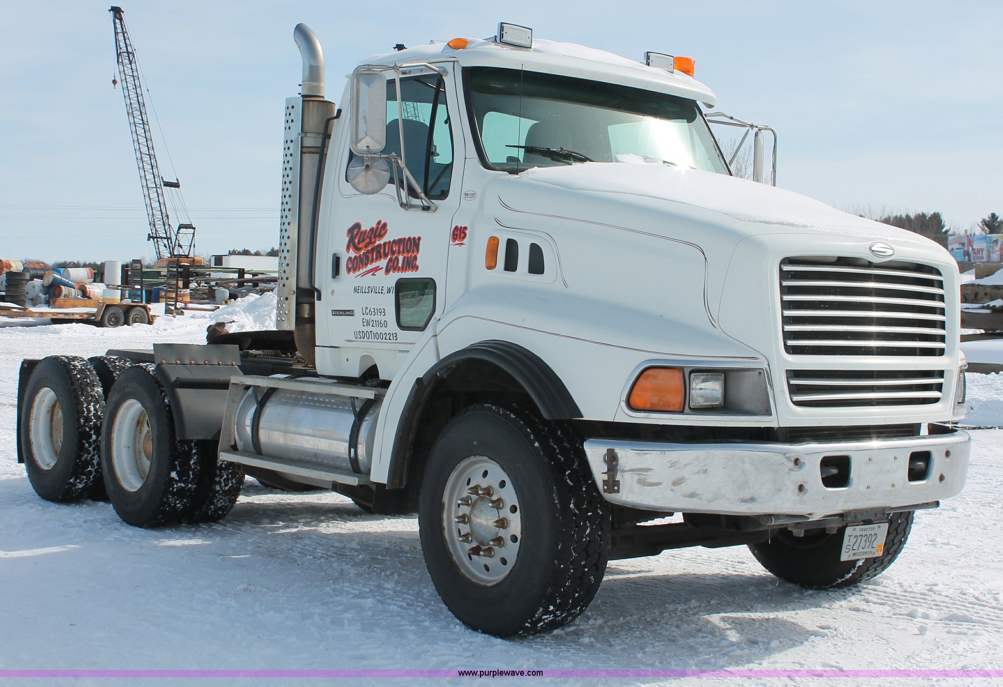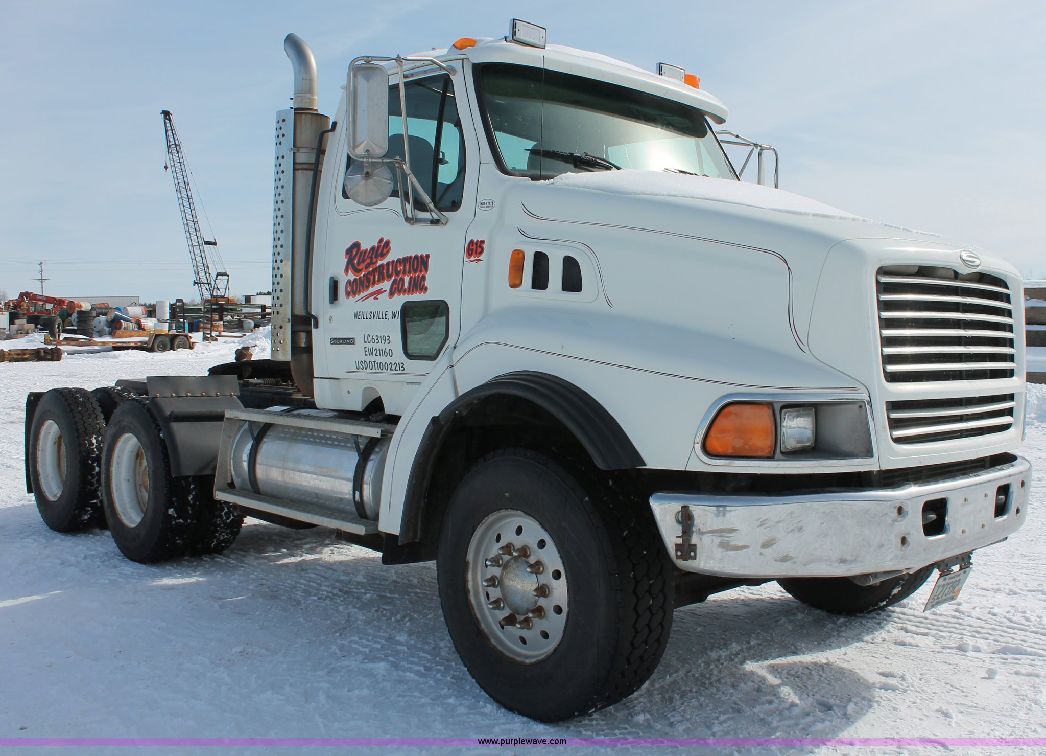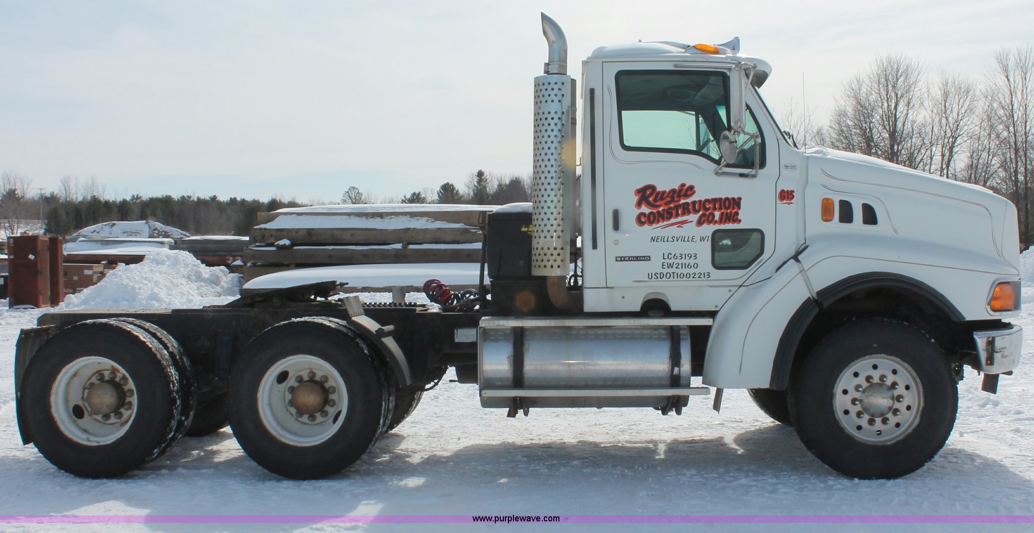 Purple Wave is selling a used Truck Tractor in Wisconsin. This item is a 2000 Sterling LT9522 semi truck with the following: 419,697 actual miles, Caterpillar 3406E 14.6L L6 diesel engine, 425 HP, Eaton Fuller 13 speed manual transmission, AC and heat, Tilt, Cruise, AM/FM/cassette, Passenger daylight door, Air suspension seat, Power windows, Heated mirrors, Visor, Chrome bumper, Block heater, Air slide fifth wheel, Dual fuel tanks, 100 and 50 gallon capacities, Single rear exhaust stack, Front tow hooks, Amber beacon, Rear work light, Packer toolbox, Air suspension, Air brakes, Jake brake, 180" wheelbase, Front wheel covers, Nut wheel covers, Axle lock, Fifth wheel lock, 385/65R22.5 front tires, 11R22.5 rear tires, GVWR 60,000 lbs, FAWR 18,000 lbs, IAWR 23,000 lbs, RAWR 23,000 lbs
