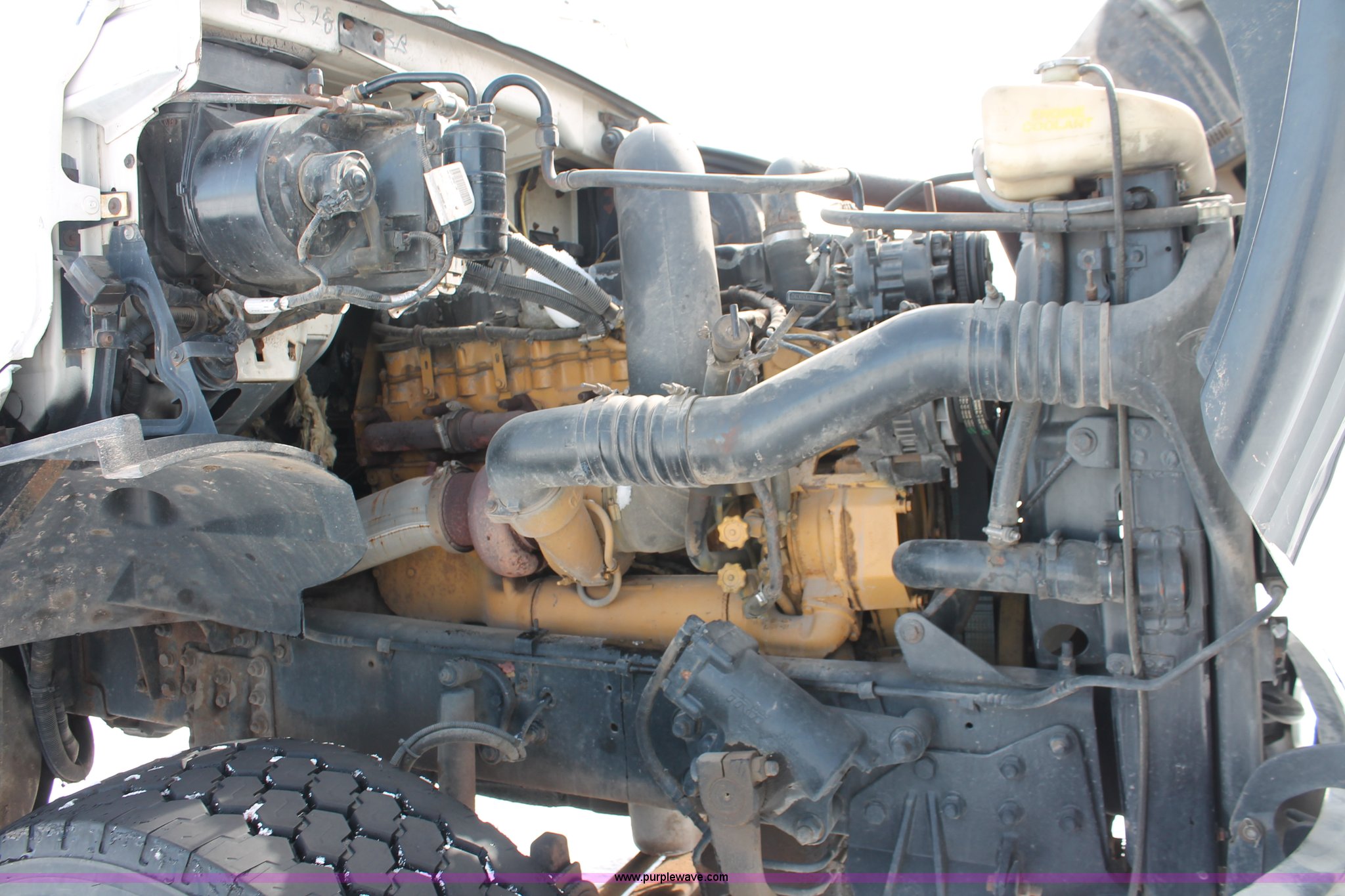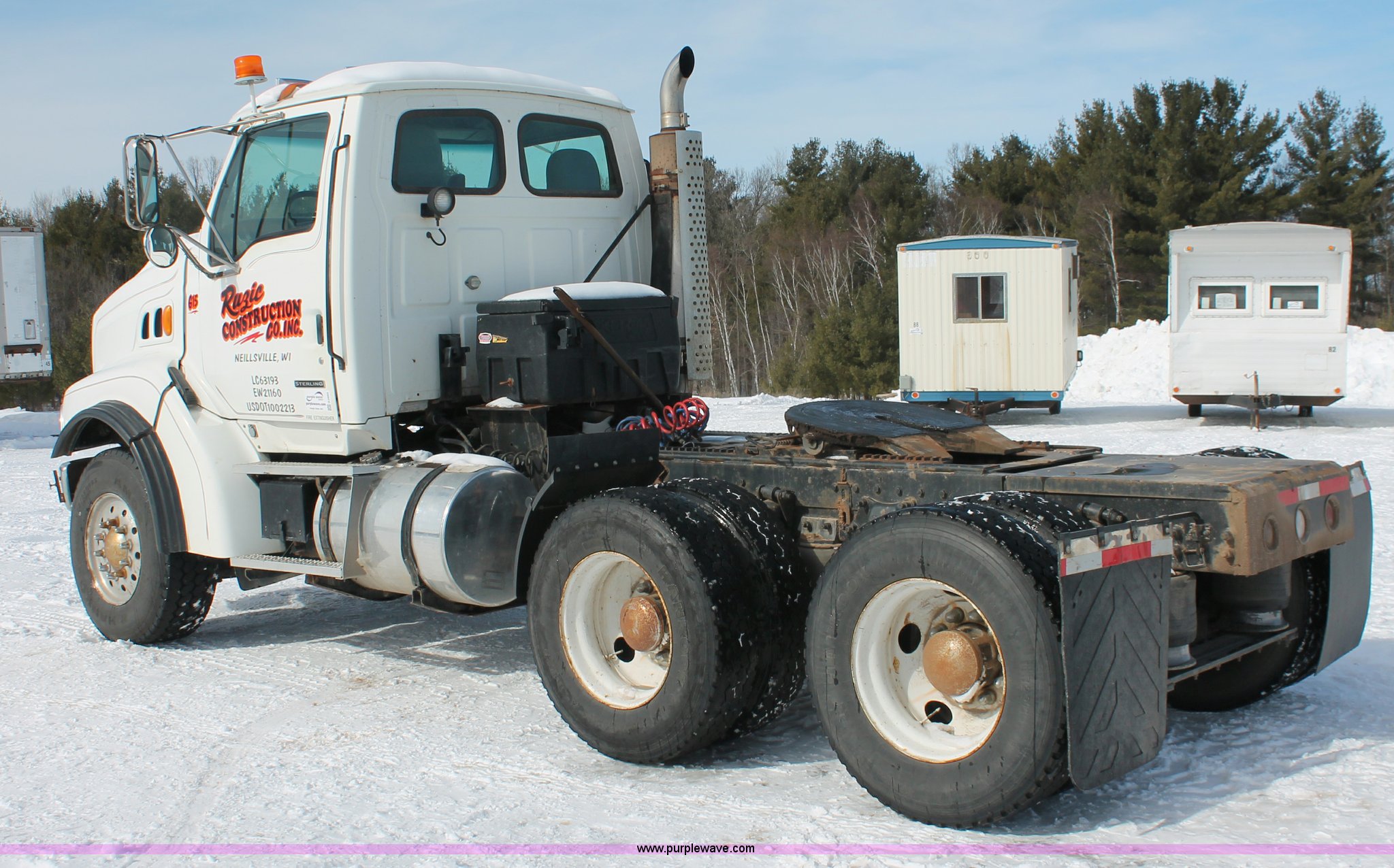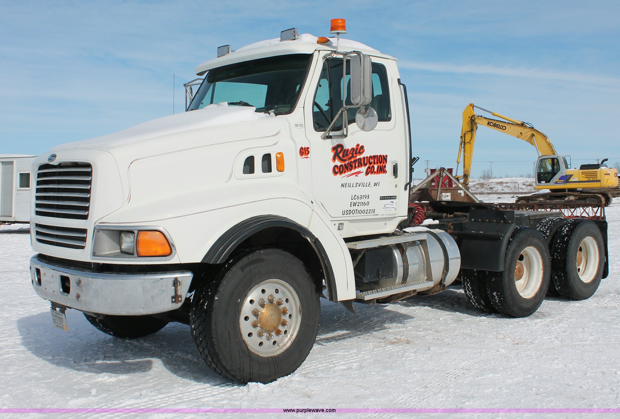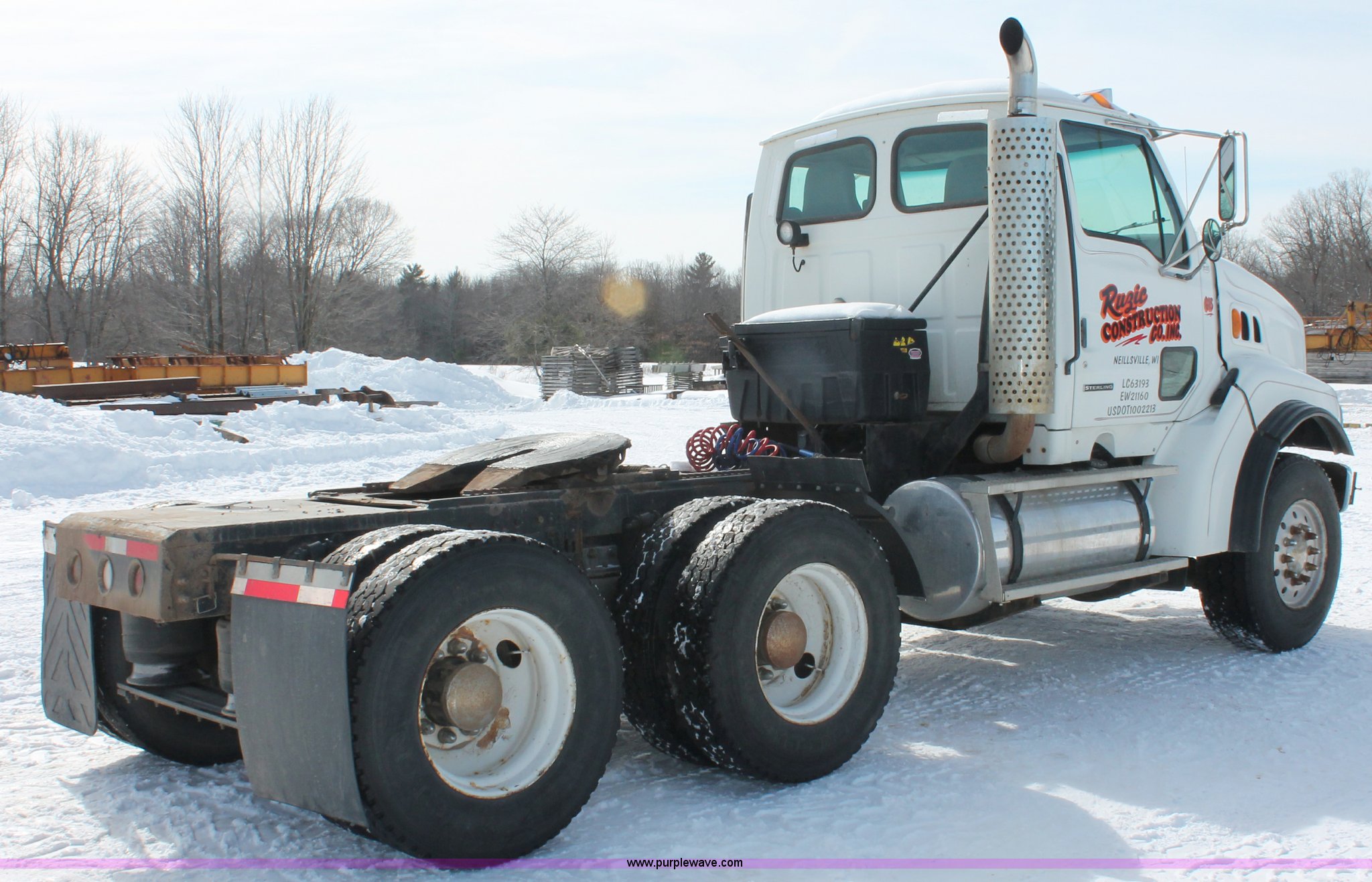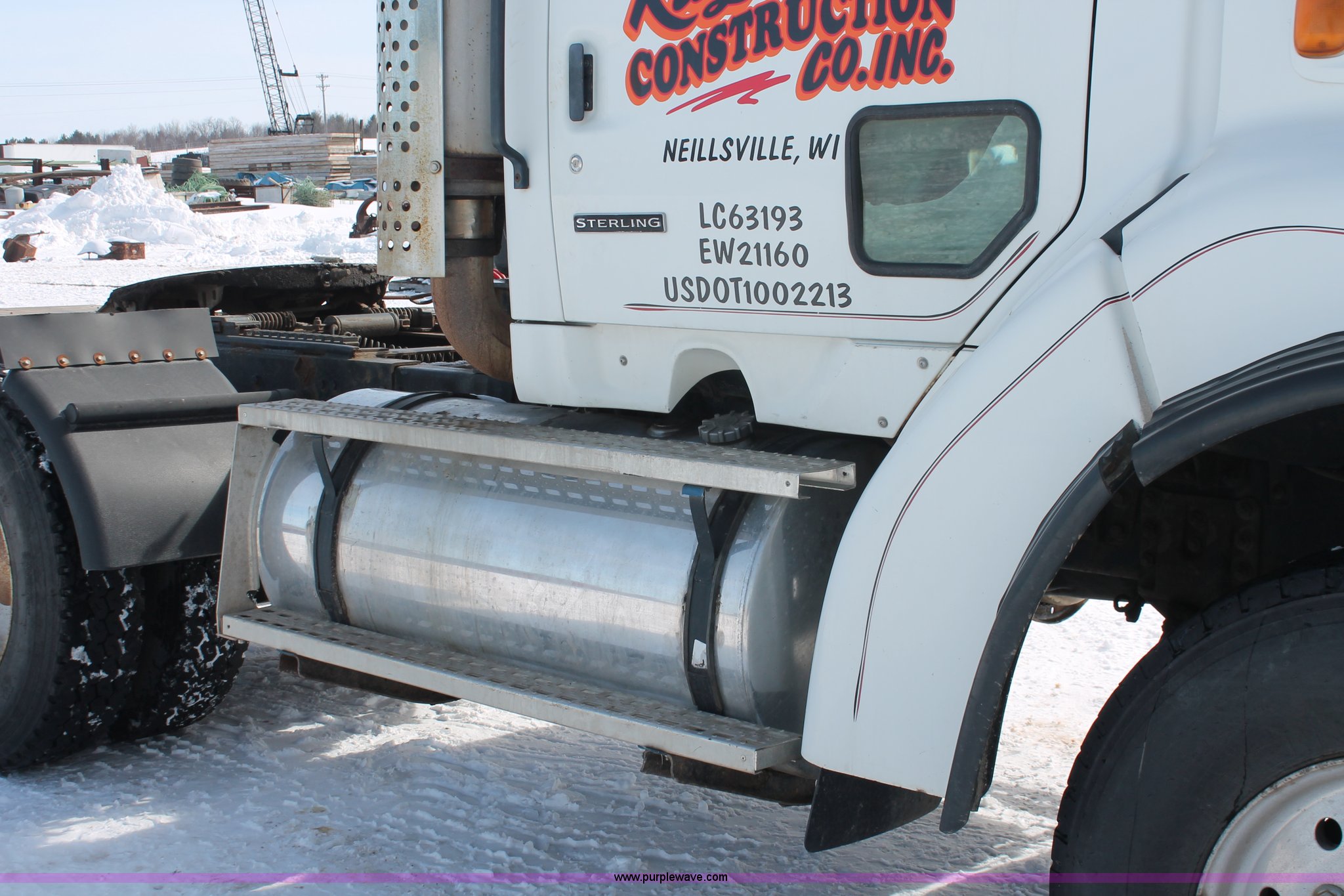 Purple Wave is selling a used Truck Tractor in Wisconsin. This item is a 2000 Sterling LT9522 semi truck with the following: 419,697 actual miles, Caterpillar 3406E 14.6L L6 diesel engine, 425 HP, Eaton Fuller 13 speed manual transmission, AC and heat, Tilt, Cruise, AM/FM/cassette, Passenger daylight door, Air suspension seat, Power windows, Heated mirrors, Visor, Chrome bumper, Block heater, Air slide fifth wheel, Dual fuel tanks, 100 and 50 gallon capacities, Single rear exhaust stack, Front tow hooks, Amber beacon, Rear work light, Packer toolbox, Air suspension, Air brakes, Jake brake, 180" wheelbase, Front wheel covers, Nut wheel covers, Axle lock, Fifth wheel lock, 385/65R22.5 front tires, 11R22.5 rear tires, GVWR 60,000 lbs, FAWR 18,000 lbs, IAWR 23,000 lbs, RAWR 23,000 lbs