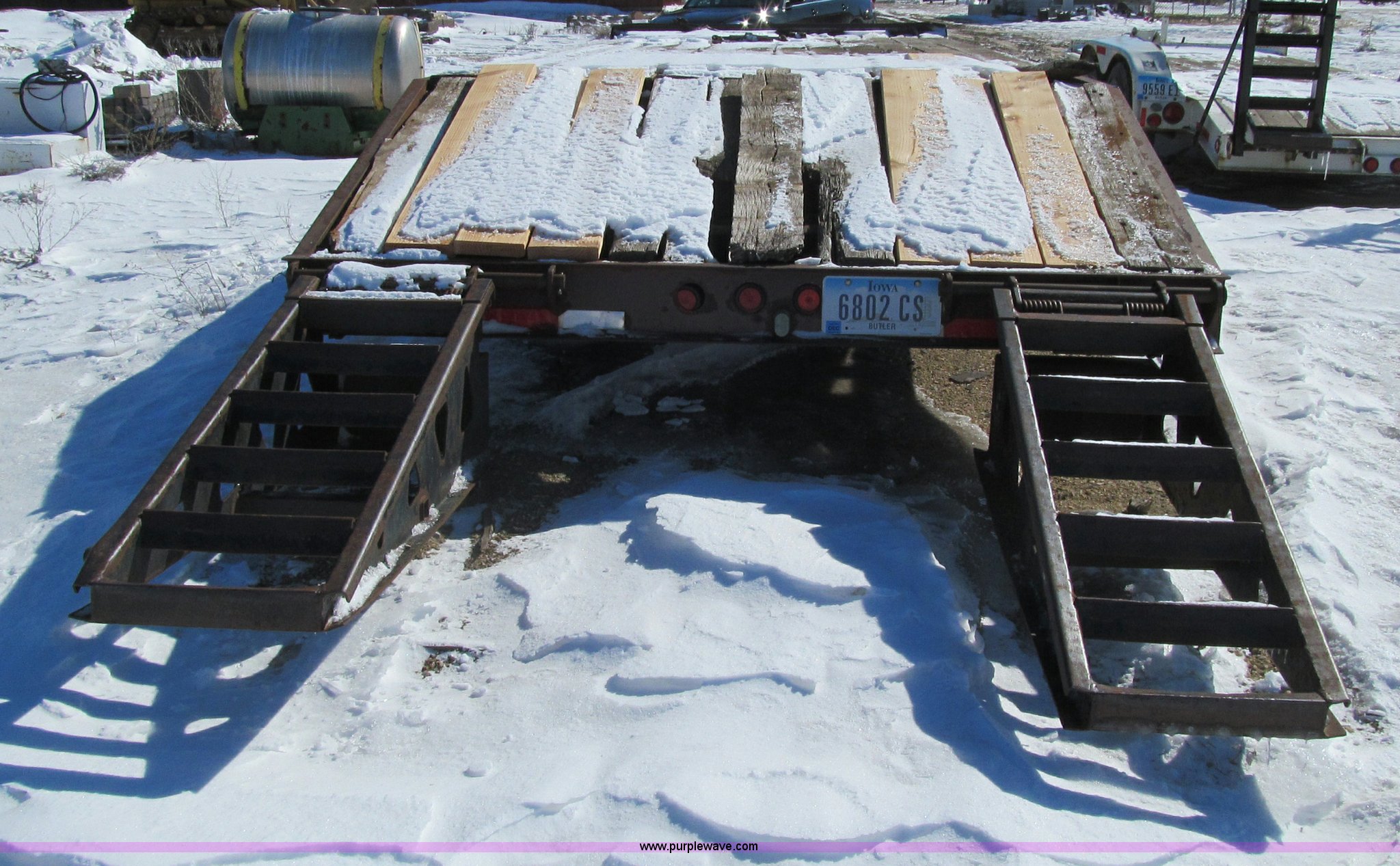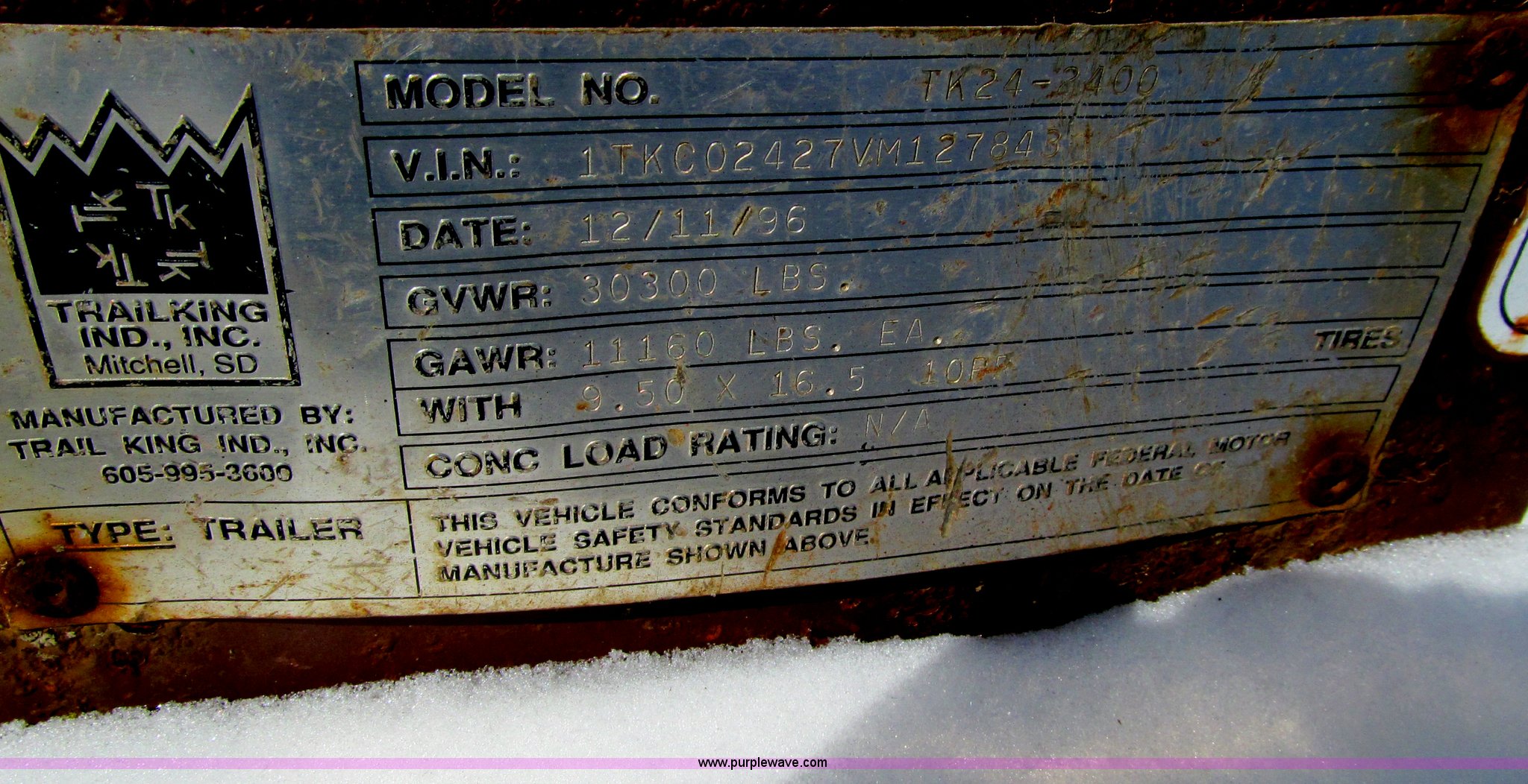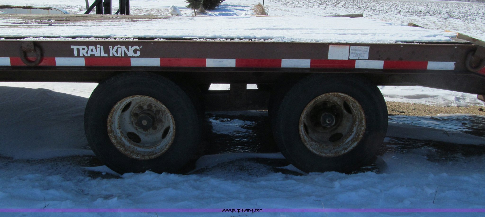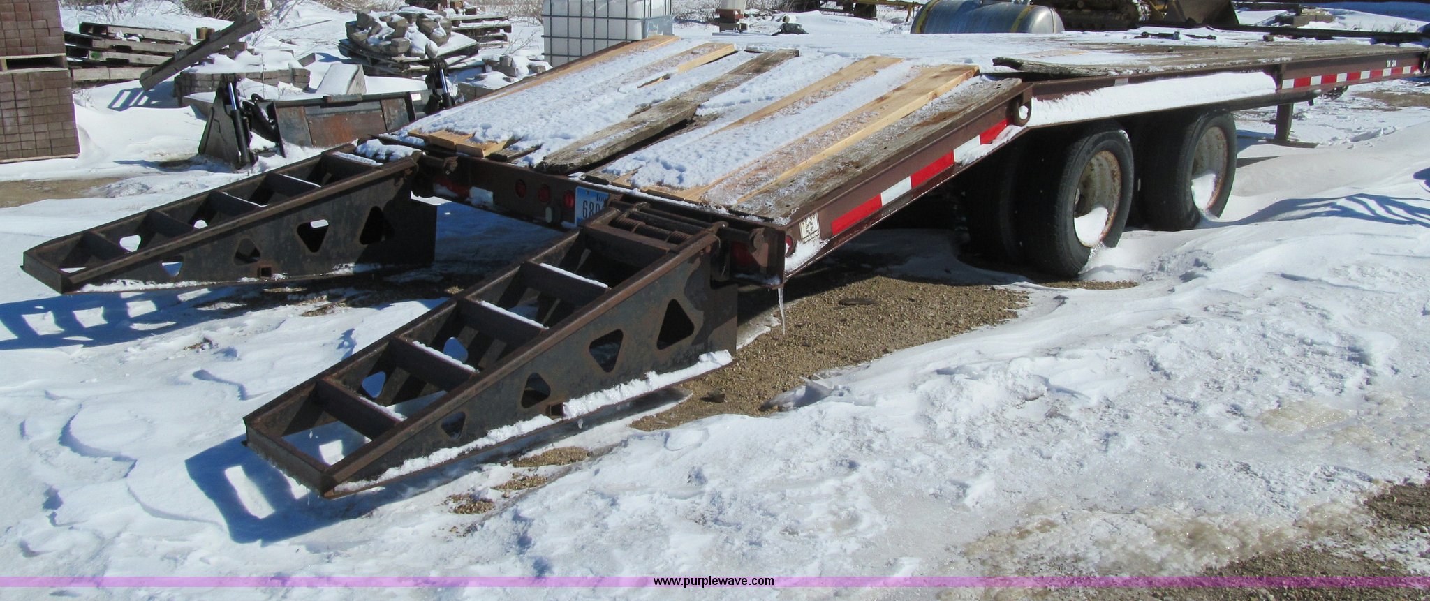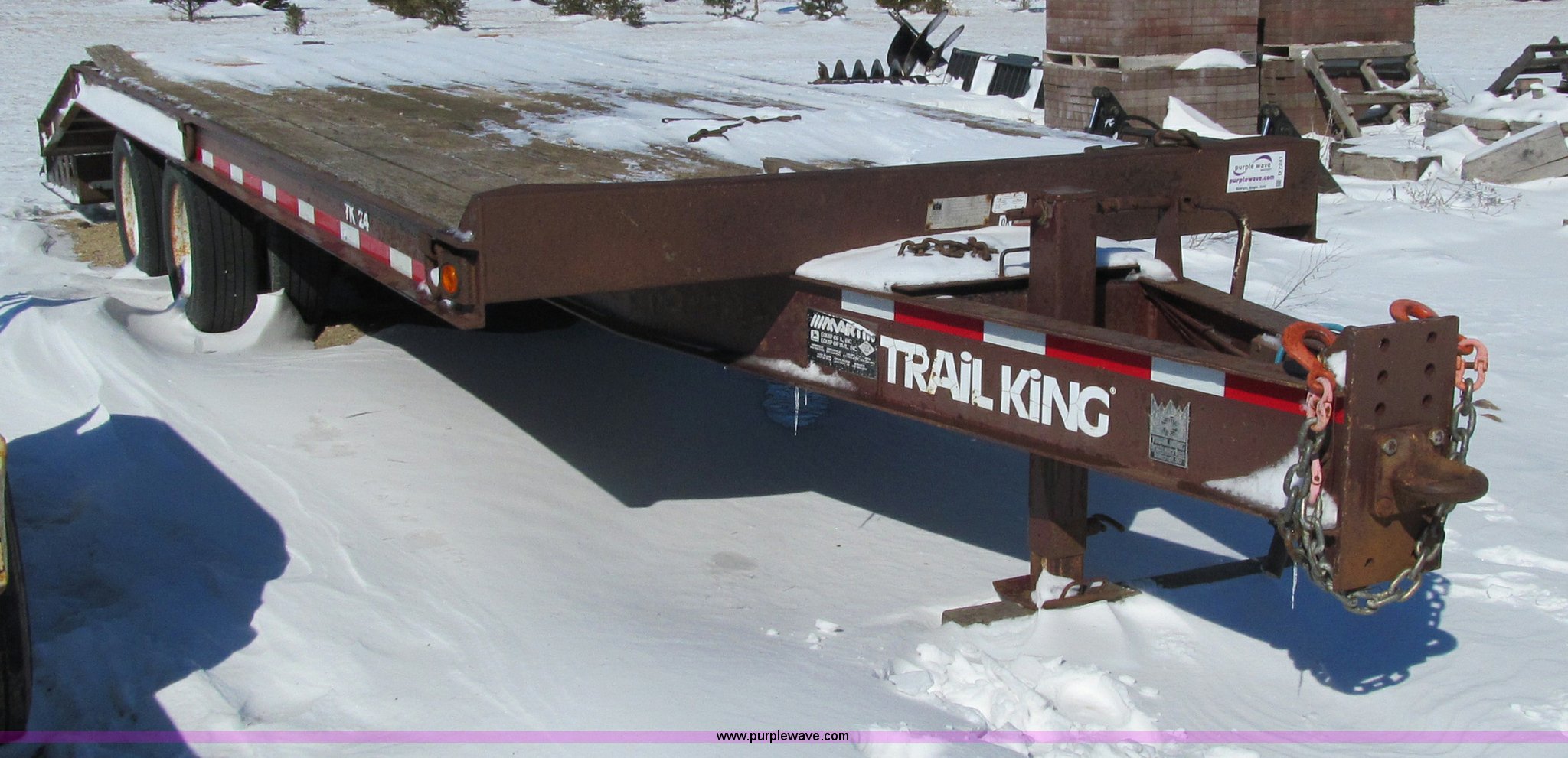 Purple Wave is selling a used Equip. Trailer in Iowa. This item is a 1997 Trail King TK24-2400 equipment trailer with the following: 19' x 8' level deck, 5' x 8' beaver tail, Flip over loading ramps, Pintle eye, Safety chains, Tongue jack, Dexter rubber bushed suspension, 9.50R16.5LT tires, GVWR 30,300 lbs, GAWR 11,160 lbs, Chains and binder not included