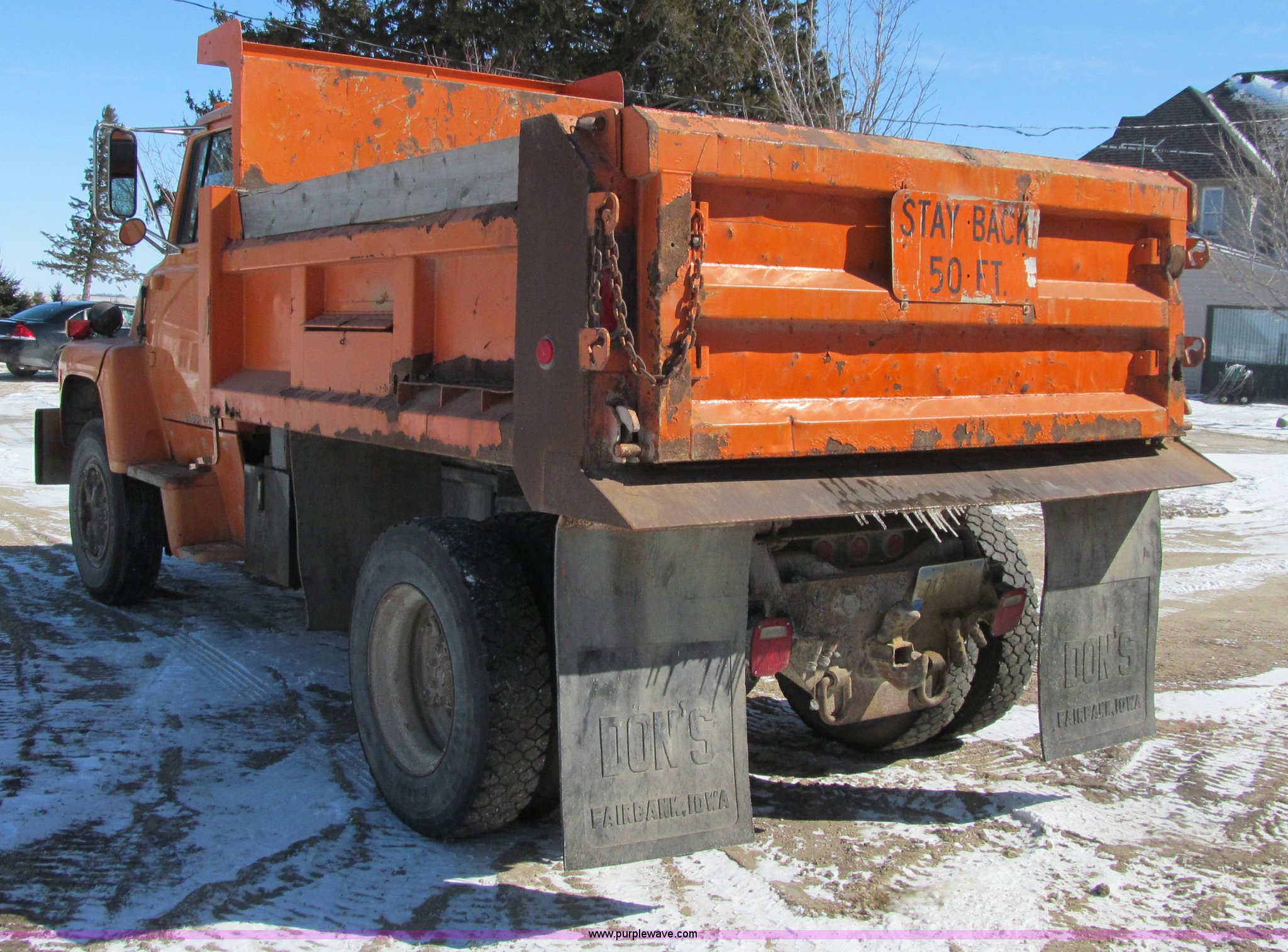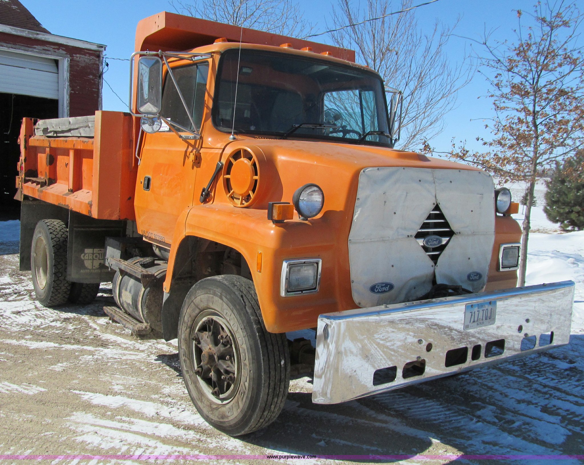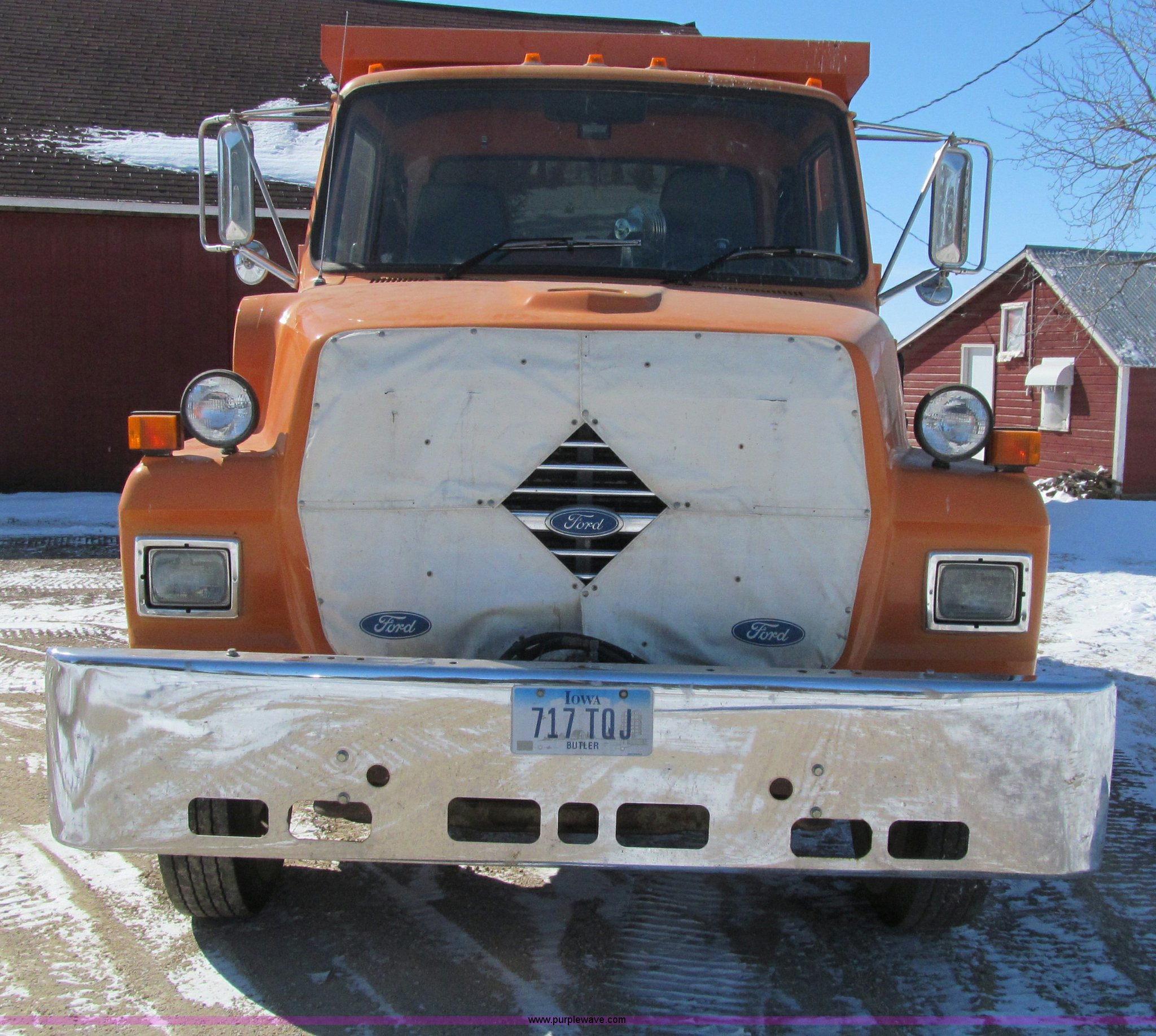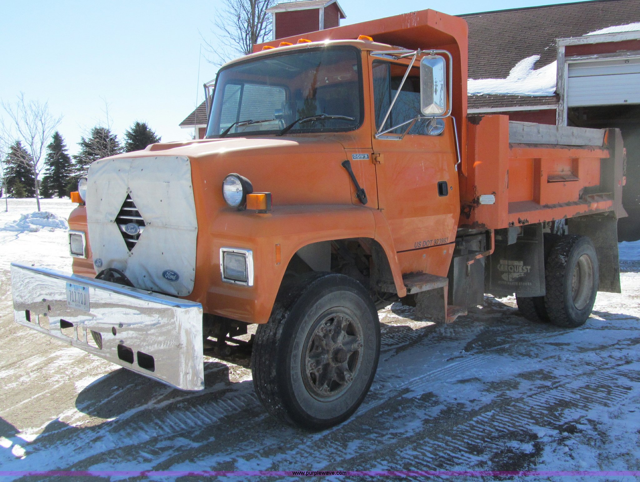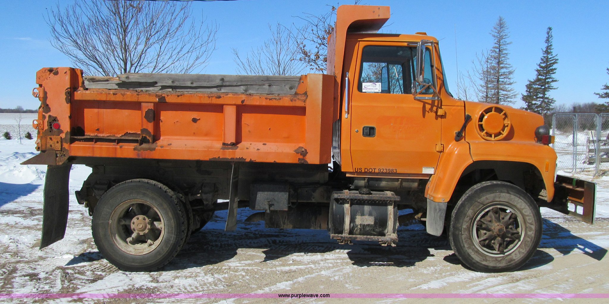 Purple Wave is selling a used Construction Dump Truck in Iowa. This item is a 1997 Ford N7000 dump truck with the following: 41,219 miles on odometer, 3,436 hours on meter, Cummins 5.9L L6 diesel engine, Five speed manual transmission, Hi-Lo axle, Heat, AM/FM, Air suspension seat, In-cab hydraulic controls for attachments, 10' box, Single ram, Wavy floor, Rust/corrosion, Chrome bumper, Block heater, Trailer wiring, Pintle hitch, Front mount PTO, Spring suspension, Air brakes, Air and hydraulic lines to rear of frame, 152" wheelbase, 10R22.5 tires, GVWR 28,500 lbs, Cab contents not included