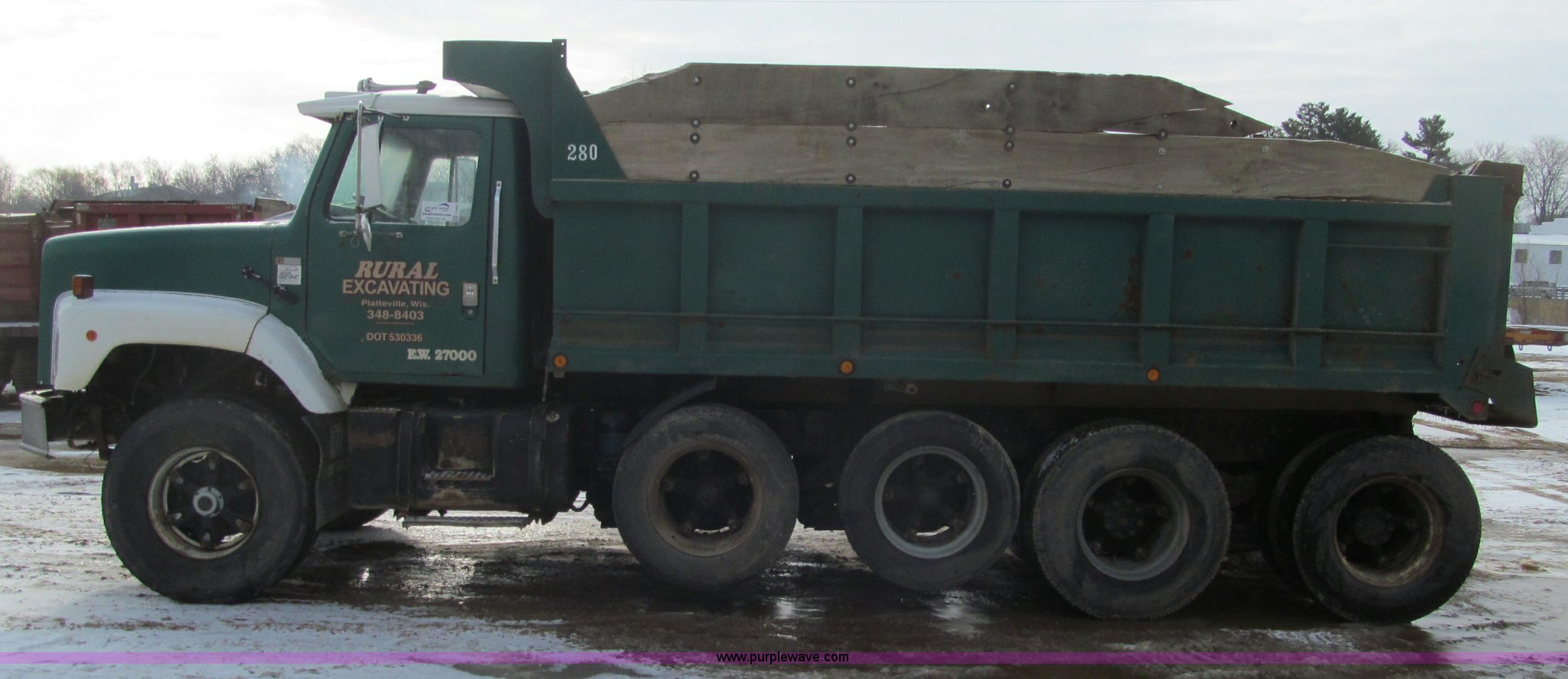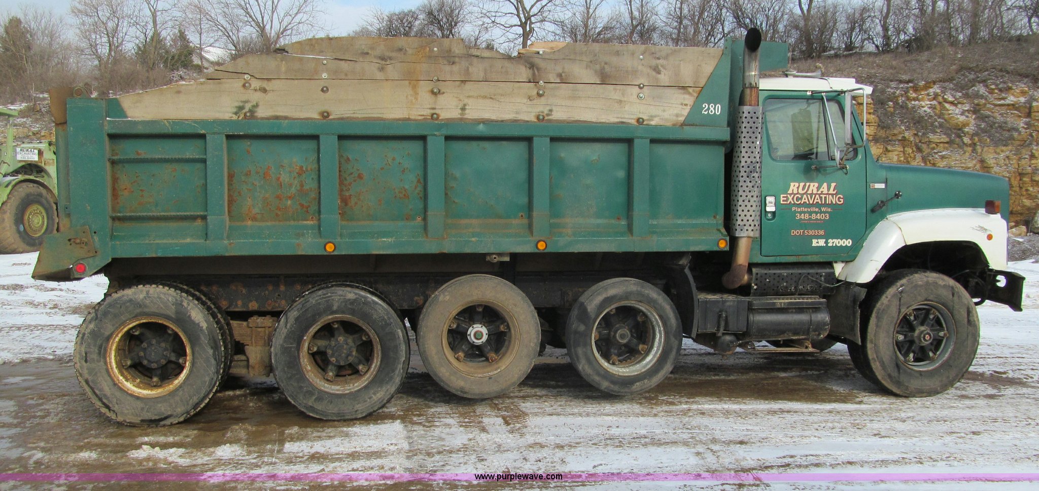 Purple Wave is selling a used Construction Dump Truck in Wisconsin. This item is a 1978 International F2674 quad axle dump truck with the following: 510,874 miles on odometer, Cummins NTC-290 diesel engine, Eaton Fuller Road Ranger eight speed manual transmission, Lo-Lo, Twin screw, Heat, Tilt, Air suspension seat, Heated mirrors, 16'L x 8'W box, Air operated end gate, Exterior visor, Single fuel tank, Spring suspension, PTO, Air brakes, Jake brake, Tag axle, 214" wheelbase, 425/65R22.5 front tires, 11R22.5 rear tires, DOT inspection completed April 2012