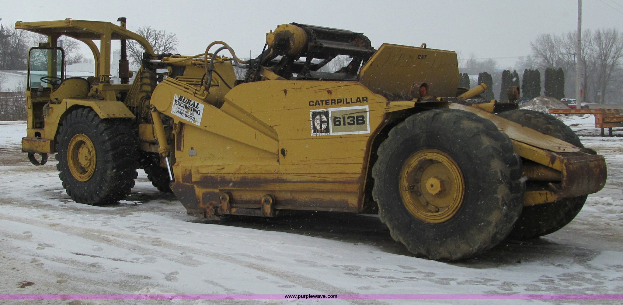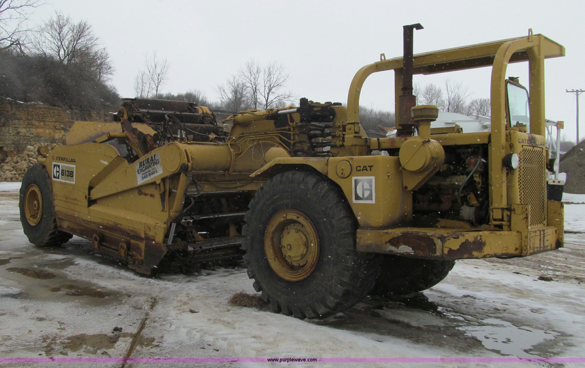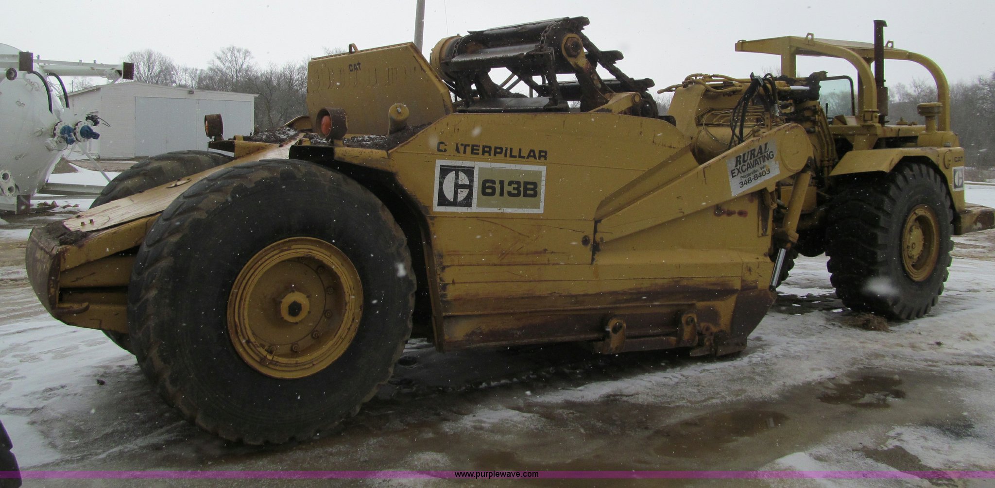 Purple Wave is selling a used Elevating Scraper in Wisconsin. This item is a 1974 Caterpillar 613B elevating scraper with the following: 2,925 hours on meter, Caterpillar 3206 diesel engine, 4F-2R gears, 23.5R25 tires, Serial 71M2665