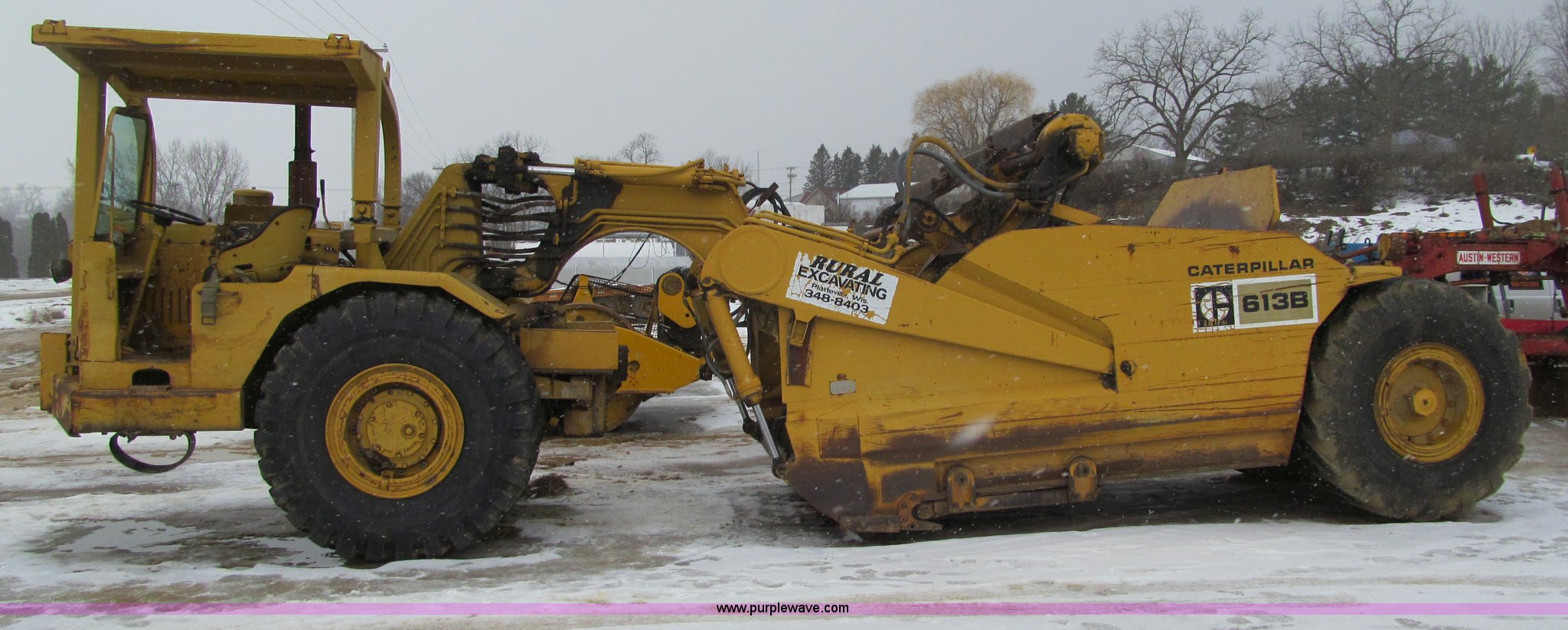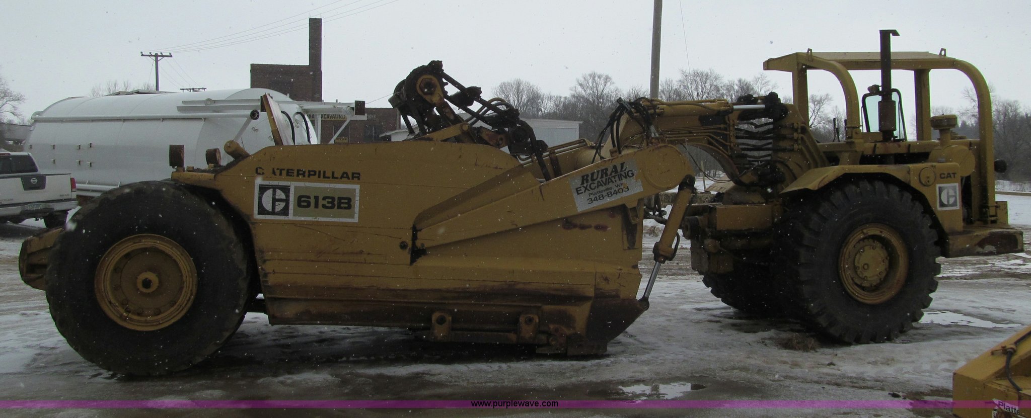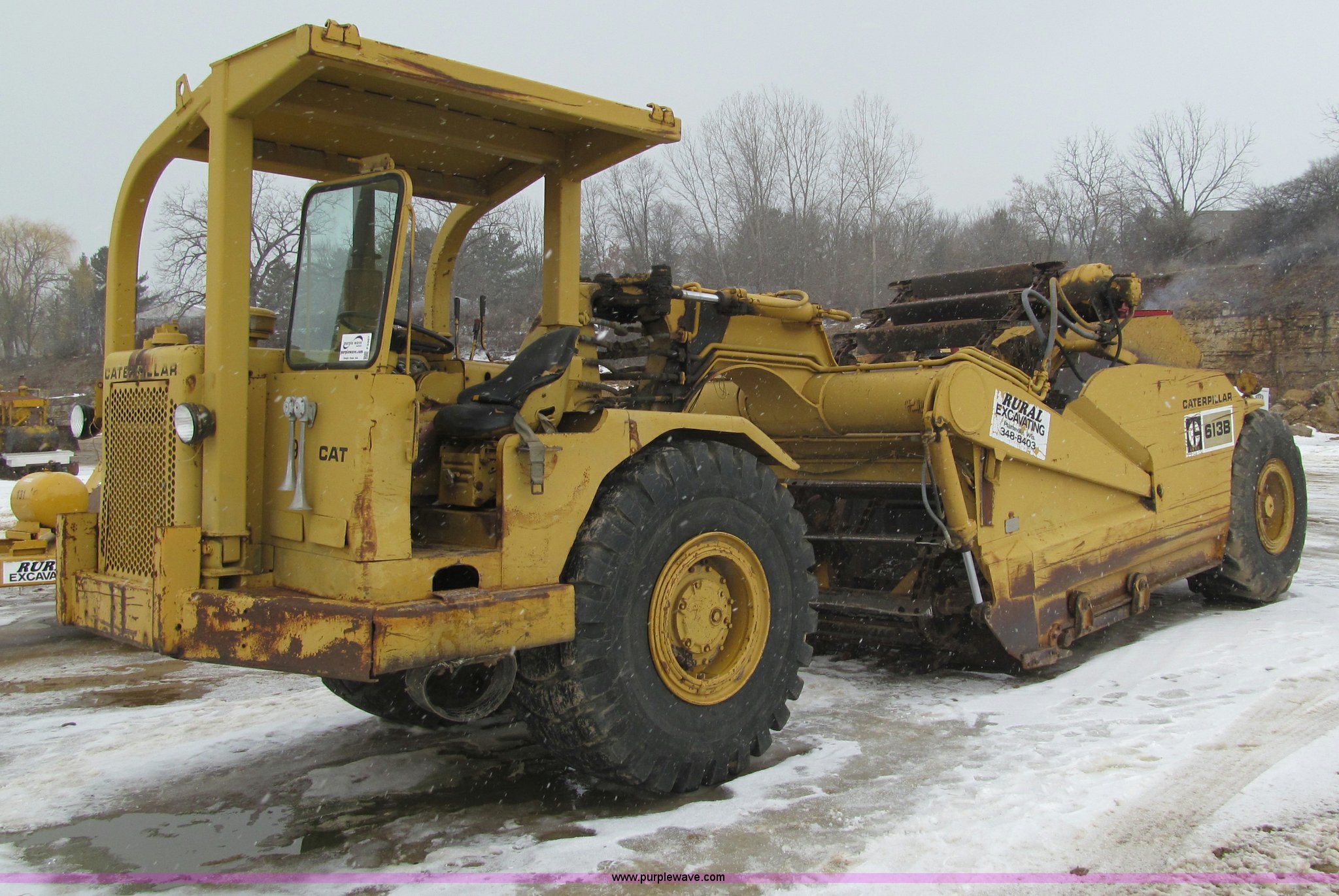 Purple Wave is selling a used Elevating Scraper in Wisconsin. This item is a 1974 Caterpillar 613B elevating scraper with the following: 2,925 hours on meter, Caterpillar 3206 diesel engine, 4F-2R gears, 23.5R25 tires, Serial 71M2665