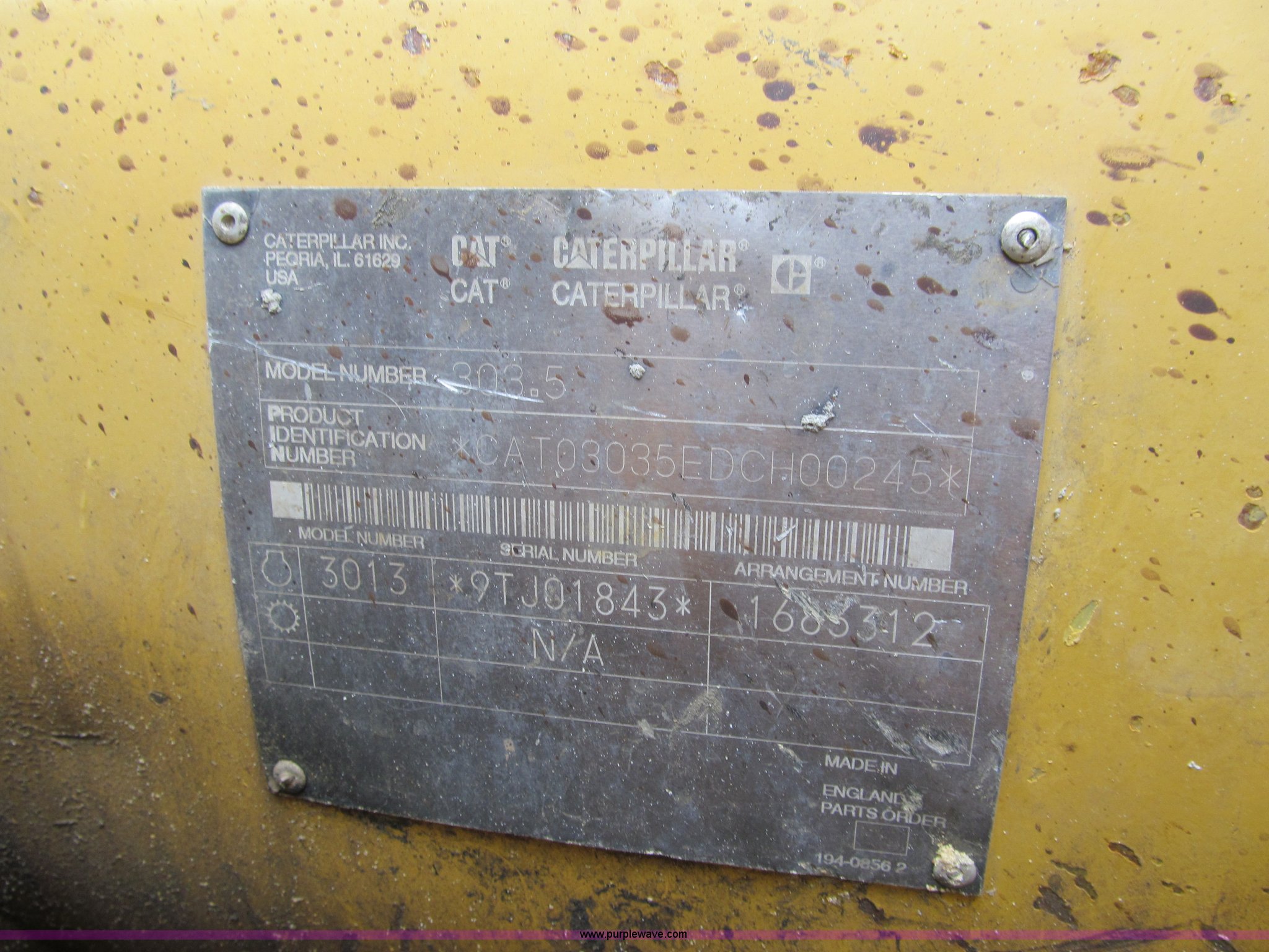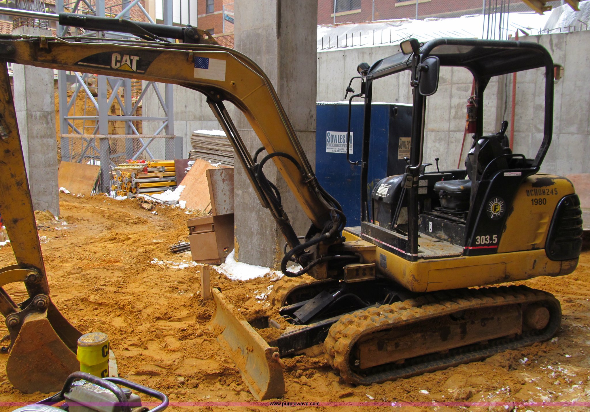 Purple Wave is selling a used Mini Excavator in Minnesota. This item is a 2002 Caterpillar 303.5 mini excavator with the following: 5,458 hours on meter, Caterpillar 3013 three cylinder diesel engine, 28 HP, Suspension seat, Canopy, Work lights, 5'4" stick, 22" bucket, Offset boom, 61" leveling blade, Auxiliary hydraulics, 12"W rubber tracks, 7,673 lbs. base operating weight, Right rear mirror missing, Serial CAT03035EDCH00245, OID 1980