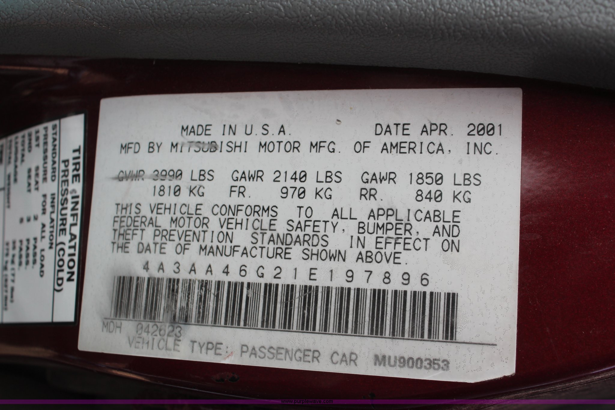 2001 Mitsubishi Galant ES. Mileage unknown, 2.4L I4 EFI gas engine, Automatic transmission, AC and heat, Tilt, Cruise, AM/FM/CD, Power windows, locks, and mirrors, Cloth interior, 195/65R15 tires Flat, No keys, Passenger side mirror broken, Paint peeling, Unit# MP0063. Vehicle abandoned. No additional information available. Vehicle is subject to reclaim by original owner until 2 p.m. April. 19.. Buyer will received paperwork indicating the abandoned status of the vehicle and which is sufficient to receive a title.. See removal details below. 4A3AA46G21E197896. Shipping quotes available. NAFI Abandoned Vehicles. Building 7920A 7816 Apennines Dr.. Ft. Riley, KS 66442