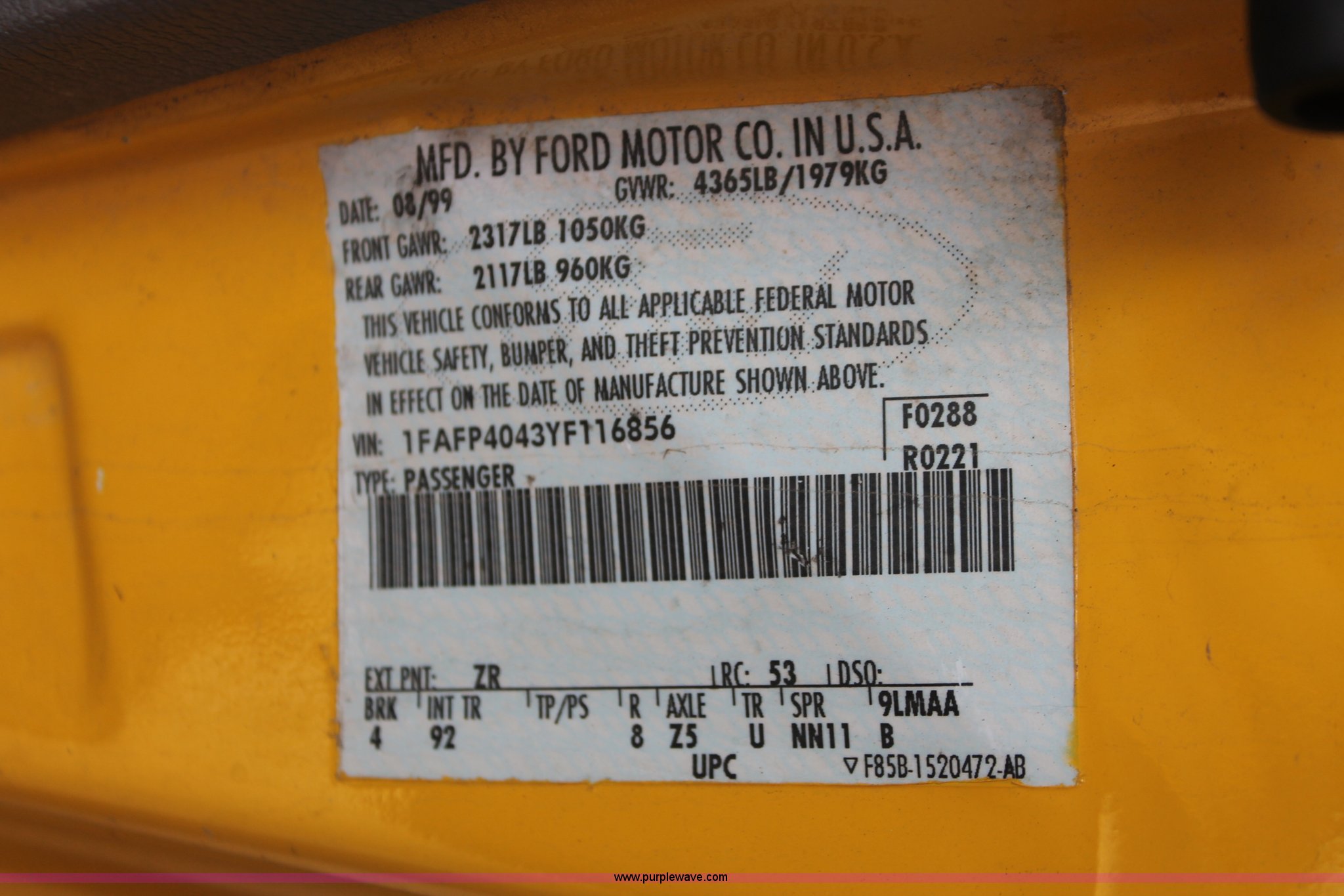 2000 Ford Mustang. Mileage unknown, 3.8L V6 EFI gas engine, Automatic transmission, AC and heat, Tilt, Cruise, Power windows, locks, and mirrors, Cloth interior, Rear spoiler, 205/65R15 tires, No keys, Interior/exterior cosmetic damage, Windows rolled down, Stereo missing, Paint chipping/peeling, Unit# AV6856. Vehicle abandoned. No additional information available. Vehicle is subject to reclaim by original owner until 2 p.m. April. 19.. Buyer will received paperwork indicating the abandoned status of the vehicle and which is sufficient to receive a title.. See removal details below. 1FAFP4043YF116856. Shipping quotes available. NAFI Abandoned Vehicles. Building 7920A 7816 Apennines Dr.. Ft. Riley, KS 66442