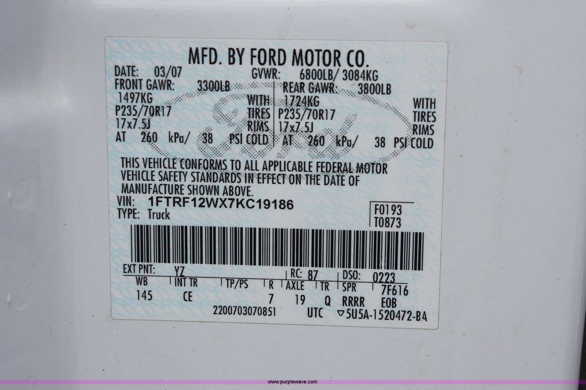 2007 Ford F150 XLT pickup truck. 47,532 actual miles, 4.6L V8 SOHC 16V gas engine, Automatic transmission, AC and heat, Tilt, AM/FM, Manual windows and locks, Cloth interior, All-Star poly bed liner, Receiver hitch, Trailer wiring, P235/70R17 tires, EIN 1069612. 1FTRF12WX7KC19186. Shipping quotes available. United Rentals - Perrysburg. 620 Eckel Road. Perrysburg, OH 43551
