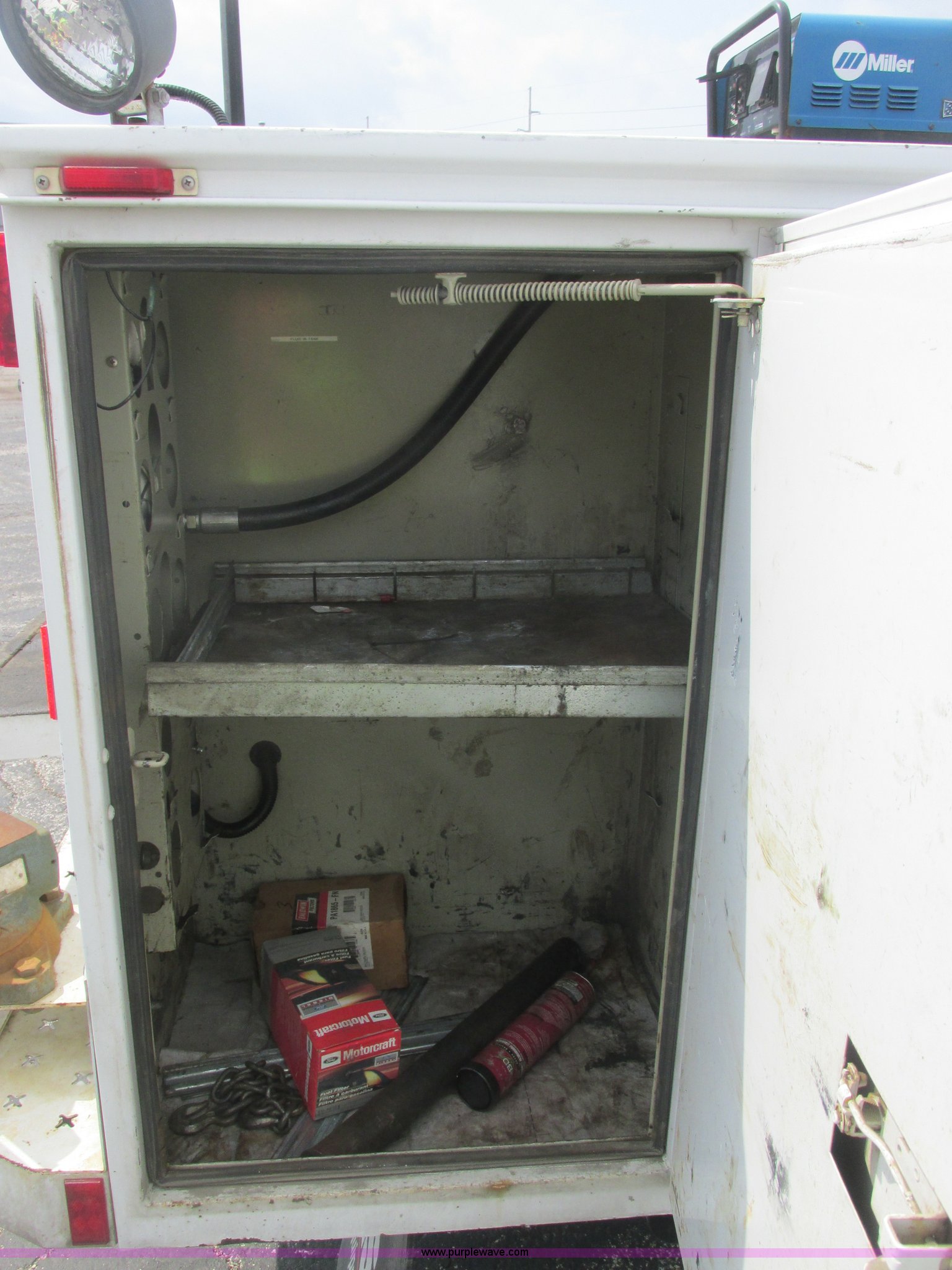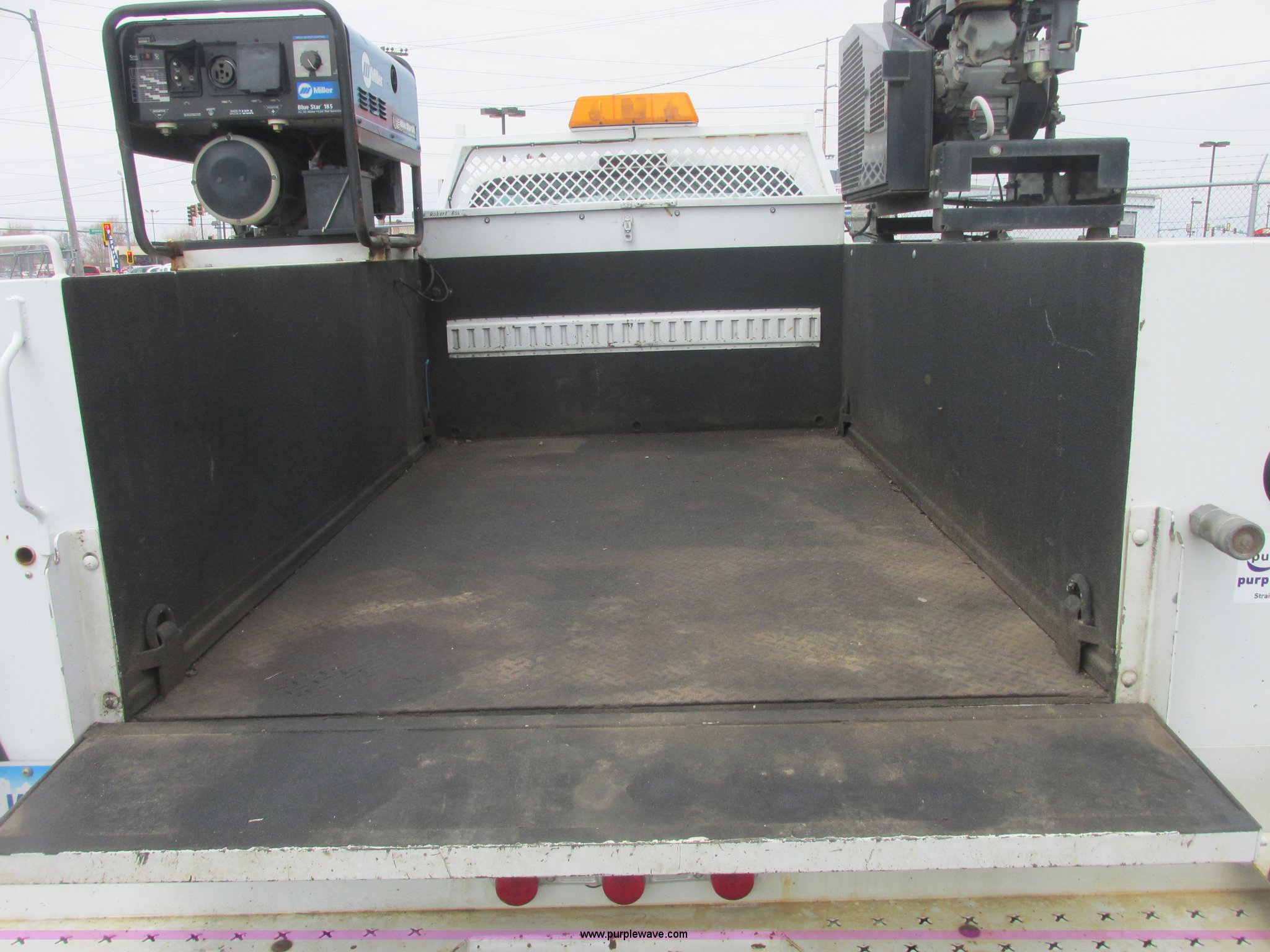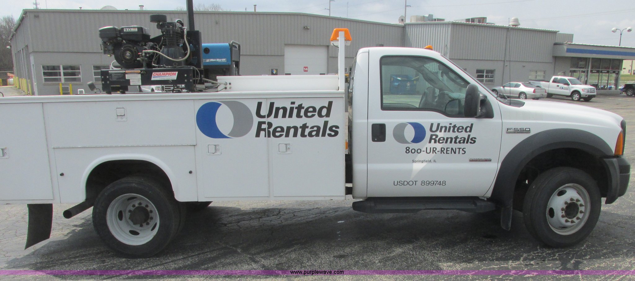 Purple Wave is selling a used Service Truck in Illinois. This item is a 2007 Ford F550 XL Super Duty service truck with the following: 125,603 miles on odometer, Powerstroke 6.0L V8 diesel engine, Automatic transmission, AC and heat, Tilt, Cruise, AM/FM/CD, Manual windows and locks, Vinyl interior, Tow mirrors, Fender flares, Running boards, Headache rack, Steering wheel controls, Block heater, Knapheide service body, Model 61322D54J, Tool drawers, Storage compartments, Rear mounted work lights, Step bumper with 5" vise, On-board Champion air compressor, Model AS2-SR09-CHP, Subaru Robin EX27 engine, 9.0 HP, Hose reel, 17.2 CFM at 175 psi, Serial 20058453, Miller Blue Star 185 CC/DC welder, 16 hours on meter, Kohler 12.75 HP engine, 6,000 watt generator, Rear plumbed hydraulics, (3) Reelcraft reels, (2) oil, Grease, Lube setup, Suction pump, Oxygen and acetylene rack, Rhino bed liner, D-ring tie downs, Enclosed lube box with air assist lid, Beacon light, Serial 20060927-0039464, Exterior jumper cable plug, Mudflaps, Tailgate, Tow hooks, Spring assist doors, Receiver hitch, Trailer wiring, 255/70R19.5 tires, Interior/exterior cosmetic damage, Scratches, Trim missing on corner of bumper, Driver side running board damaged, EIN 662650RA