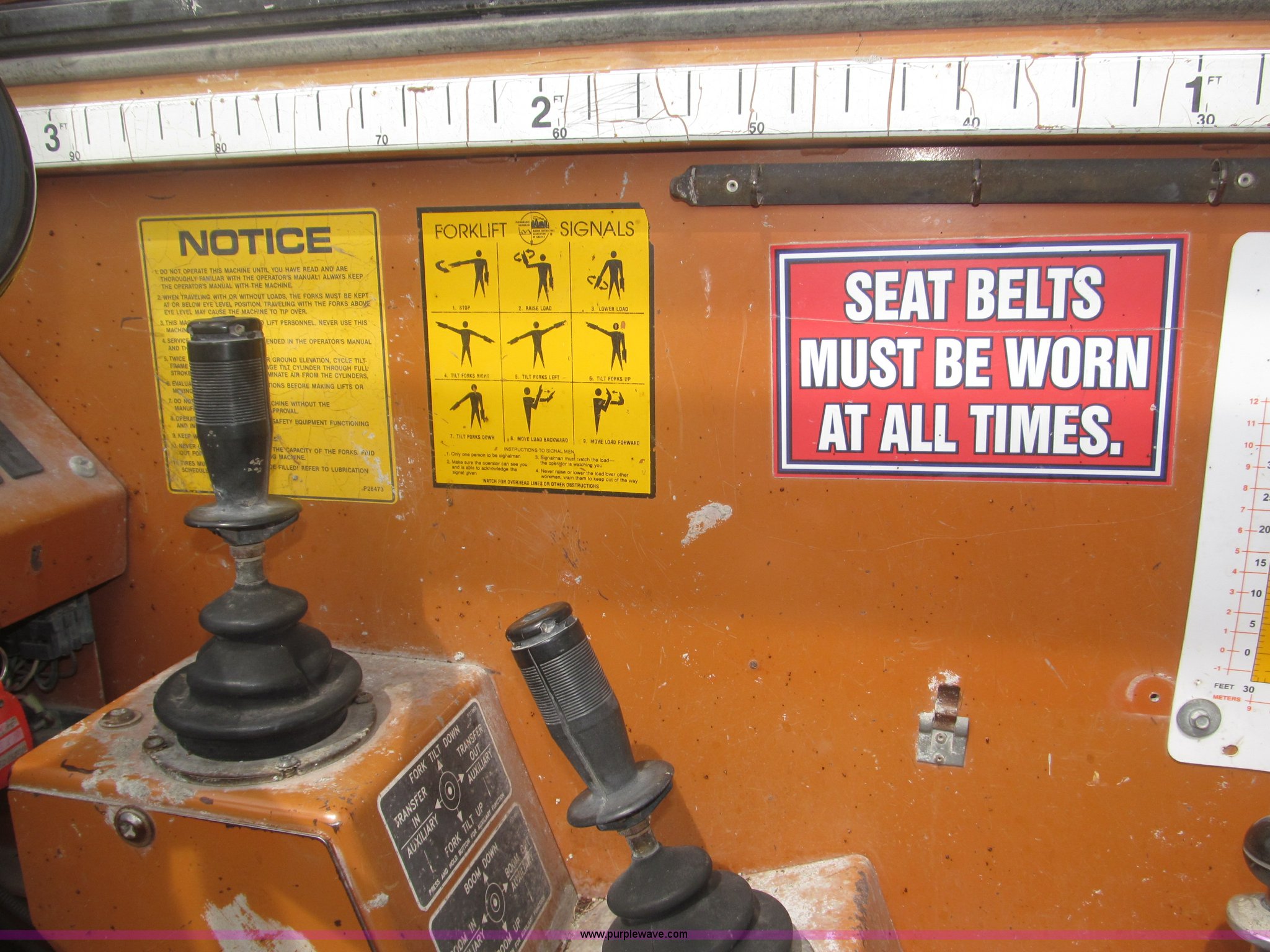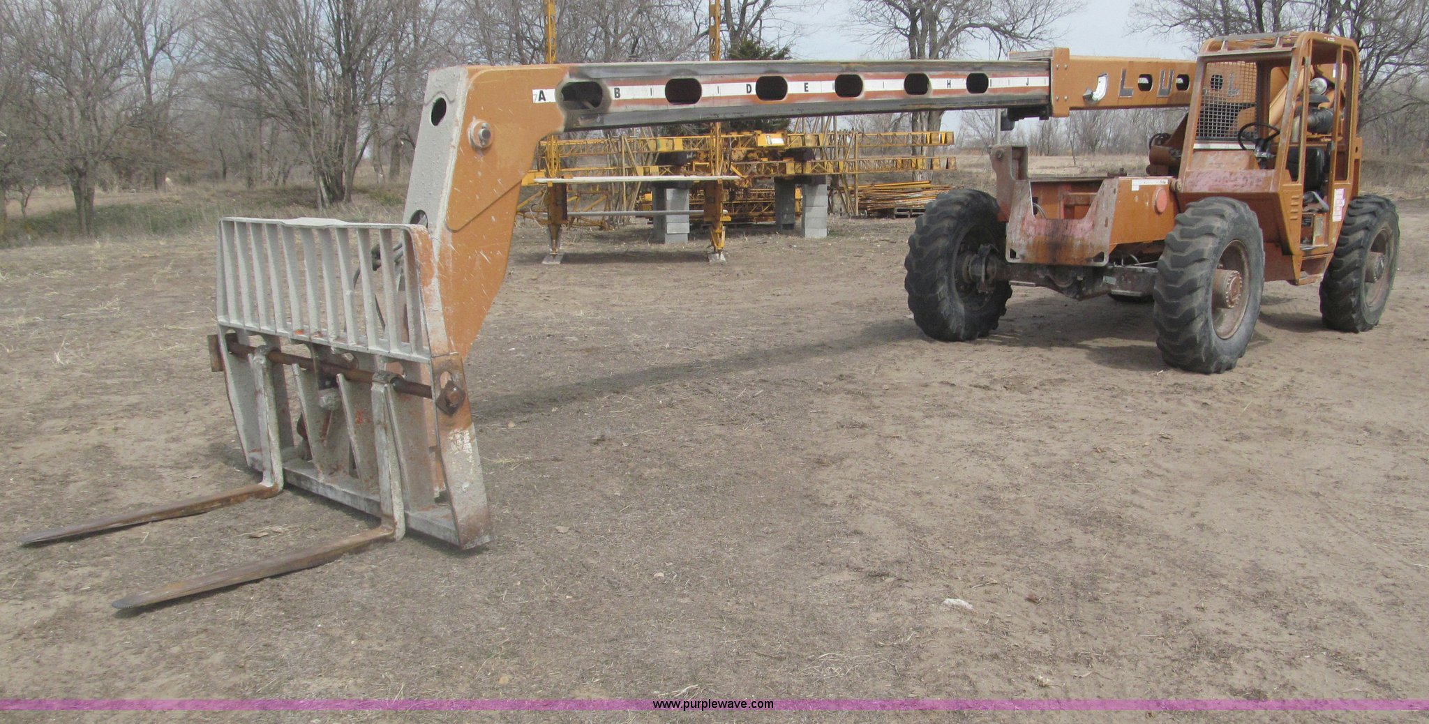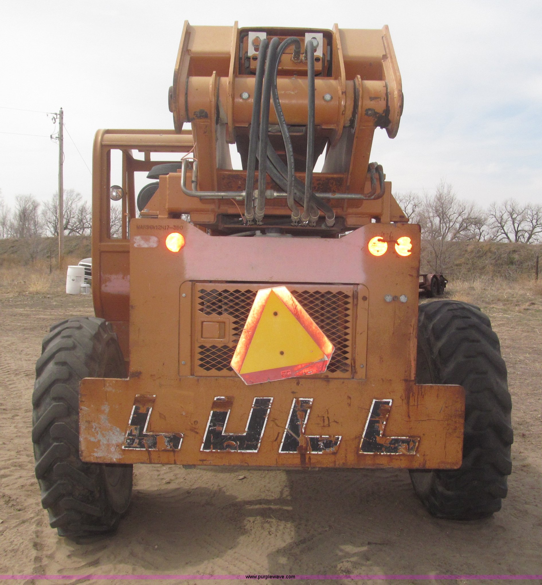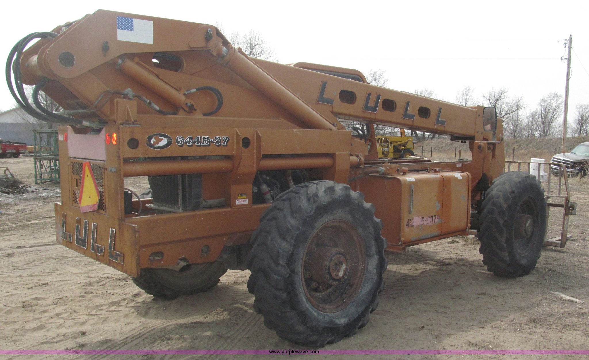 Purple Wave is selling a used Telehandler in Nebraska. This item is a 1996 Lull 644B-37 Highlander series telehandler with the following: 3,699 hours on meter, John Deere four cylinder diesel engine, Hydrostatic transmission, 4F-4R gears, Four wheel drive, Crab steer, Circle steer, Four wheel steer, ROPS, 37' maximum lift height, 25' maximum forward reach, 6,000 lbs maximum lift capacity at 24" on center, 42"L forks, Joystick controls, Tilt carriage, 74"W x 47"H, Hydraulic leveling, Boom and tilt level indicators, Transmission DE clutch, Seat belt, Backup alarm, 13.00-24 calcium filled tires, 21,340 lbs. base operating weight, Spicer front axle serial 80759, Spicer rear axle serial 80767, Rear oscillation lock engages at high idle, Light indicator on dash, One foot pedal broken, Cab mounted mirror cracked, Serial MAR96V12N17-390