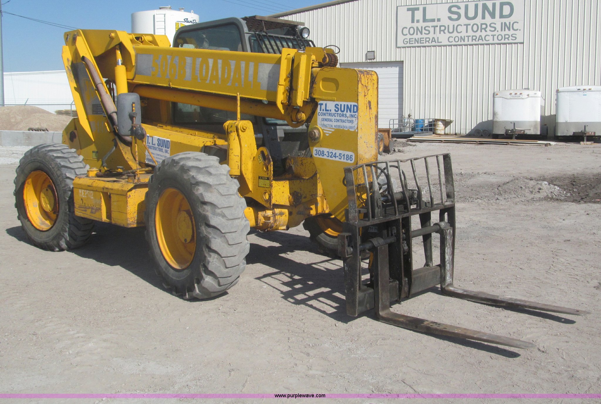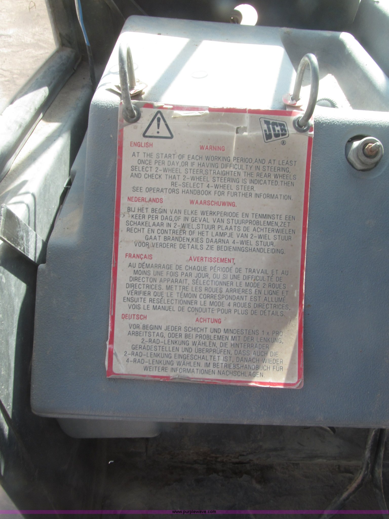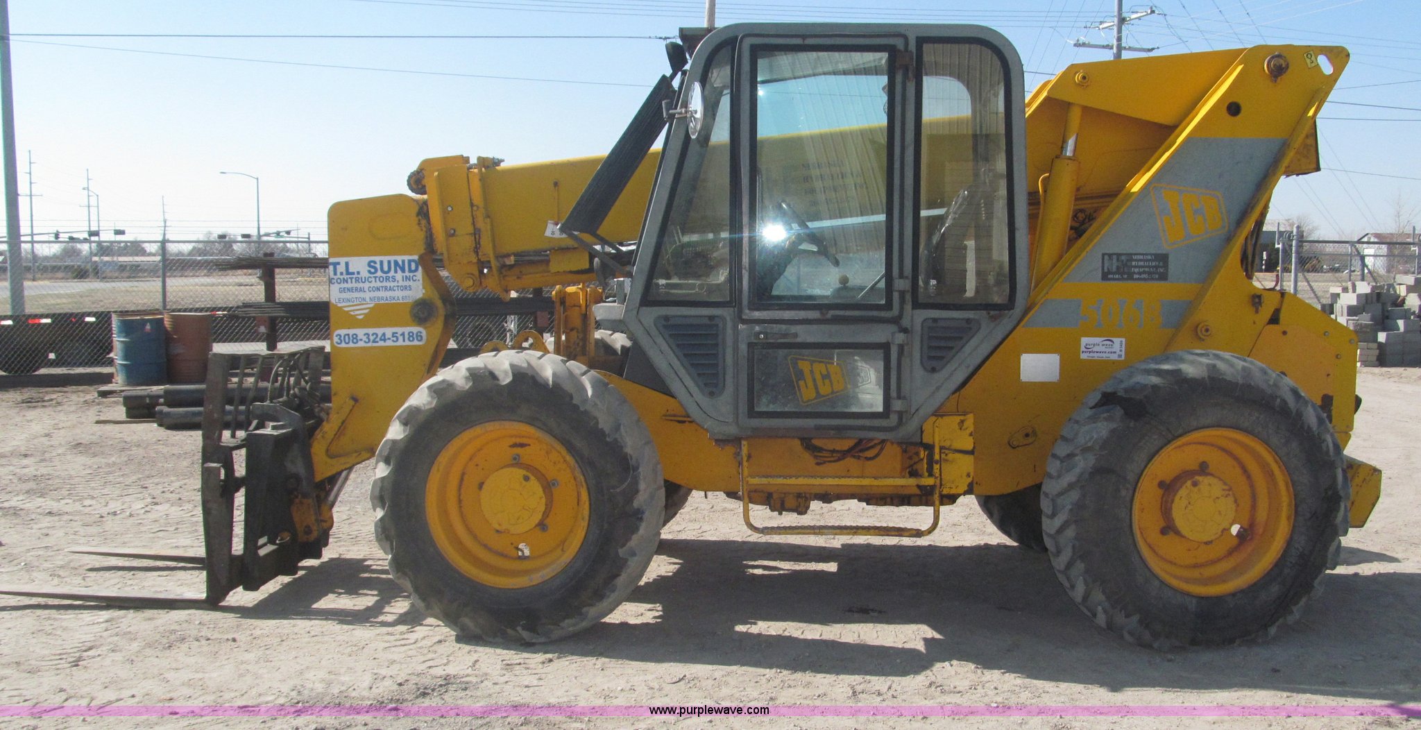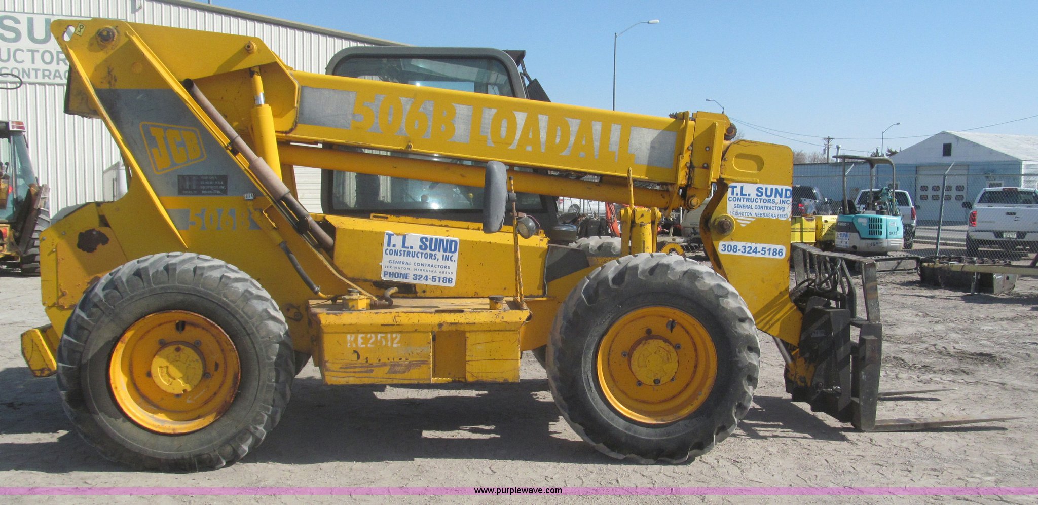 Purple Wave is selling a used Telehandler in Nebraska. This item is a 1995 JCB 506B telehandler with the following: 7,619 hours on meter, Perkins four cylinder diesel engine, Hydrostatic transmission, 4F-4R gears, Serial 453096100645, Crab steer, Four wheel steer, Four wheel drive, Cab, Heat, Inoperable, Cab fan, Tilt, Spring suspension seat, 6,000 lbs maximum lift capacity, Three boom sections, 47"L x 4 3/4"W forks, 2,800 lbs individual fork rating, Tilt carriage, 51"W x 44"H, Rotating carriage, Hydraulic leveling, Tilt and angle indicators, Front and rear work lights, Quick attach, Seat belt, 15.5-25 calcium filled tires, 19,500 lbs. base operating weight, Hydraulic boom lines replaced three years ago, Tachometer inoperable, No load chart, Rear tires replaced two years ago, Hydraulic leak under cab, Operator's seat damaged, Hydraulic leak on tilt carriage, Carriage backrest bent, Key broken off in ignition, One light is loose, Serial SLP506B0SE0574337