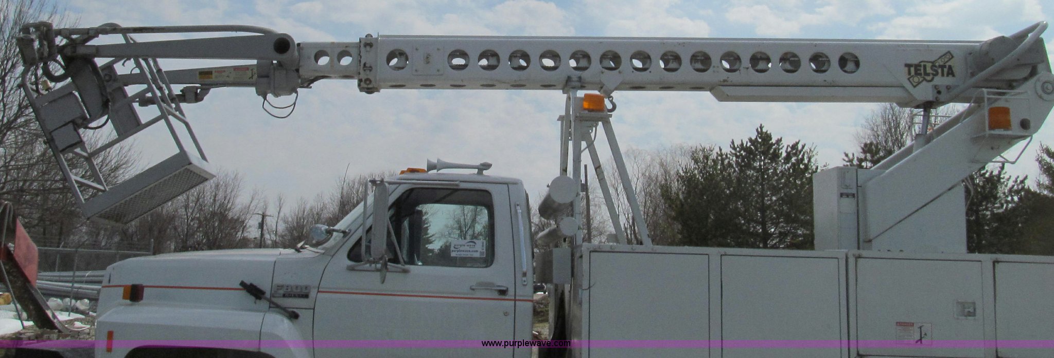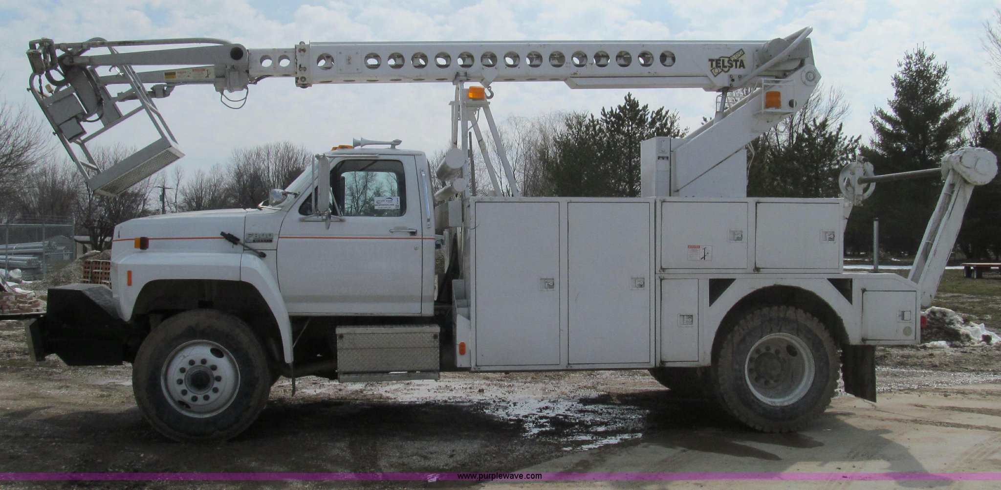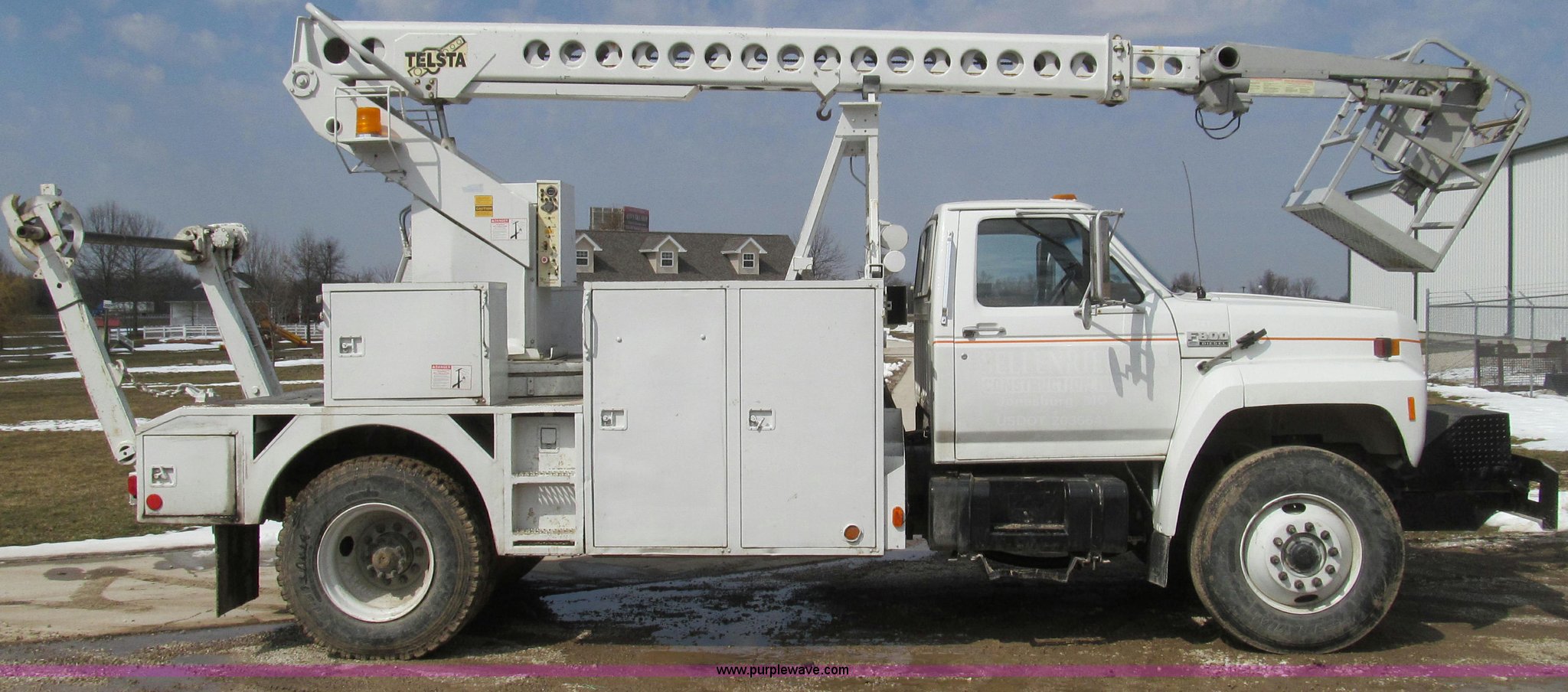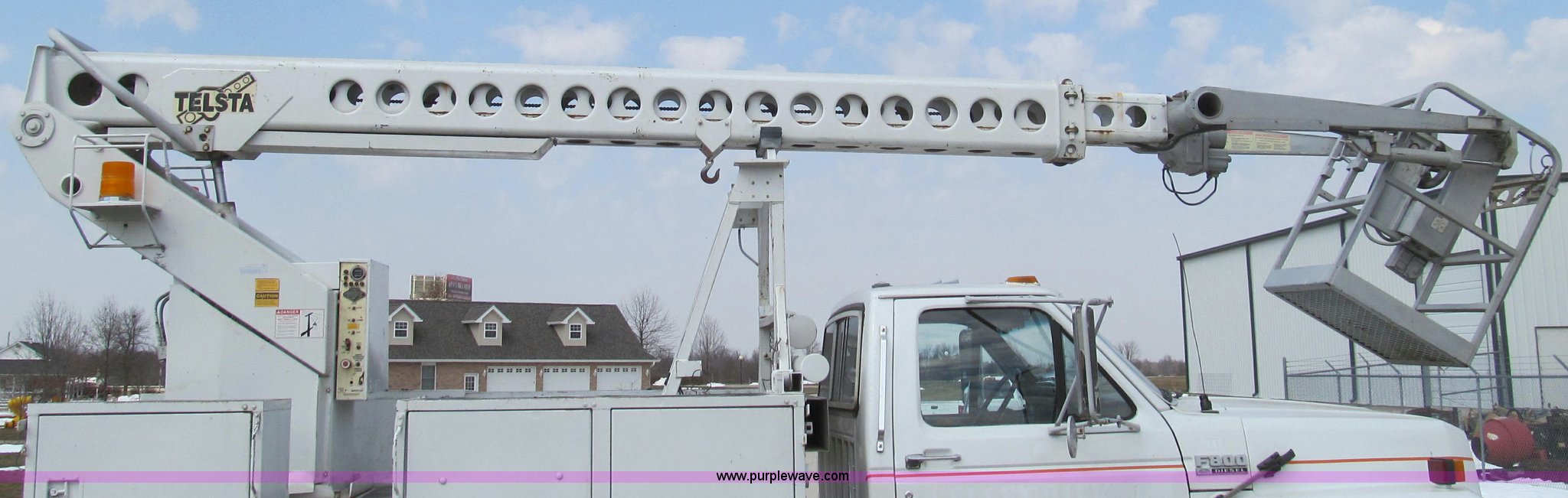 Purple Wave is selling a used Bucket Truck in Missouri. This item is a 1991 Ford F800 bucket truck with the following: 35,486 miles on odometer, Actual mileage unknown, Ford 6.6L six cylinder diesel engine, MT-653 automatic transmission, Heat, AM/FM/cassette, Vinyl interior, Sliding rear window, 1991 Telsta single platform bucket service bed, Model T-40-C, 861 hours on meter, Rear hydraulic cable reel, Electric generation system is inoperable, Hydraulics inoperable, Serial 91400248, 32 gallon fuel tank, Trailer wiring, Pintle hitch, Spring suspension, Air brakes, 11R22.5 tires, GVWR 33,000 lbs, Unit# 237