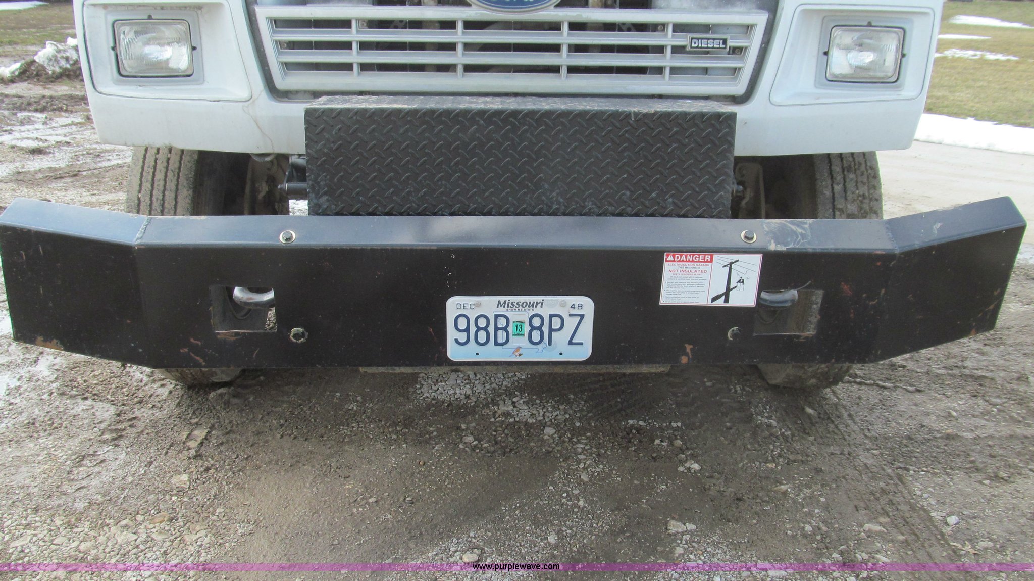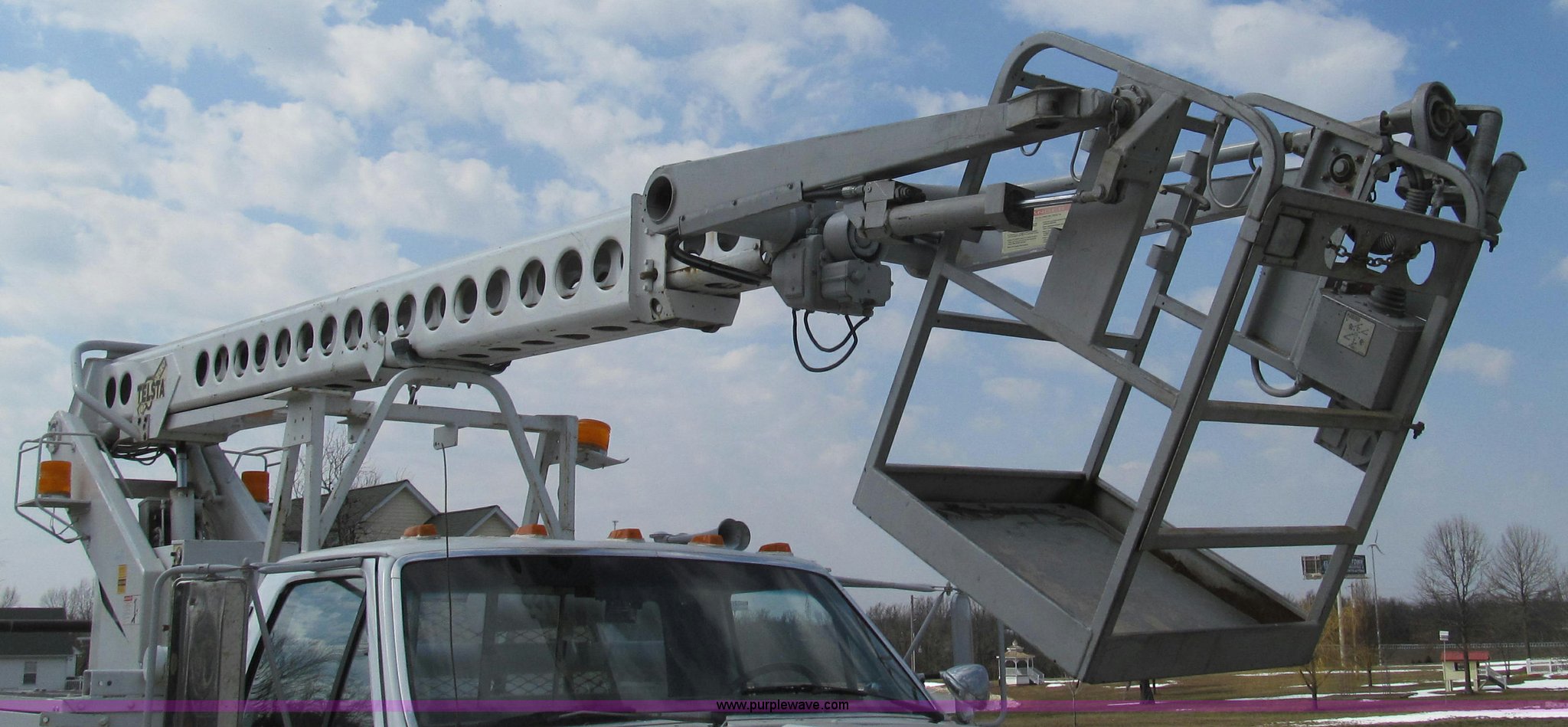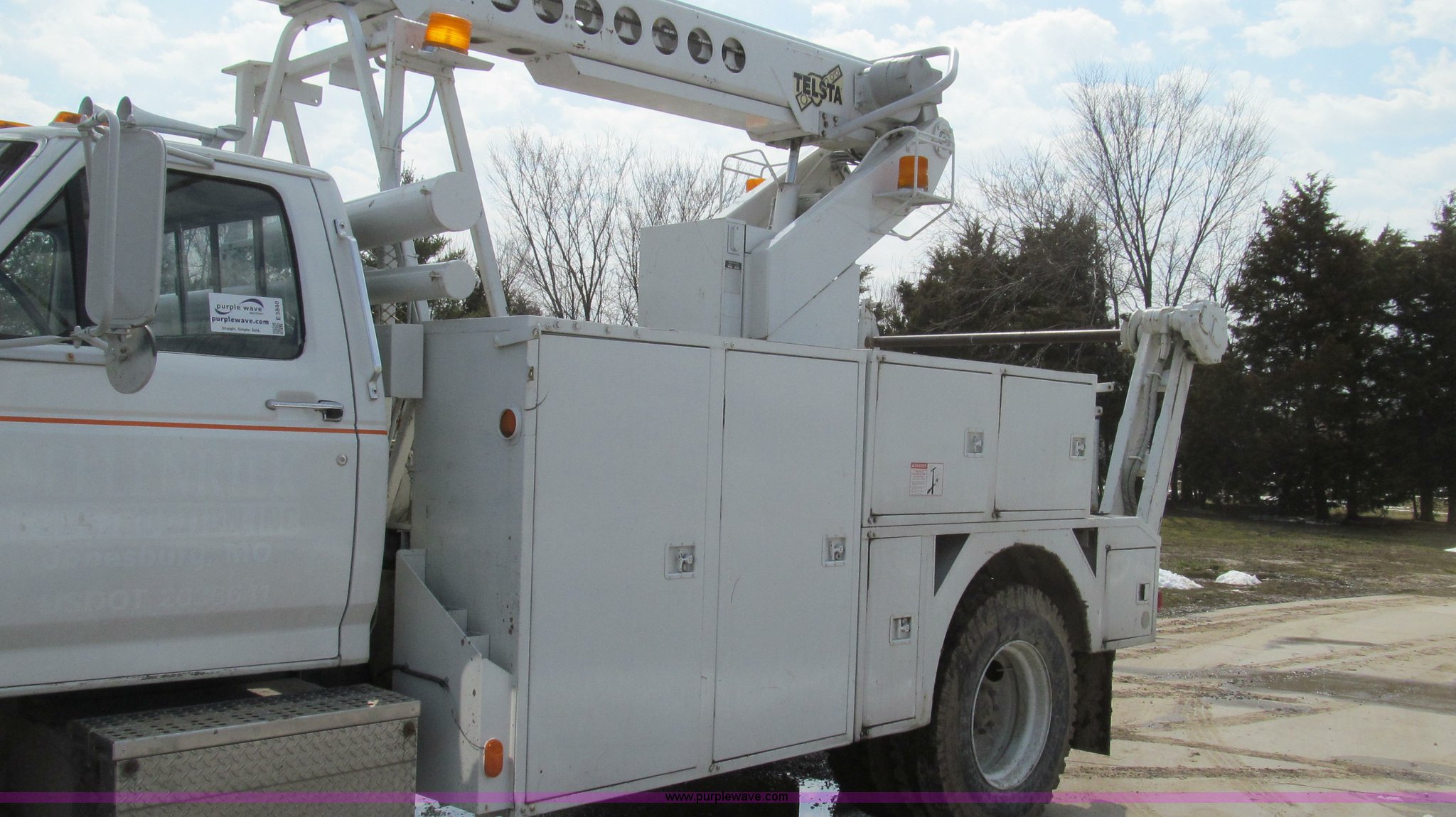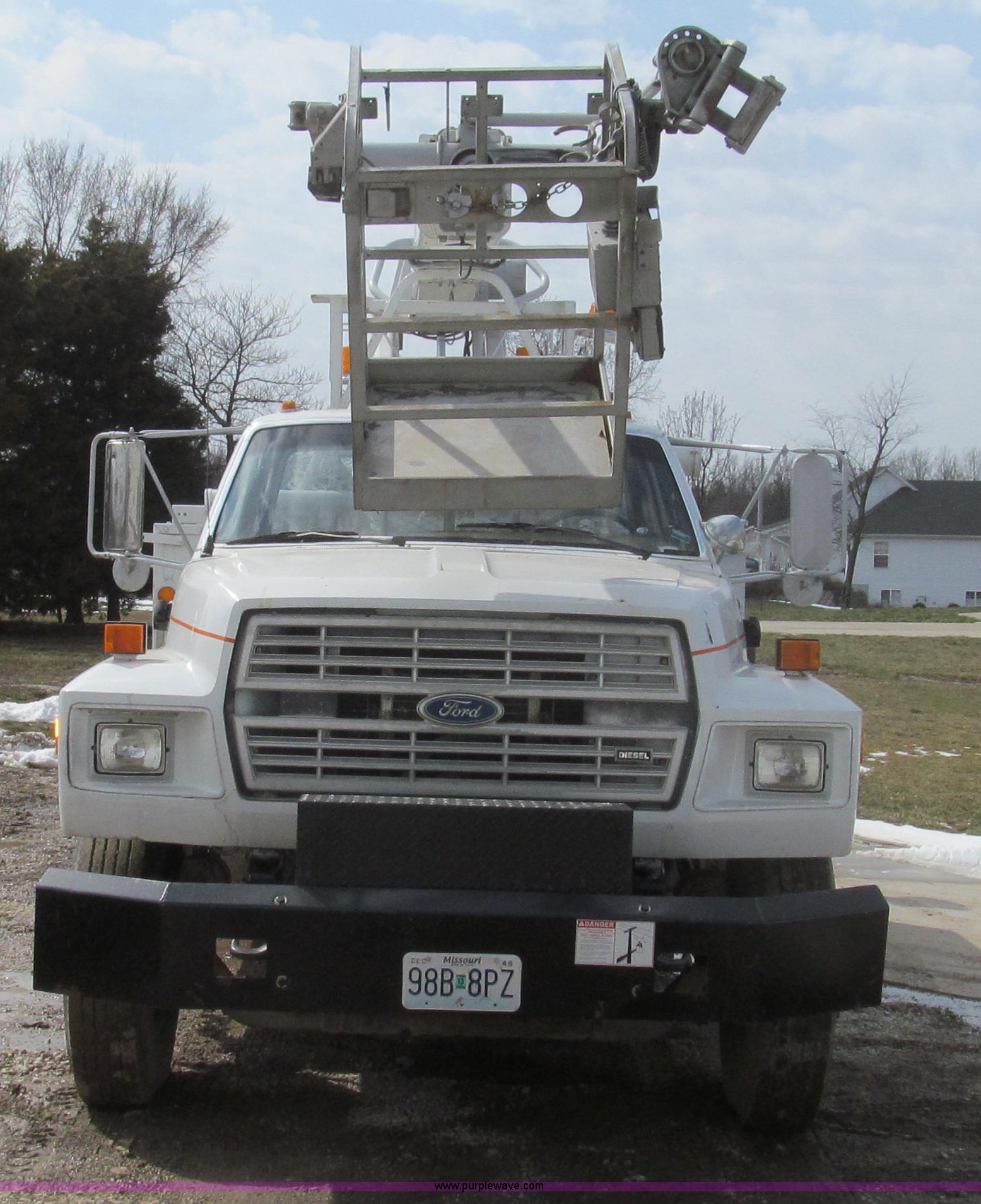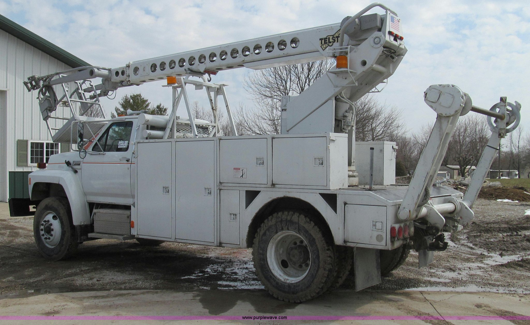 Purple Wave is selling a used Bucket Truck in Missouri. This item is a 1991 Ford F800 bucket truck with the following: 35,486 miles on odometer, Actual mileage unknown, Ford 6.6L six cylinder diesel engine, MT-653 automatic transmission, Heat, AM/FM/cassette, Vinyl interior, Sliding rear window, 1991 Telsta single platform bucket service bed, Model T-40-C, 861 hours on meter, Rear hydraulic cable reel, Electric generation system is inoperable, Hydraulics inoperable, Serial 91400248, 32 gallon fuel tank, Trailer wiring, Pintle hitch, Spring suspension, Air brakes, 11R22.5 tires, GVWR 33,000 lbs, Unit# 237