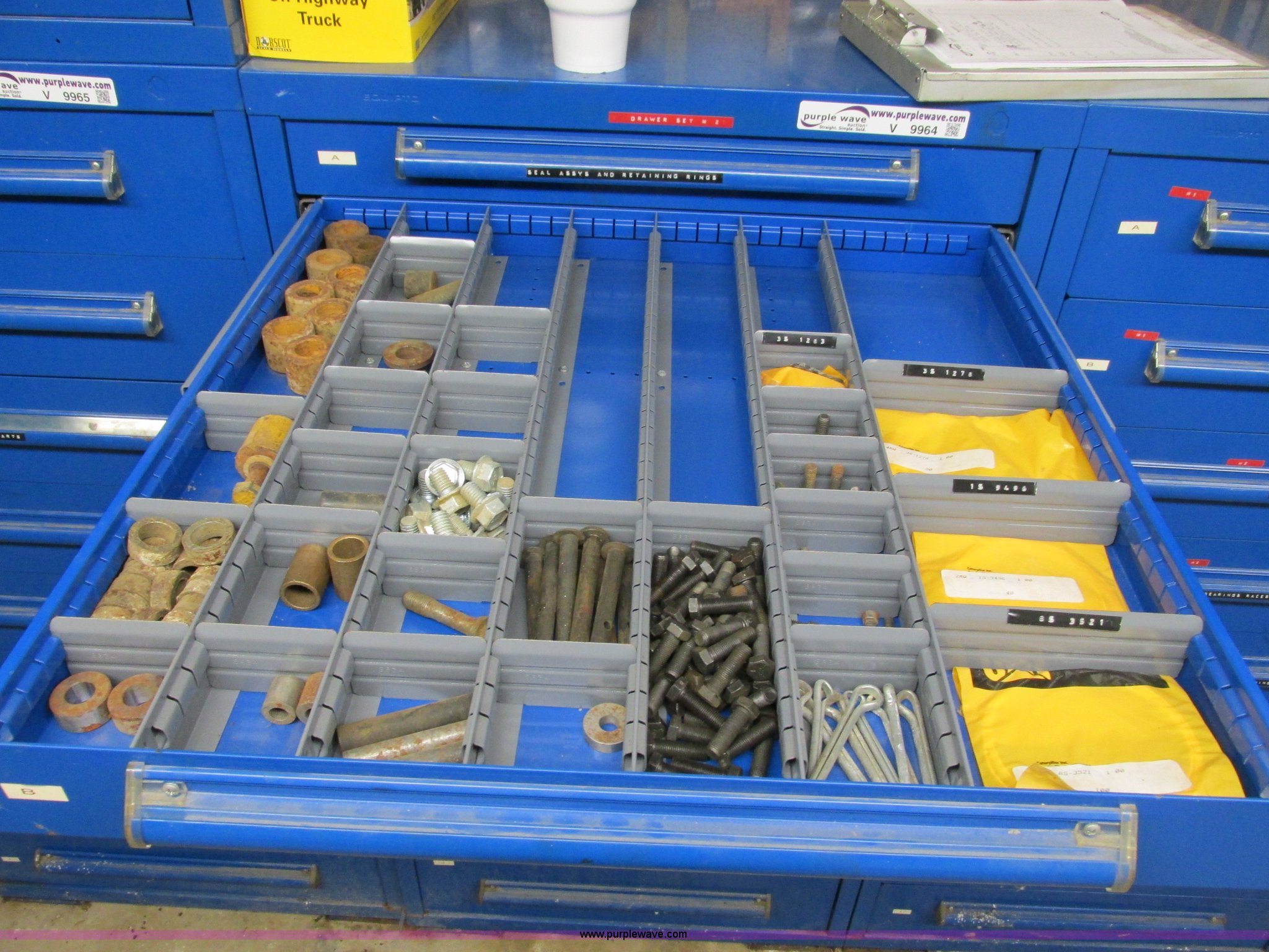 Purple Wave is selling a used Tools in Missouri. This item is a Equipto parts bin and assorted Caterpillar parts with the following: Seals, Spacers, Bolts, Piston sealing rings, Thread repair kits, Assorted gaskets