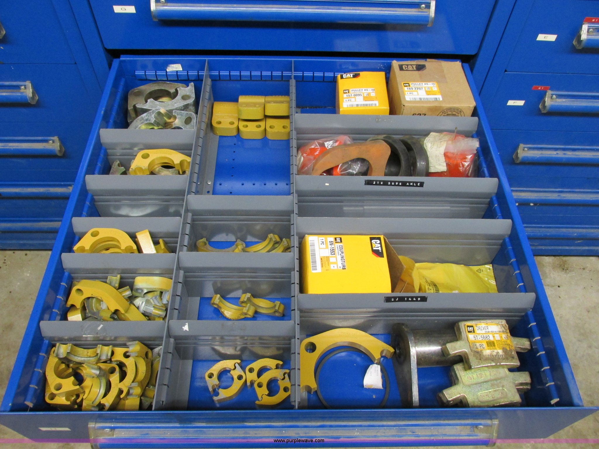 This Equipto parts bin and assorted Caterpillar parts will sell to the highest bidder regardless of price.