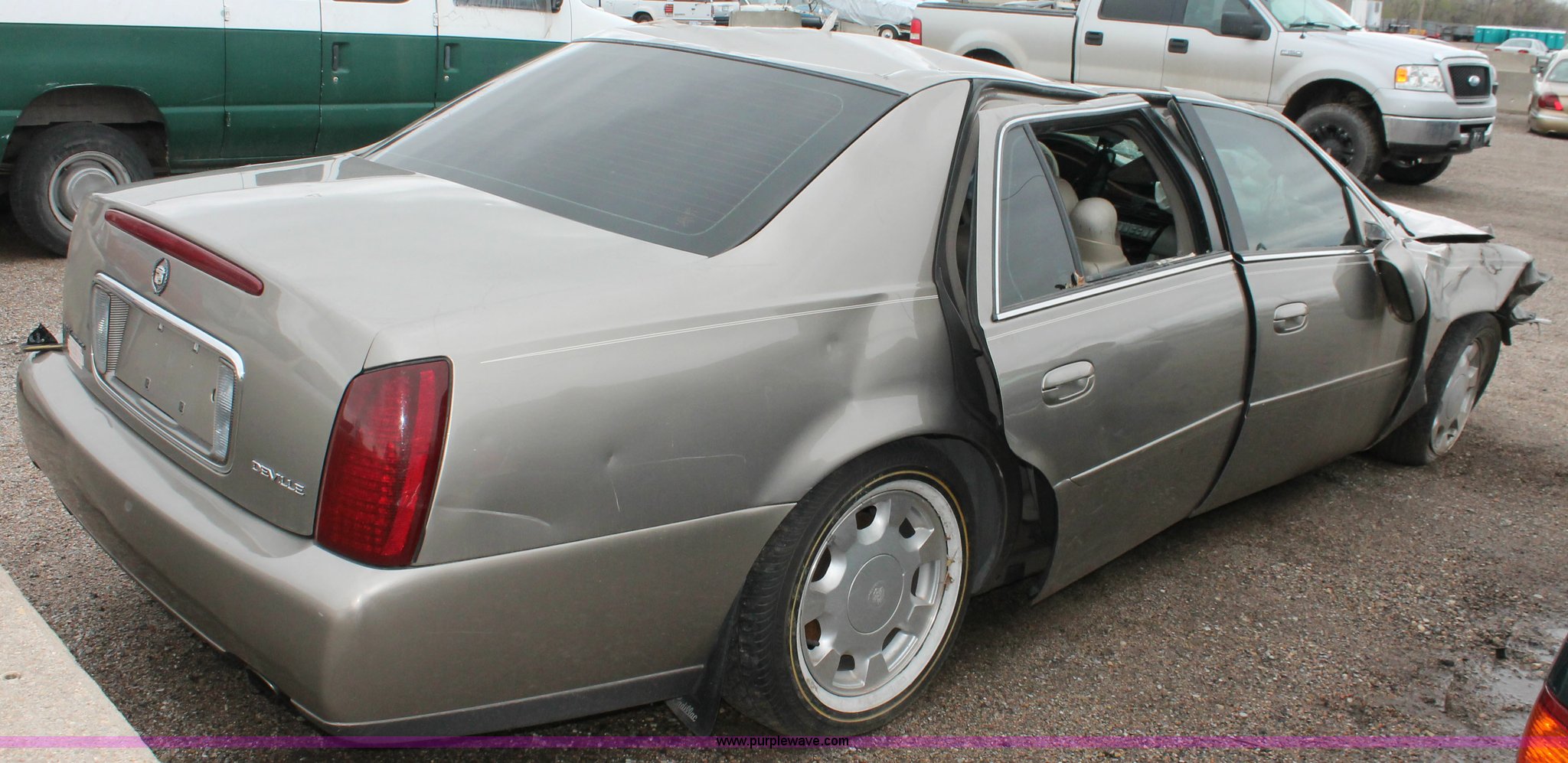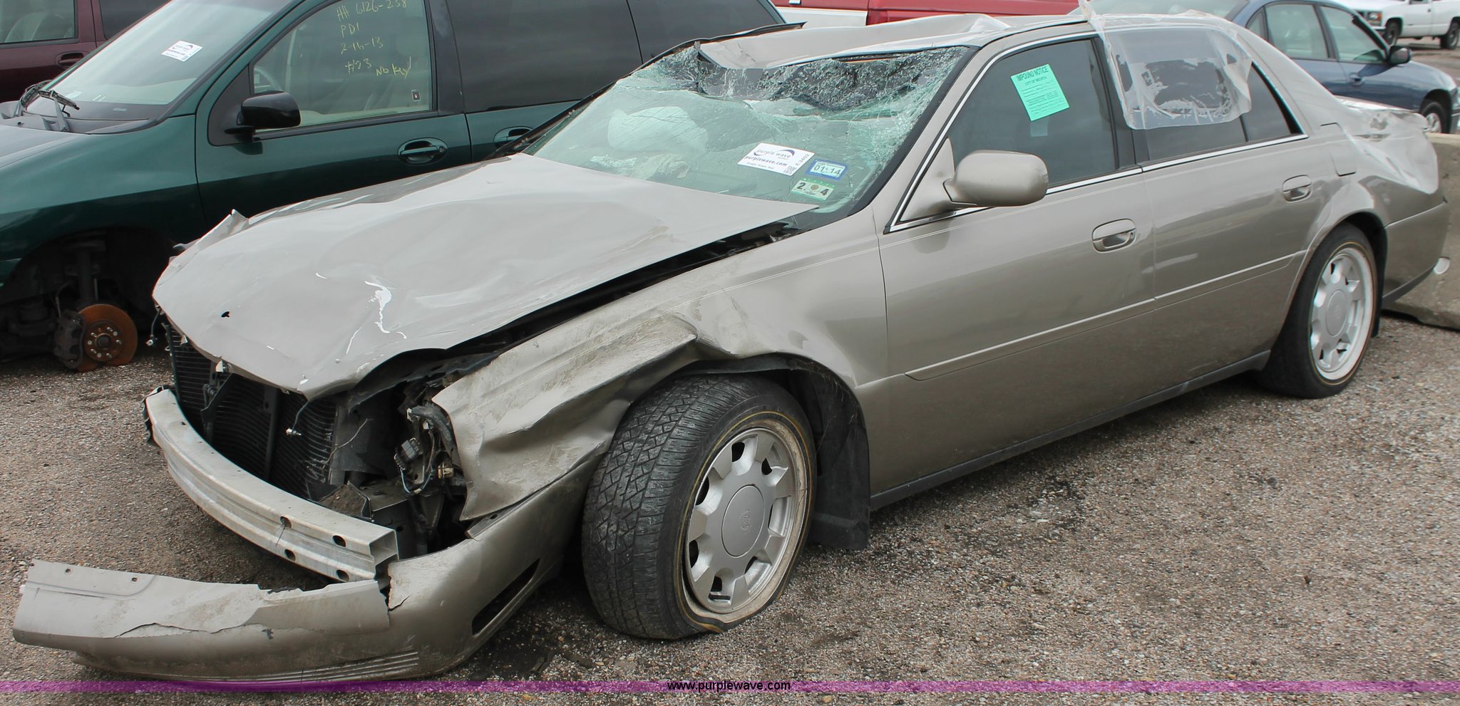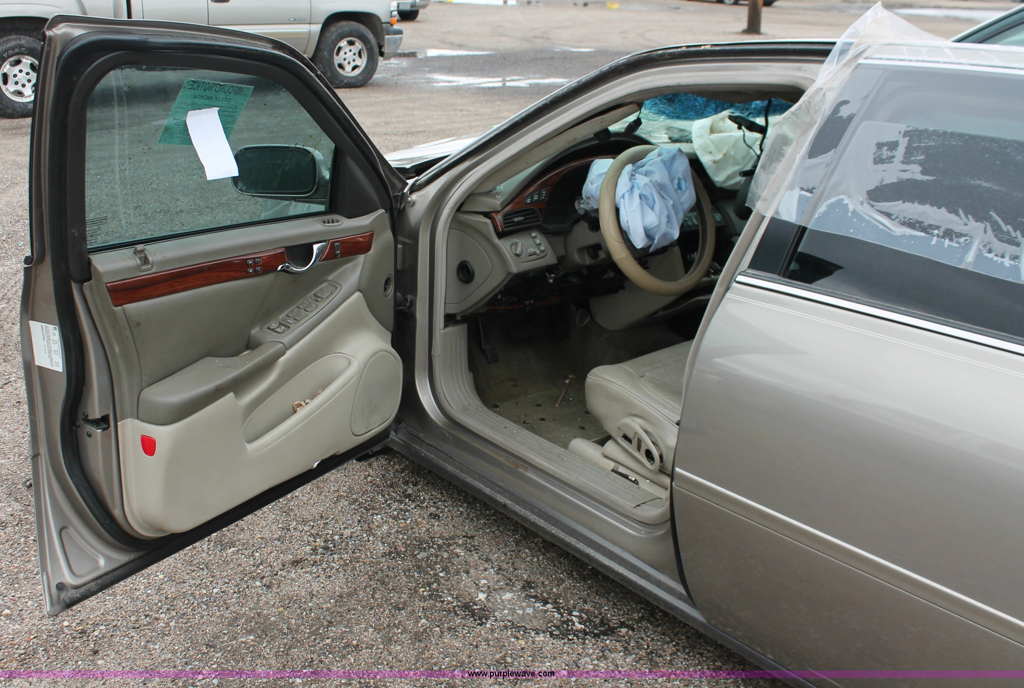 Purple Wave is selling a used Wrecked and Abandoned in Kansas. This item is a 2000 Cadillac DeVille with the following: Unknown miles on odometer, 4.6L V8 DOHC 32V gas engine, Automatic transmission, Leather interior, P235/60R16 tires, Flat tires, Interior damage, Air bags deployed, Exterior body damage, Front end damage, Roof damage, Passenger door hinge damaged, Case# 13C010638