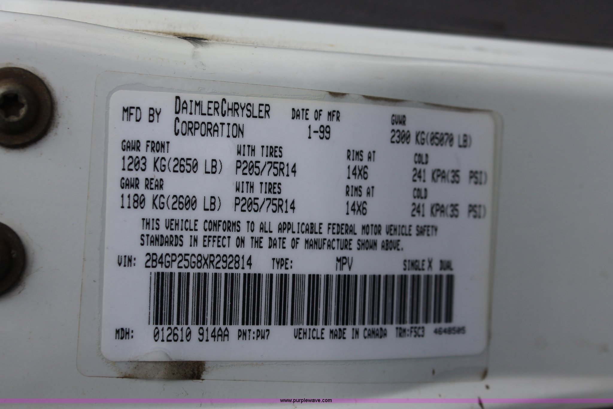 Purple Wave is selling a used Wrecked and Abandoned in Kansas. This item is a 1999 Dodge Caravan van with the following: Mileage unknown, 3.3L V6 OHV 12V gas engine, Automatic transmission, AM/FM, 205/70R14 tires, Front end damage, Case# 13C11518