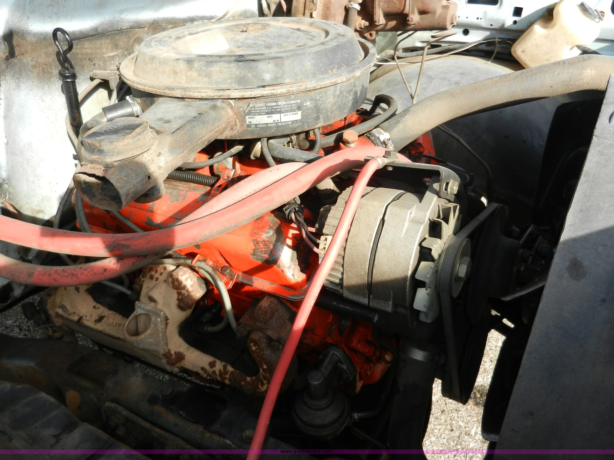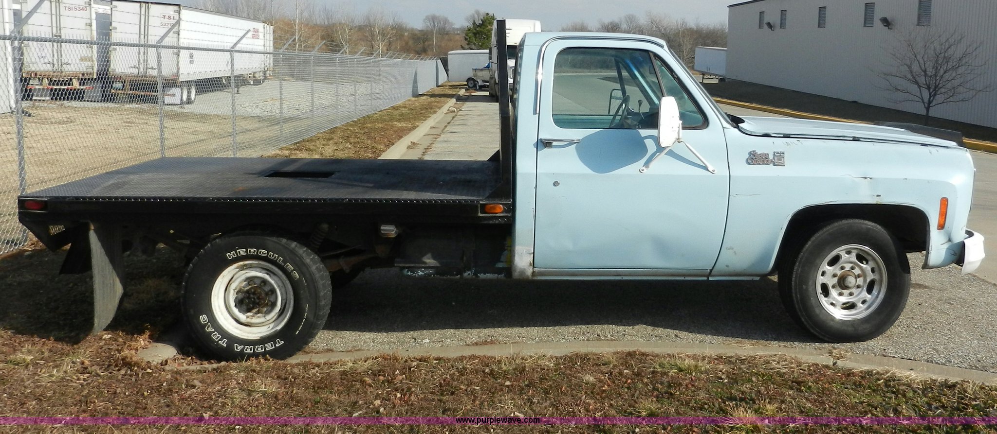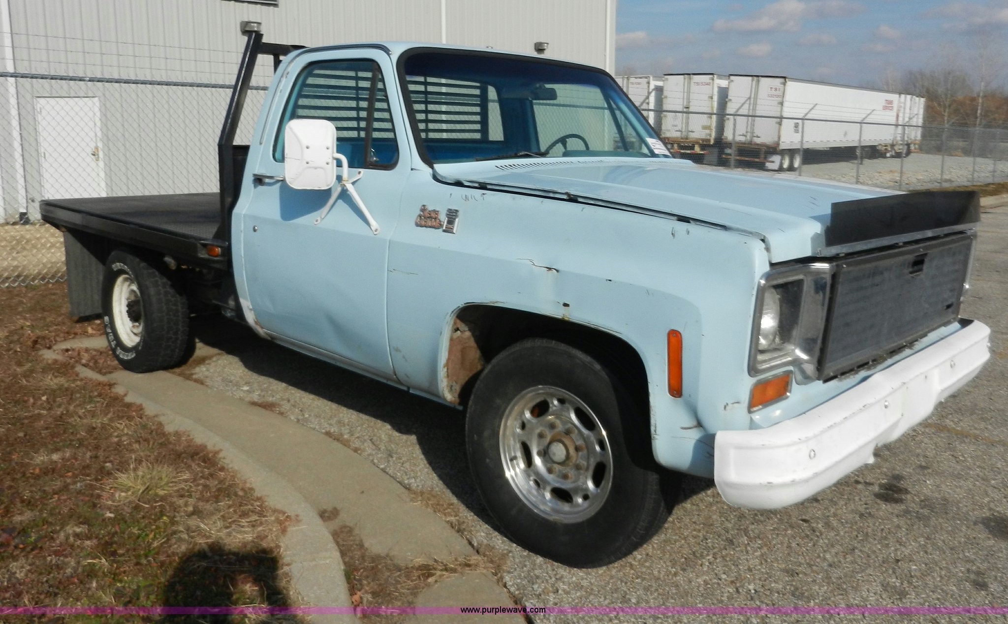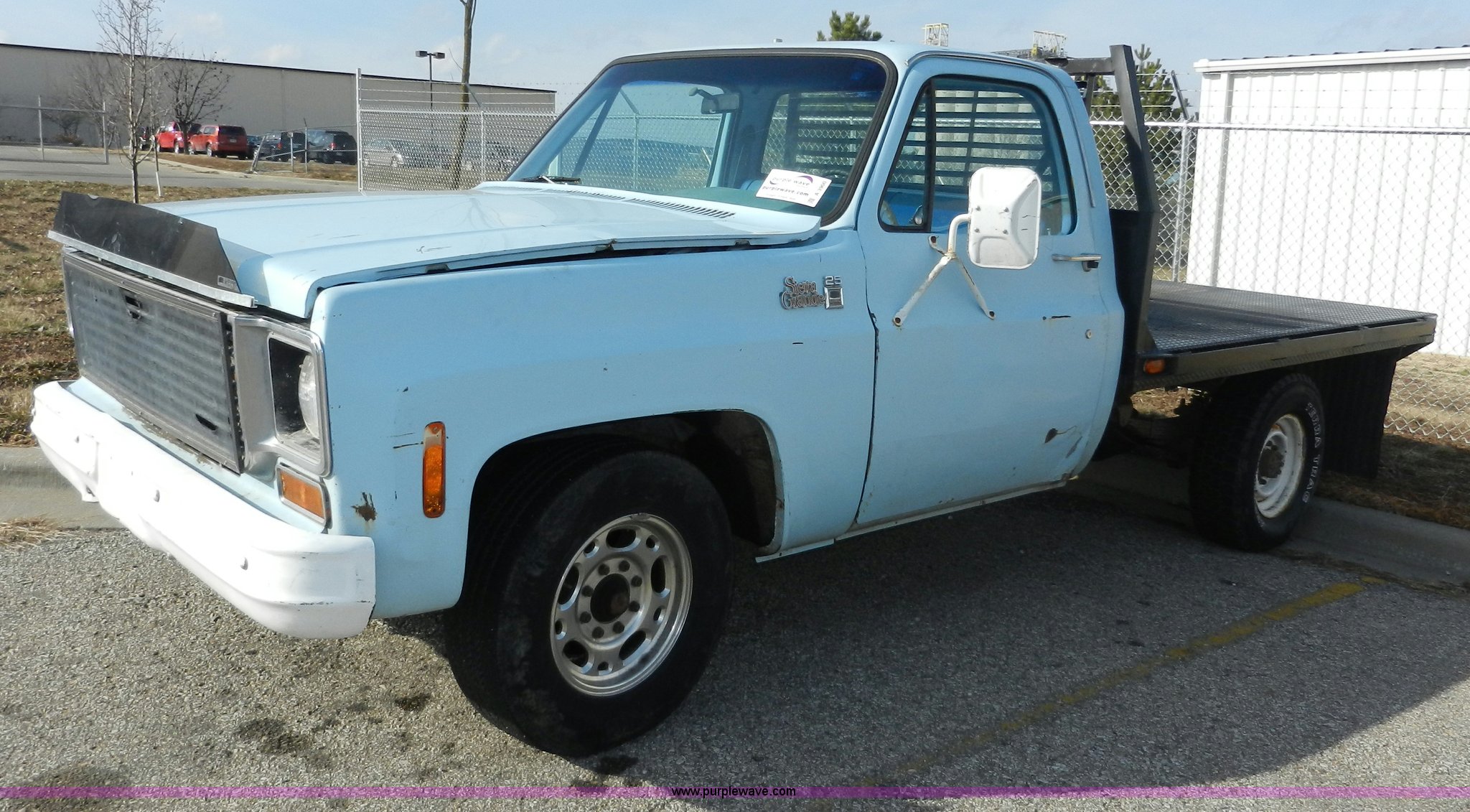 Purple Wave is selling a used Passenger Vehicle in Kansas. This item is a 1977 GMC Sierra Grande 25 flabed pickup truck with the following: 24,530 miles on odometer, Not Actual Mileage, Gas engine, Automatic transmission, Recently replaced, Heat, AM/FM, Manual windows, locks, Vinyl interior, 101" x 81" flatbed, Gooseneck ball, Side slot for rails, Bug guard, Ball hitch, 265/75R16 tires, Interior/exterior cosmetic damage, Missing driver side interior window crank, Cracked dash, Dents and scratches, Hood will not close properly, Body rust