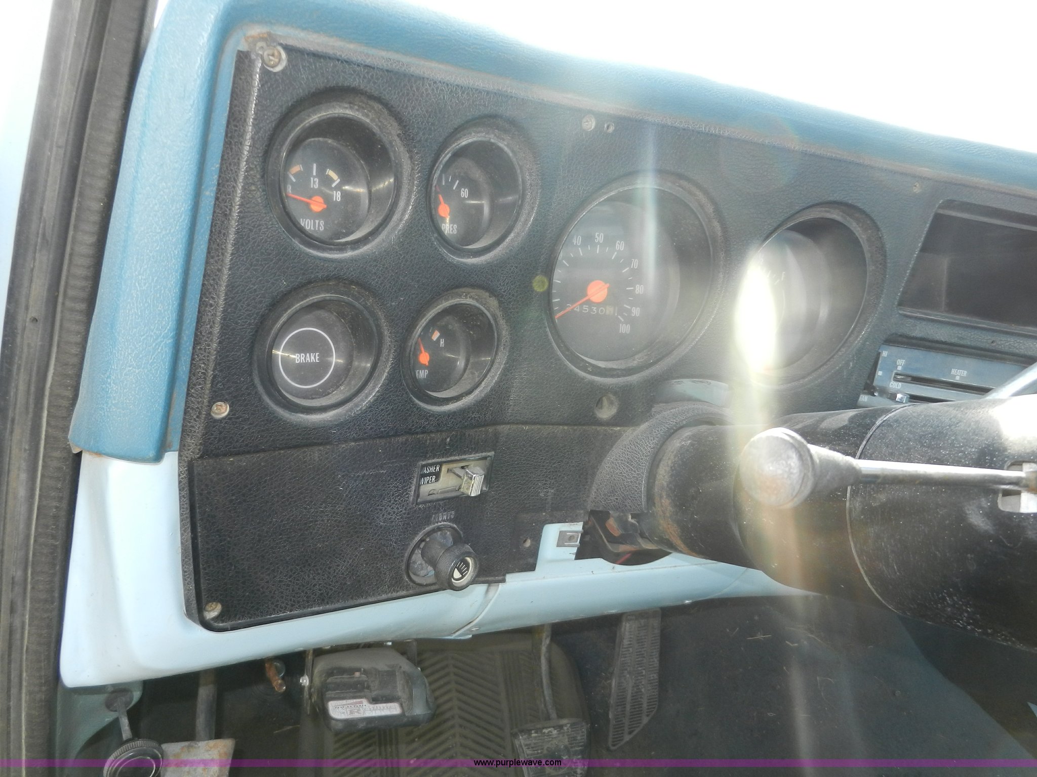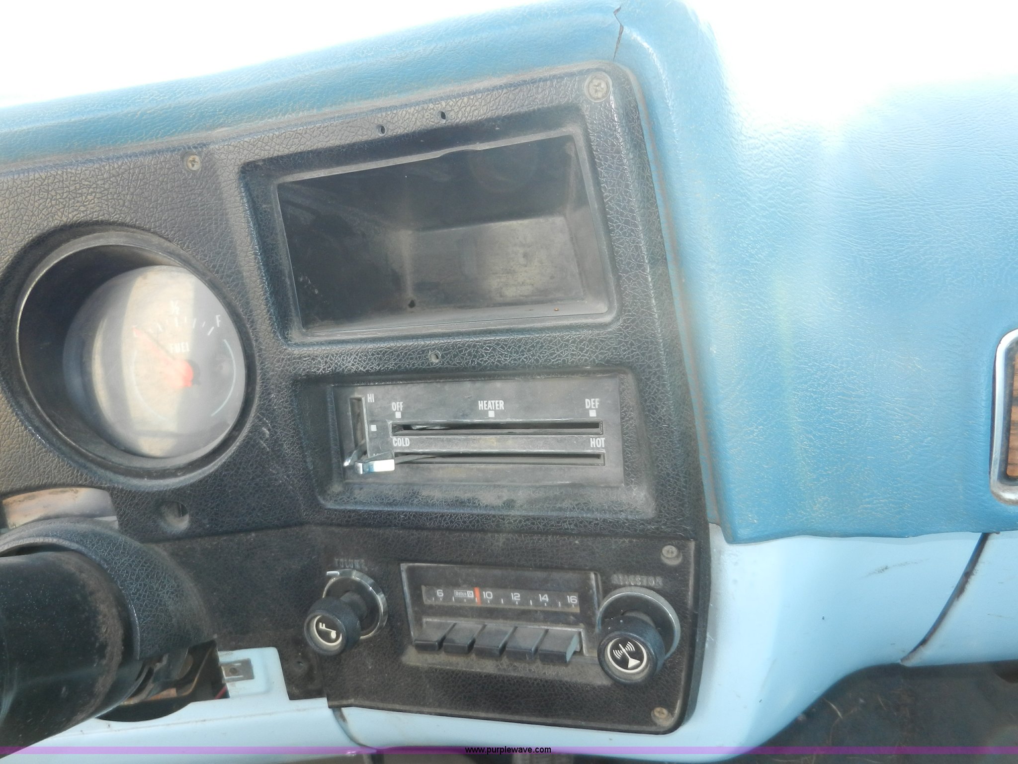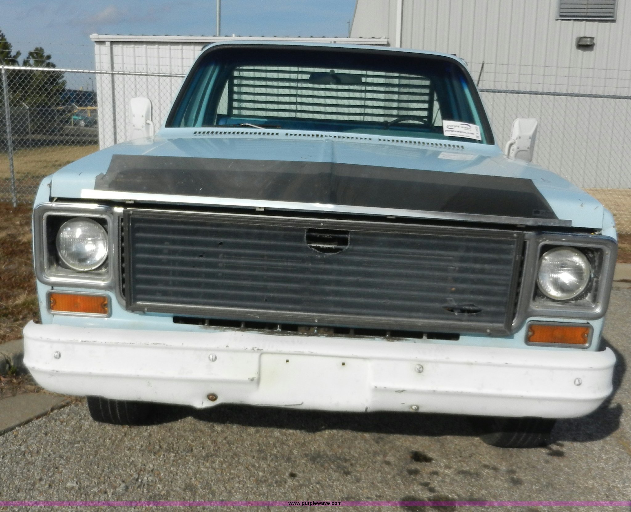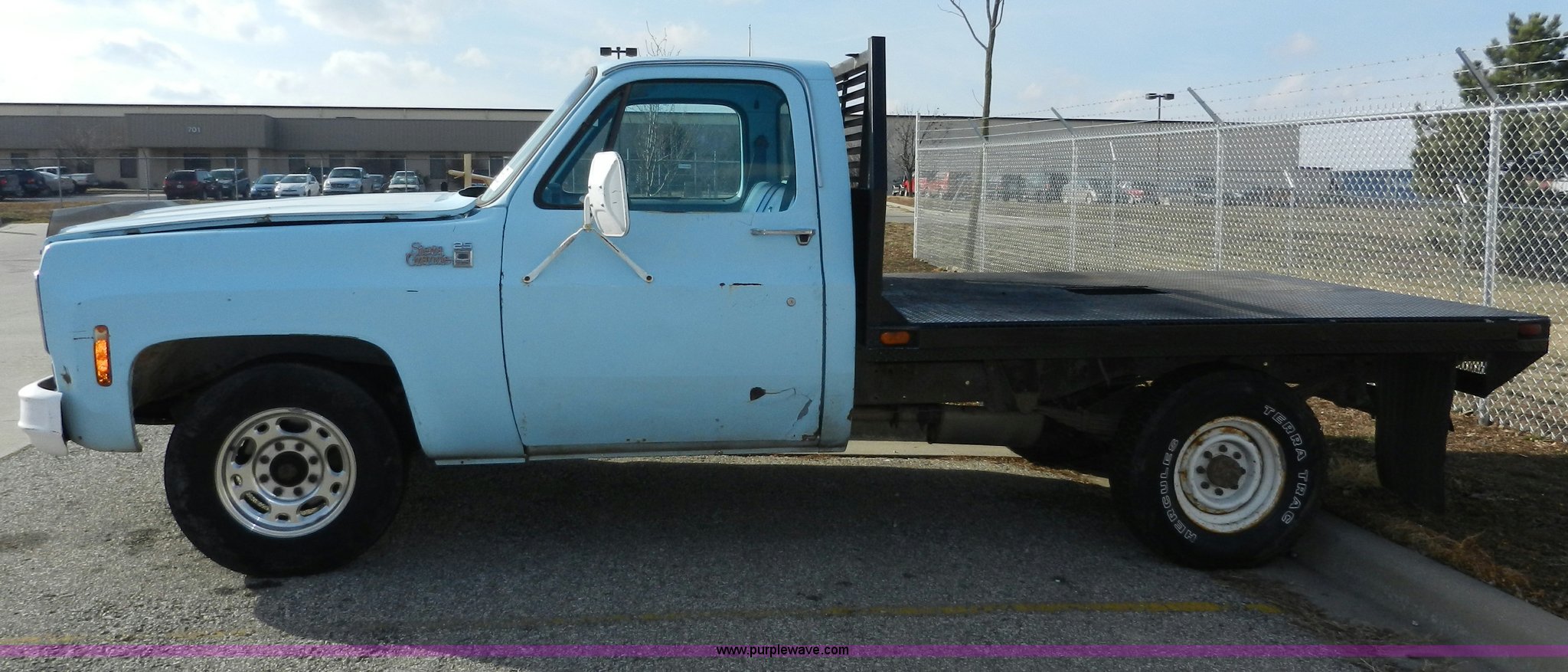 Purple Wave is selling a used Passenger Vehicle in Kansas. This item is a 1977 GMC Sierra Grande 25 flabed pickup truck with the following: 24,530 miles on odometer, Not Actual Mileage, Gas engine, Automatic transmission, Recently replaced, Heat, AM/FM, Manual windows, locks, Vinyl interior, 101" x 81" flatbed, Gooseneck ball, Side slot for rails, Bug guard, Ball hitch, 265/75R16 tires, Interior/exterior cosmetic damage, Missing driver side interior window crank, Cracked dash, Dents and scratches, Hood will not close properly, Body rust