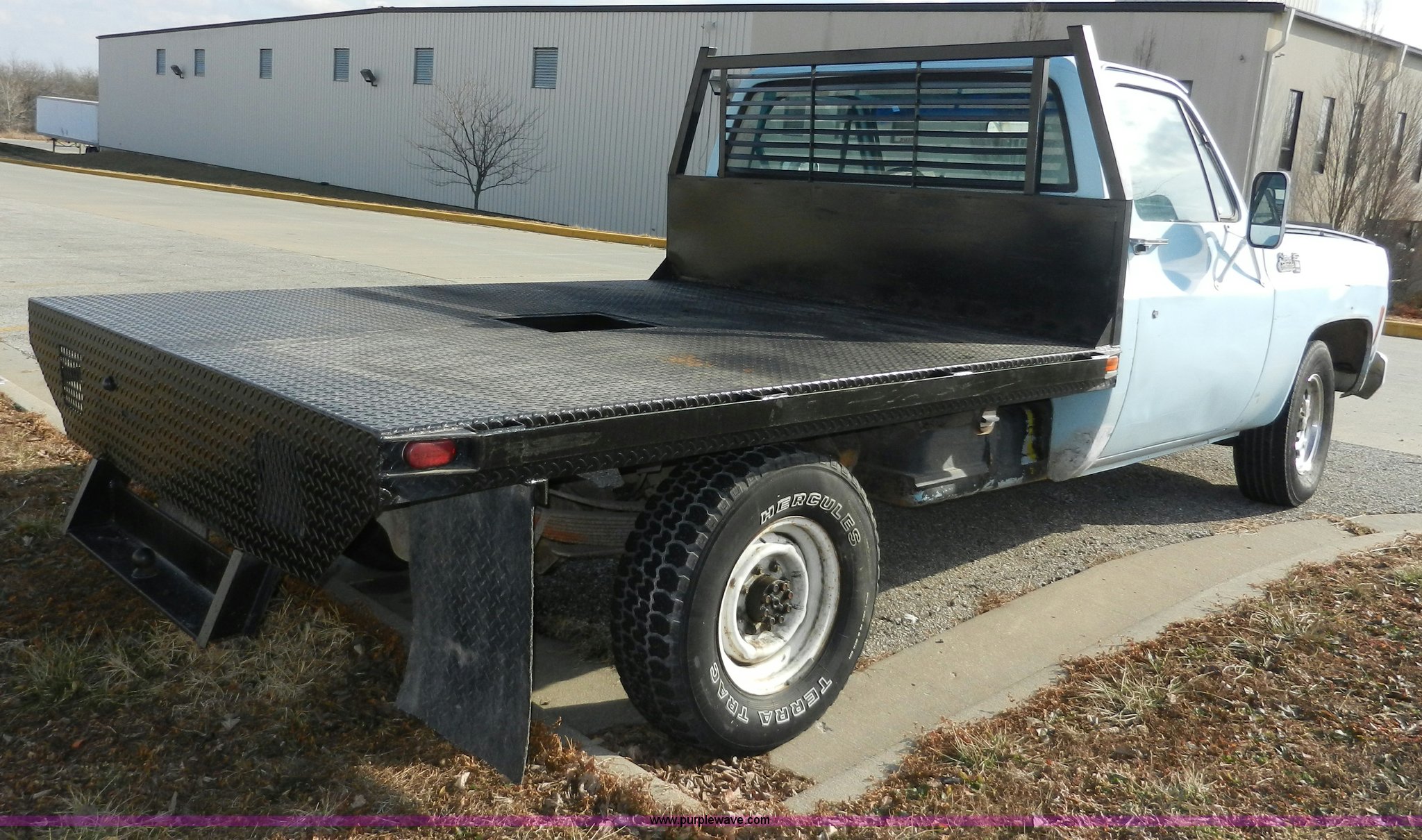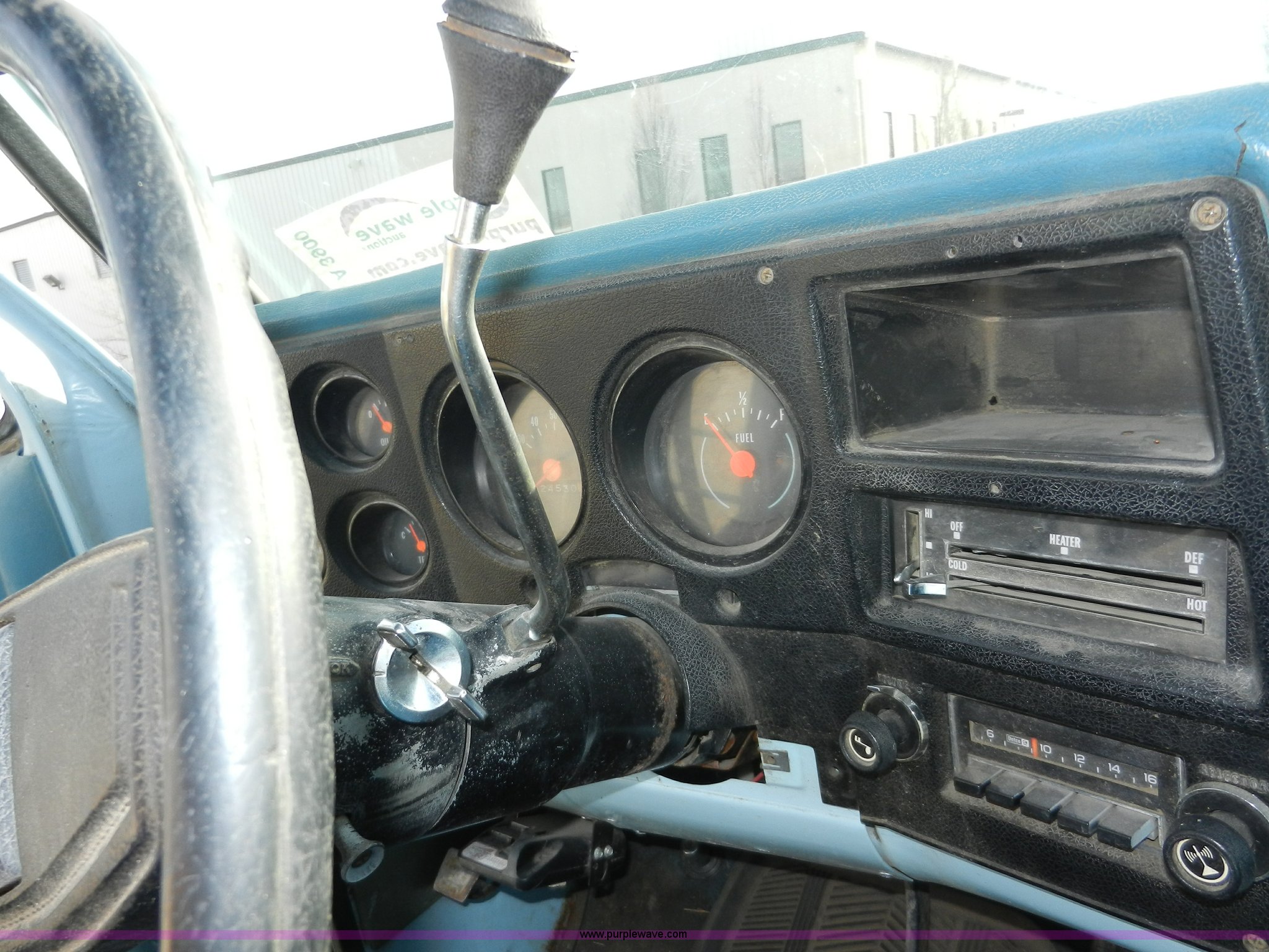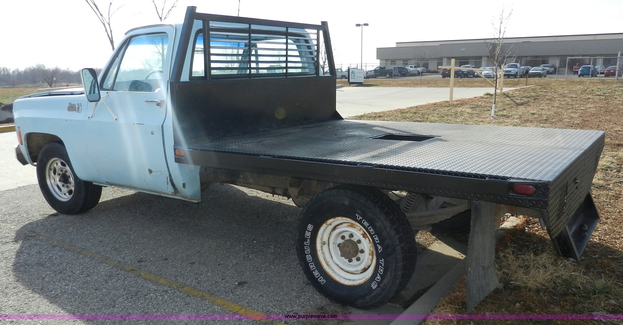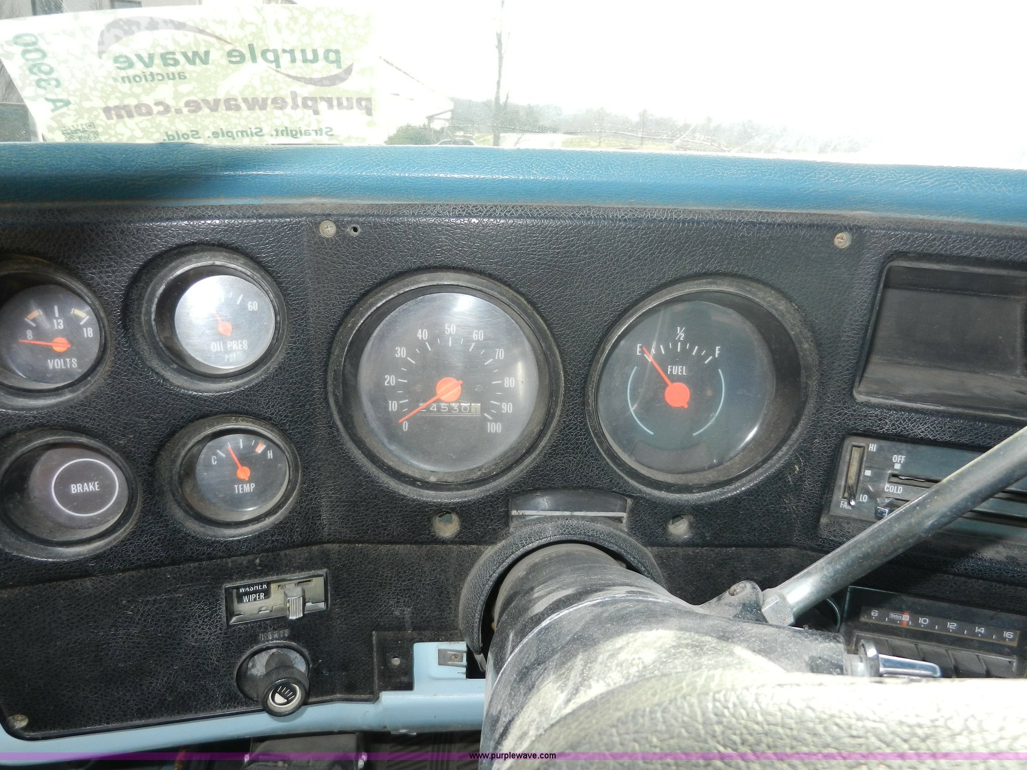 Purple Wave is selling a used Passenger Vehicle in Kansas. This item is a 1977 GMC Sierra Grande 25 flabed pickup truck with the following: 24,530 miles on odometer, Not Actual Mileage, Gas engine, Automatic transmission, Recently replaced, Heat, AM/FM, Manual windows, locks, Vinyl interior, 101" x 81" flatbed, Gooseneck ball, Side slot for rails, Bug guard, Ball hitch, 265/75R16 tires, Interior/exterior cosmetic damage, Missing driver side interior window crank, Cracked dash, Dents and scratches, Hood will not close properly, Body rust