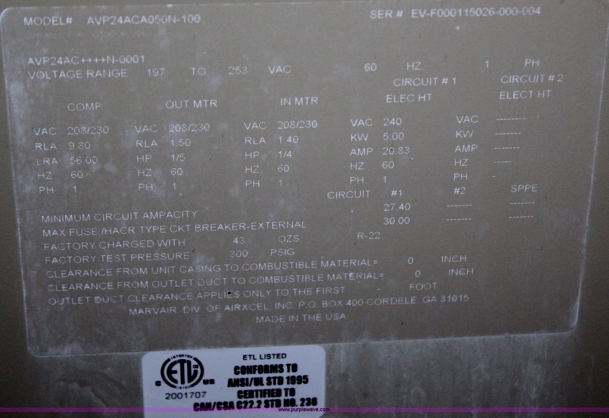 Purple Wave is selling a used Appliances in Kansas. This item is a Marvair Compac I air conditioner and heater with the following: 24,000 BTU, 220V, Can be used for semi trailers