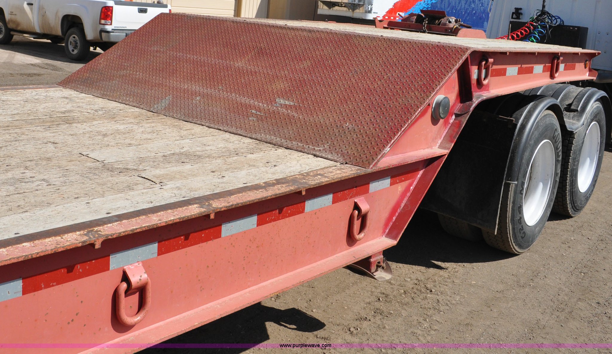 Purple Wave is selling a used Equip. Trailer in Colorado. This item is a 1998 Load King tandem axle equipment trailer with the following: 48' overall length folded, 8' x 96" top deck, 3' x 96" front slope, 8.5' x 96 main folding tail, 3.5' x 96" flip out tail, Hydraulic dovetail, Wood/steel deck, Hydraulic winch/cable/hook, D-ring tie-downs, Air brakes, Air suspension, 235/75R17.5 tires