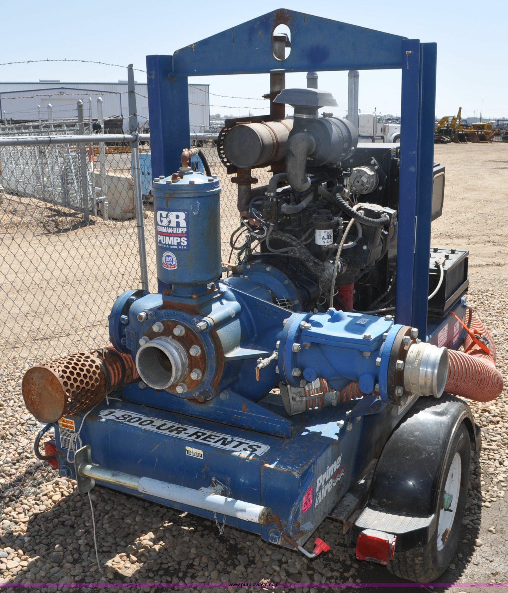 Purple Wave is selling a used Pump in Colorado. This item is a 2006 Gorman Rupp 6" water pump with the following: 1,697 actual hours, John Deere 4045 diesel engine, Serial PE4045D725134, Murphy engine safety controls, Lift point, Swing-Flex back flow preventer, 20' suction hose with screen, Prime Aire primer, Pintle hook, 6" aluminum camel lock pump hose fittings