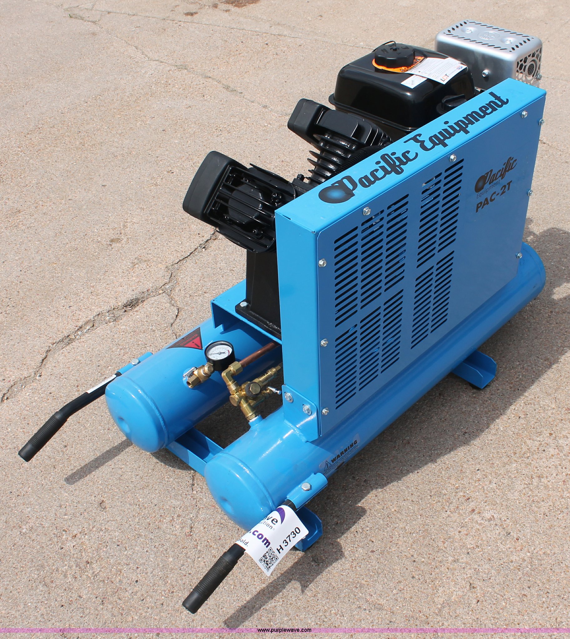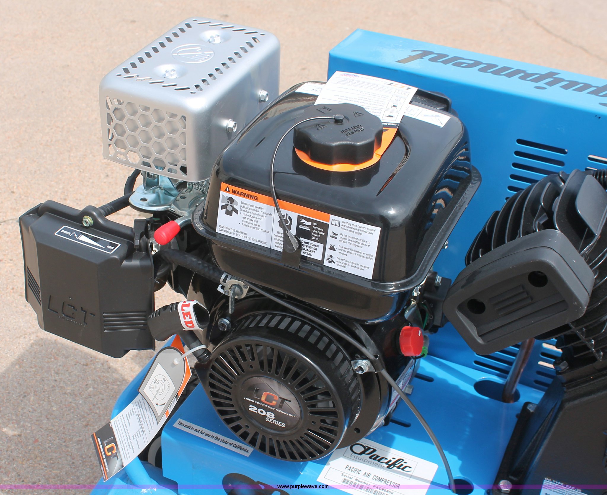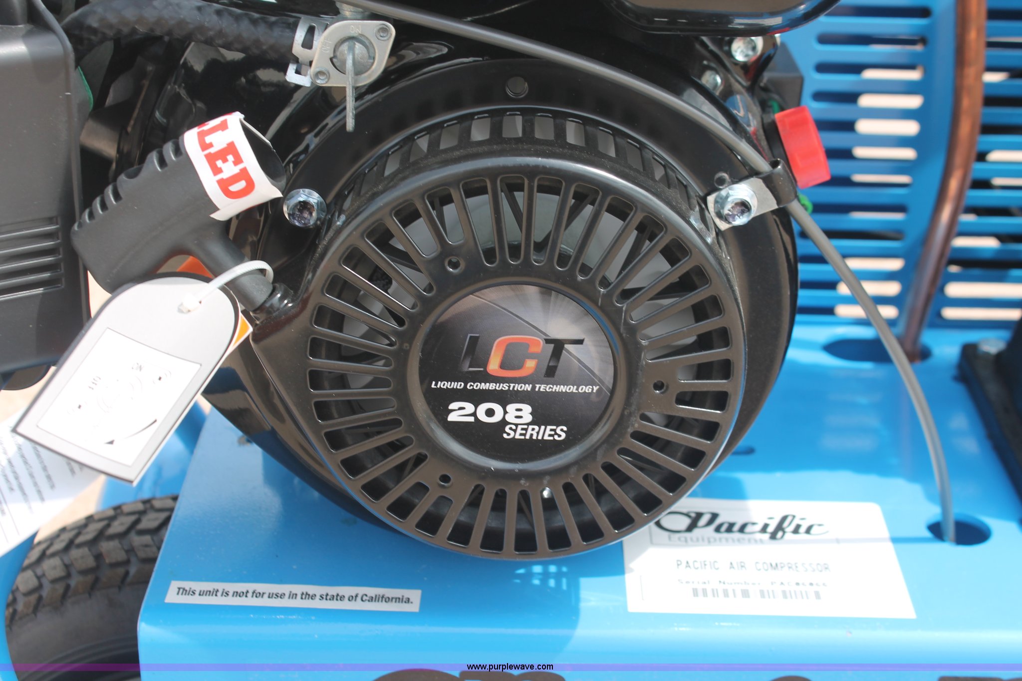 Pacific PAC-2T eight gallon air compressor. LCT 208 series gas engine, 125 psi, Unused, Serial PAC06066. Shipping quotes available. 139 S Kansas. Haven, KS 67543