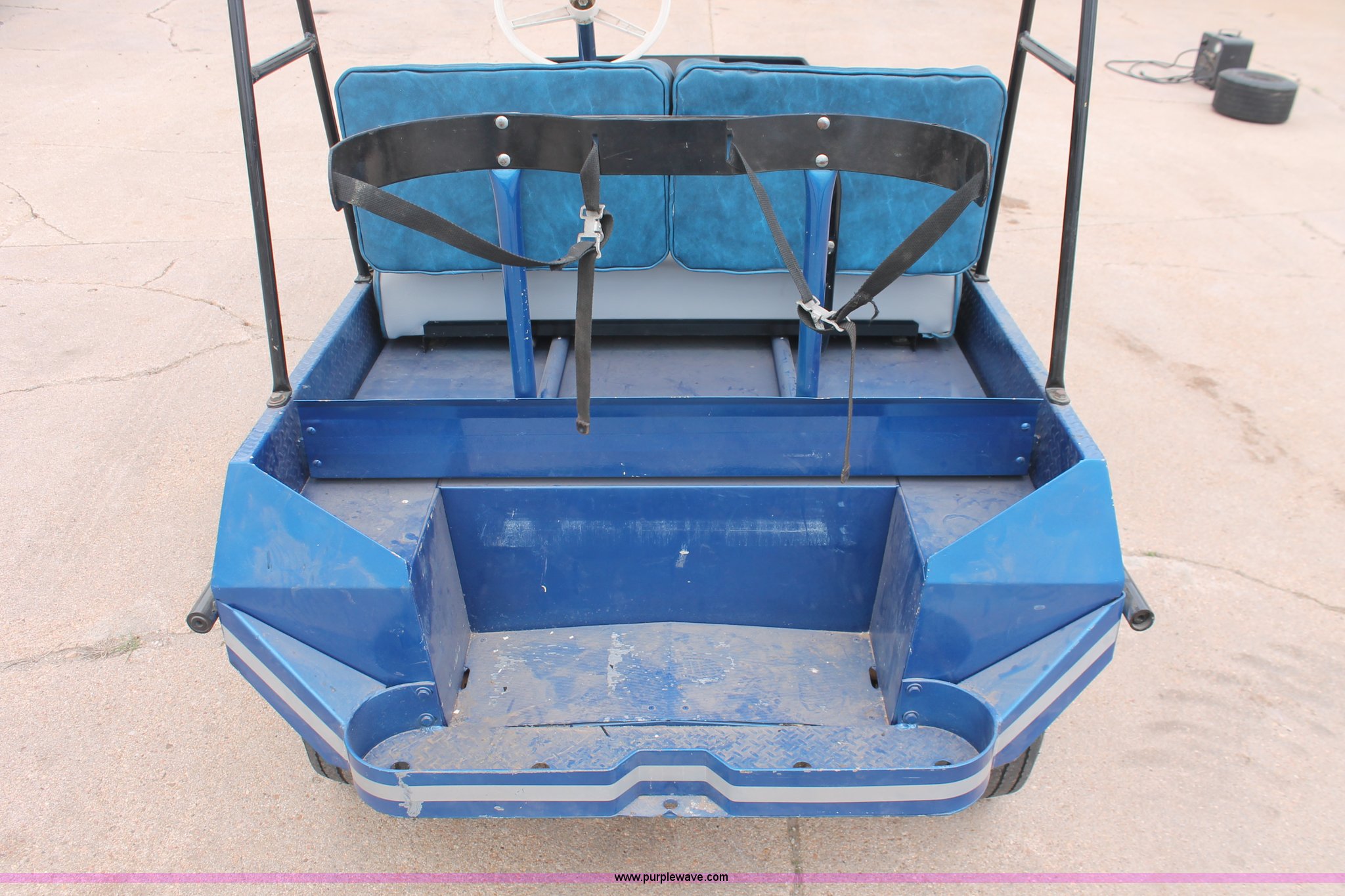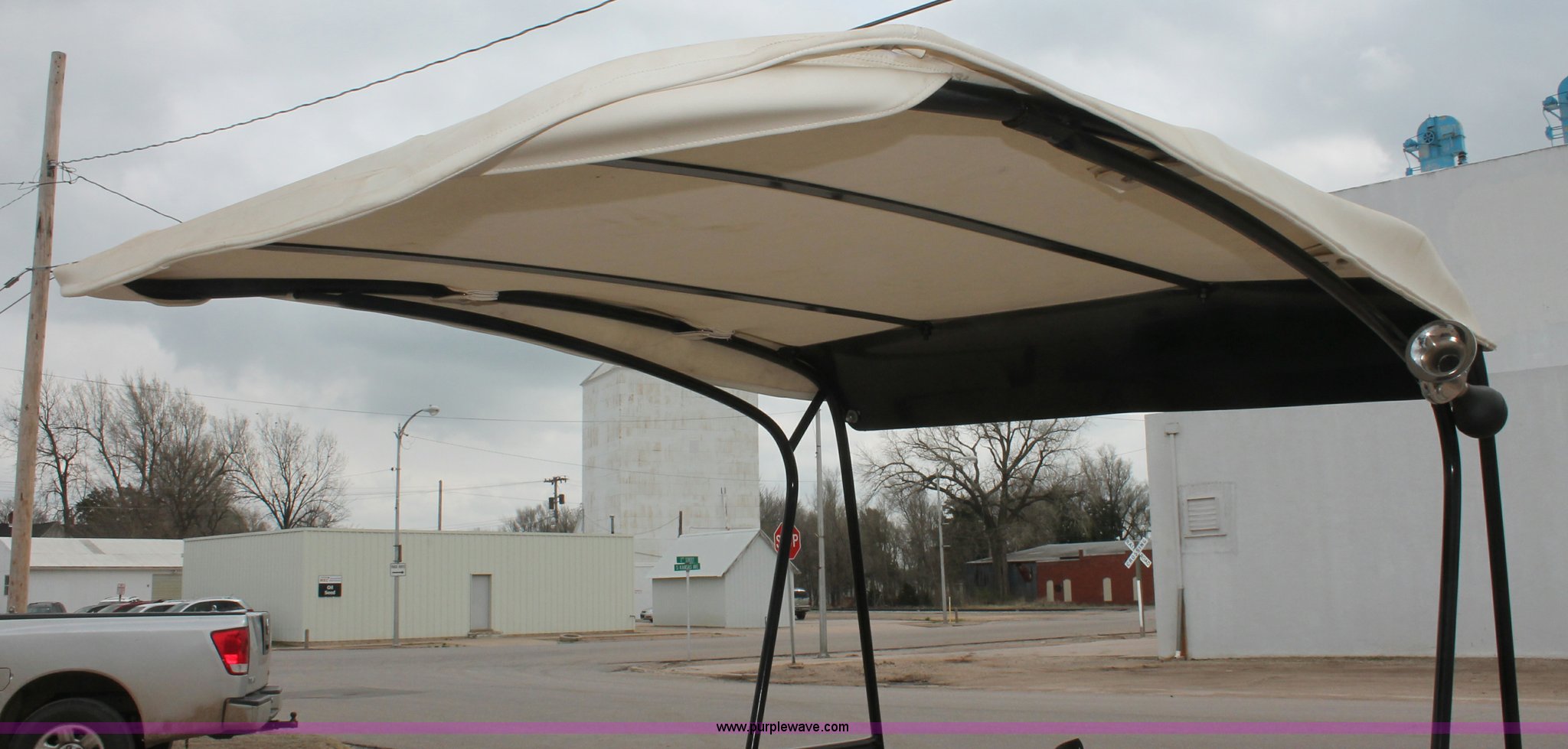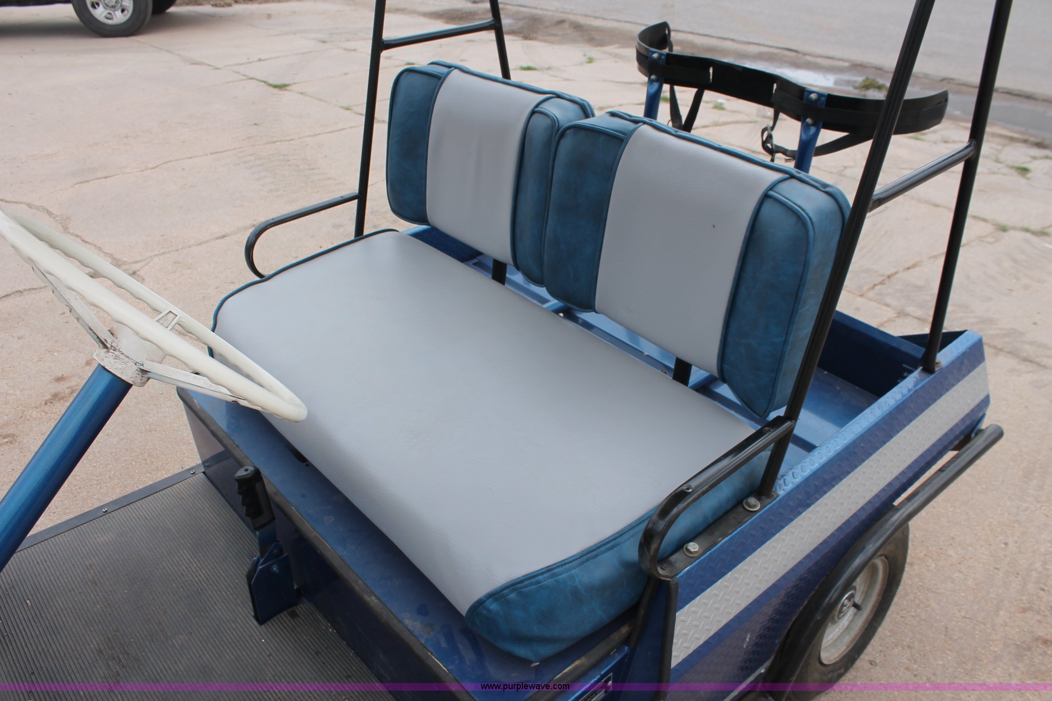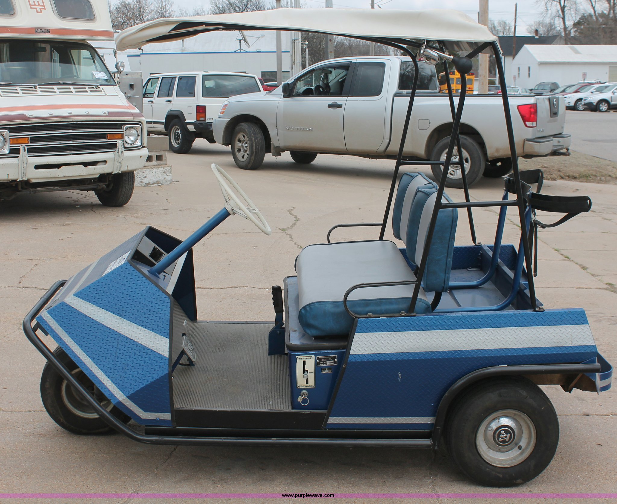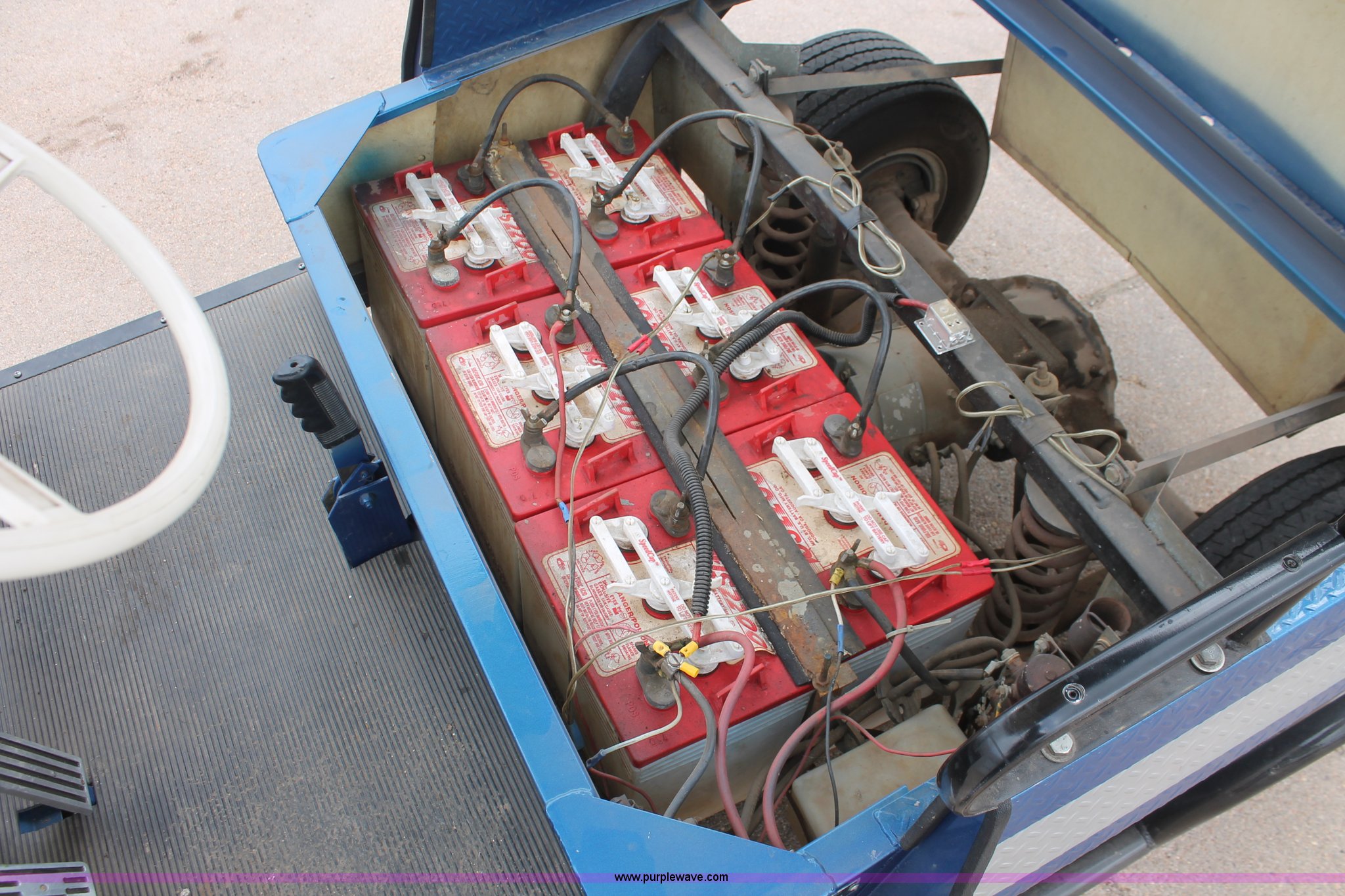 Purple Wave is selling a used Golf Cart in Kansas. This item is a Westinghouse 437 electric golf cart with the following: Forward/reverse, Soft top canopy, (6) batteries, Charging unit, Three wheel design, Club caddie, 18x8.50-8NHS tires, Spare tire, Previously wired with stereo system, Serial 421266