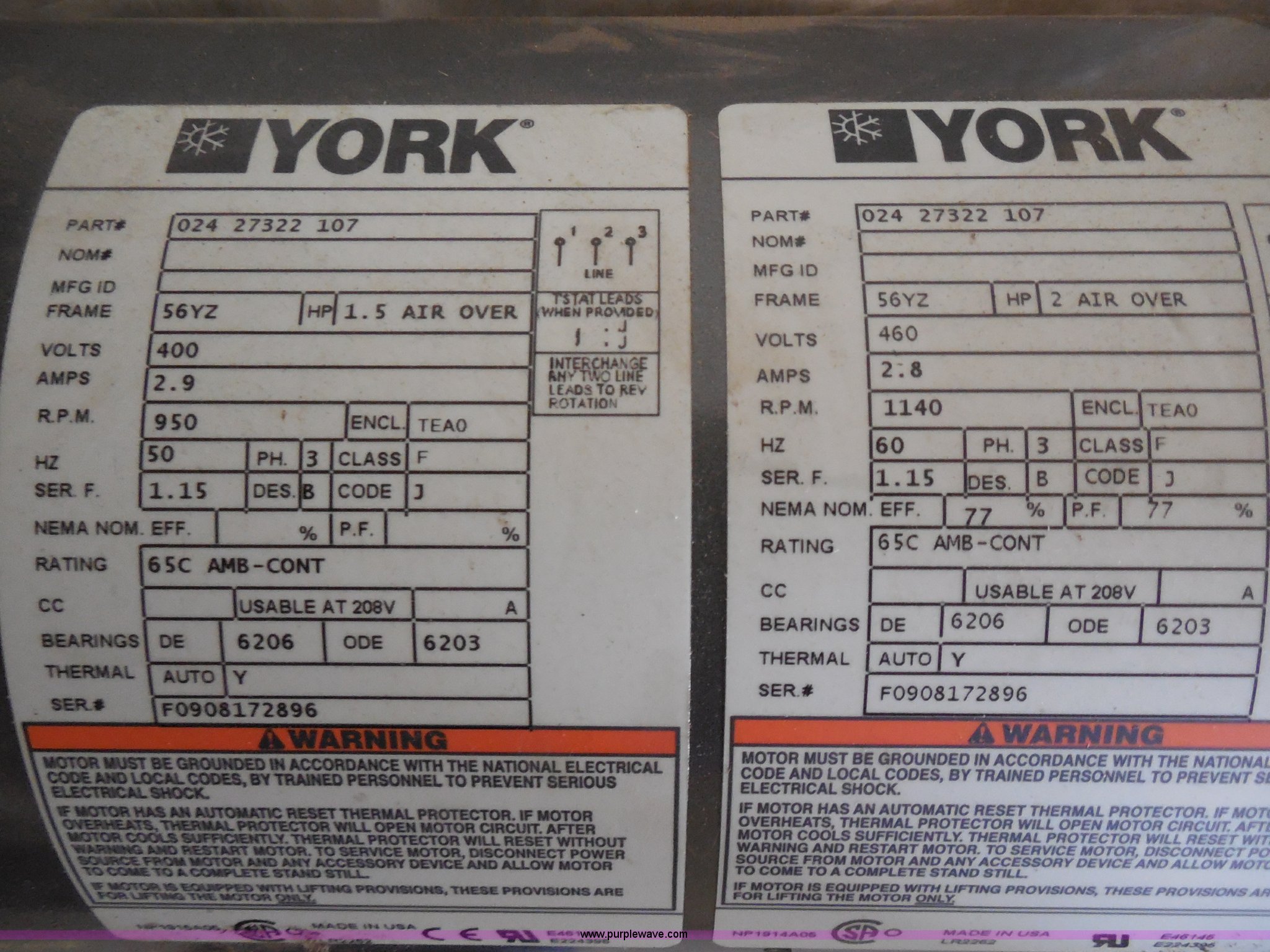 Purple Wave is selling a used Tools in Kansas. This item is a (2) electric motors with the following: Baldor JPM3311T, Spec. 37F197X54, 7.5 HP, 230/460V, 22/11 amps, York D2427322107, 460V, 1,140 RPM, Serial F0908172896