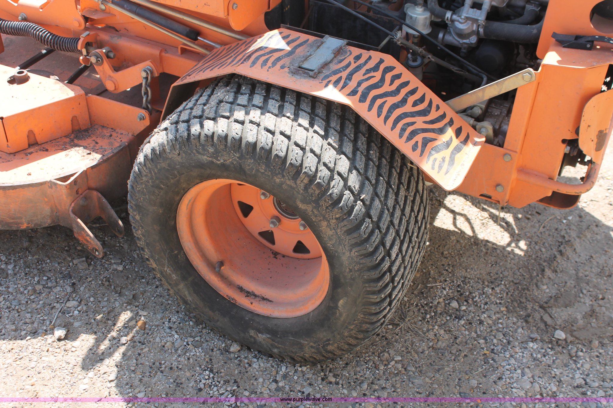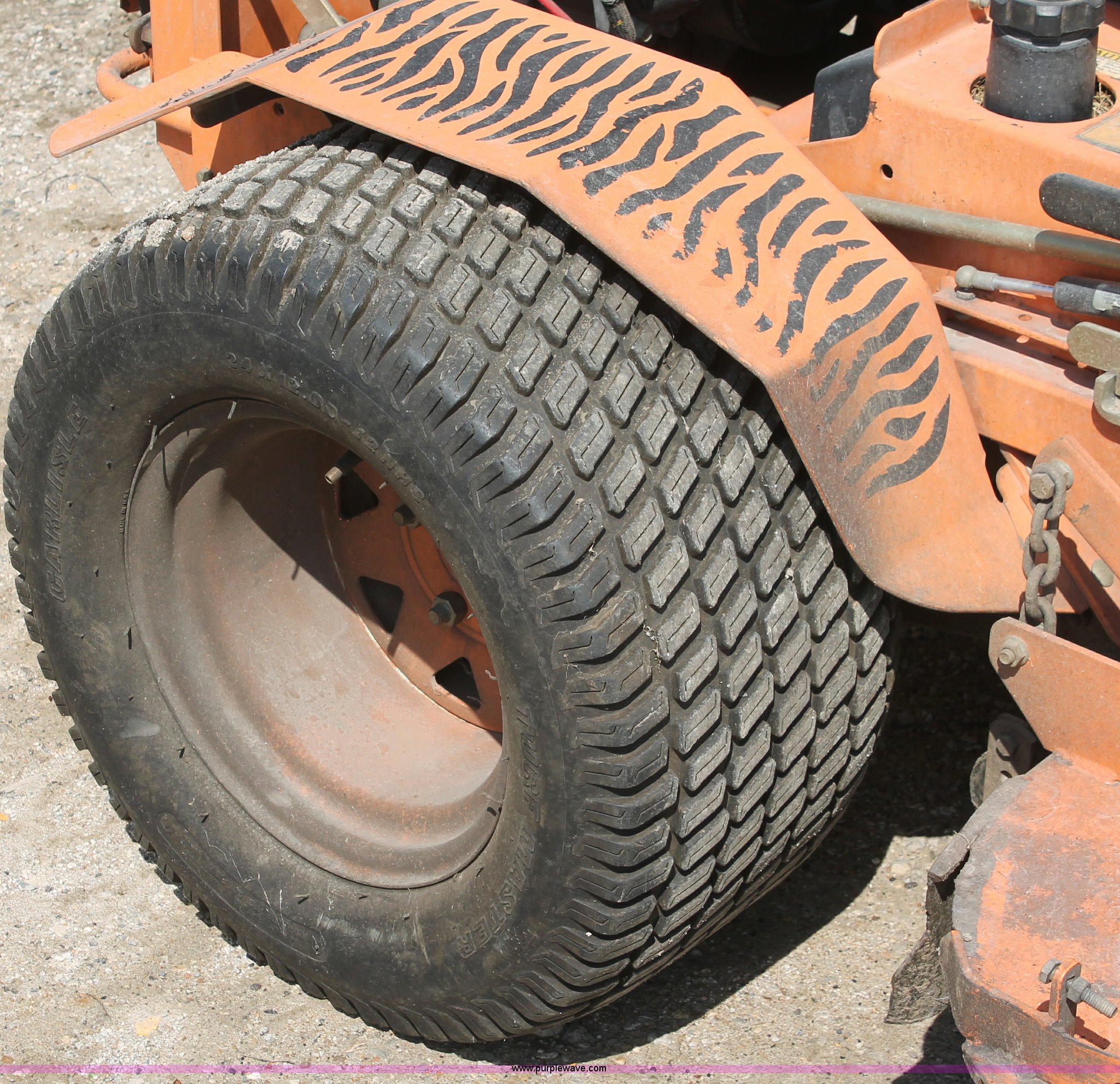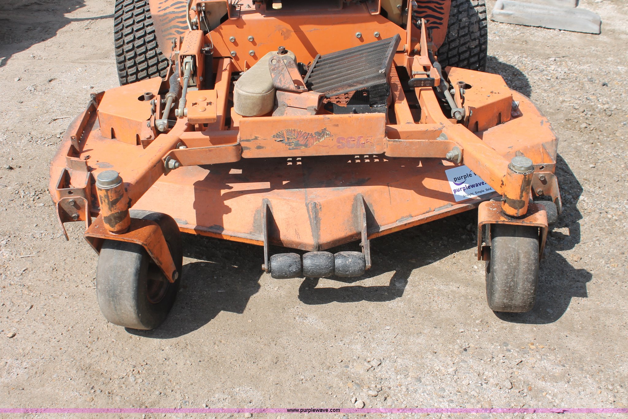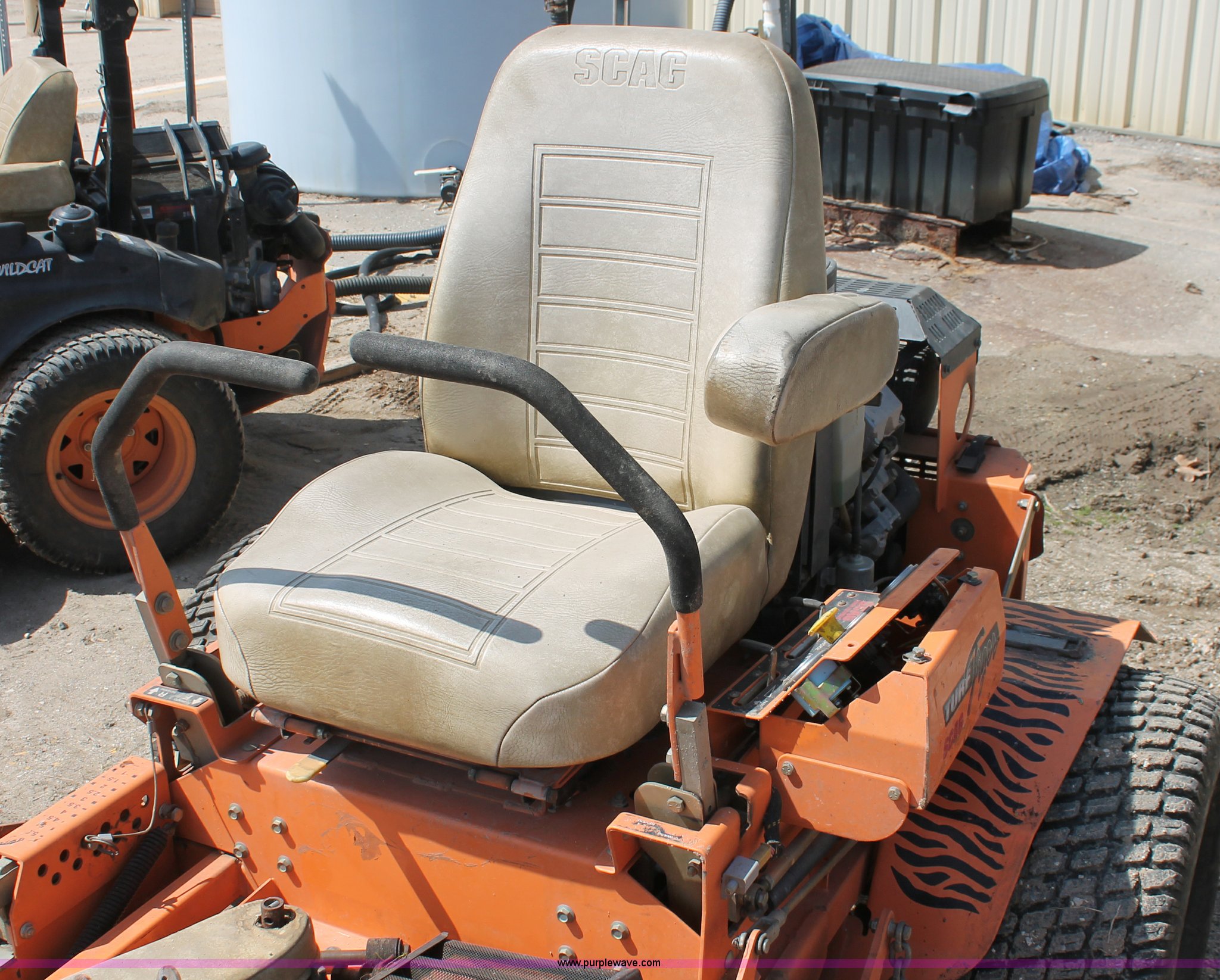 Purple Wave is selling a used Commercial Turf Mower in Kansas. This item is a Scag Turf Tiger mower with the following: 1,584 hours on meter, Model STT61A-27KA, 60" cut, Kawasaki 27 HP gas engine, Hydrostatic transmission, Zero turn, 13X5.00-6/3.25 front tires, 24X12.00-12 NHS rear tires, Unknown operating condition, Serial 6760750