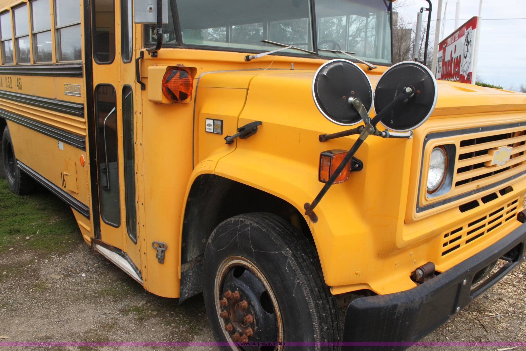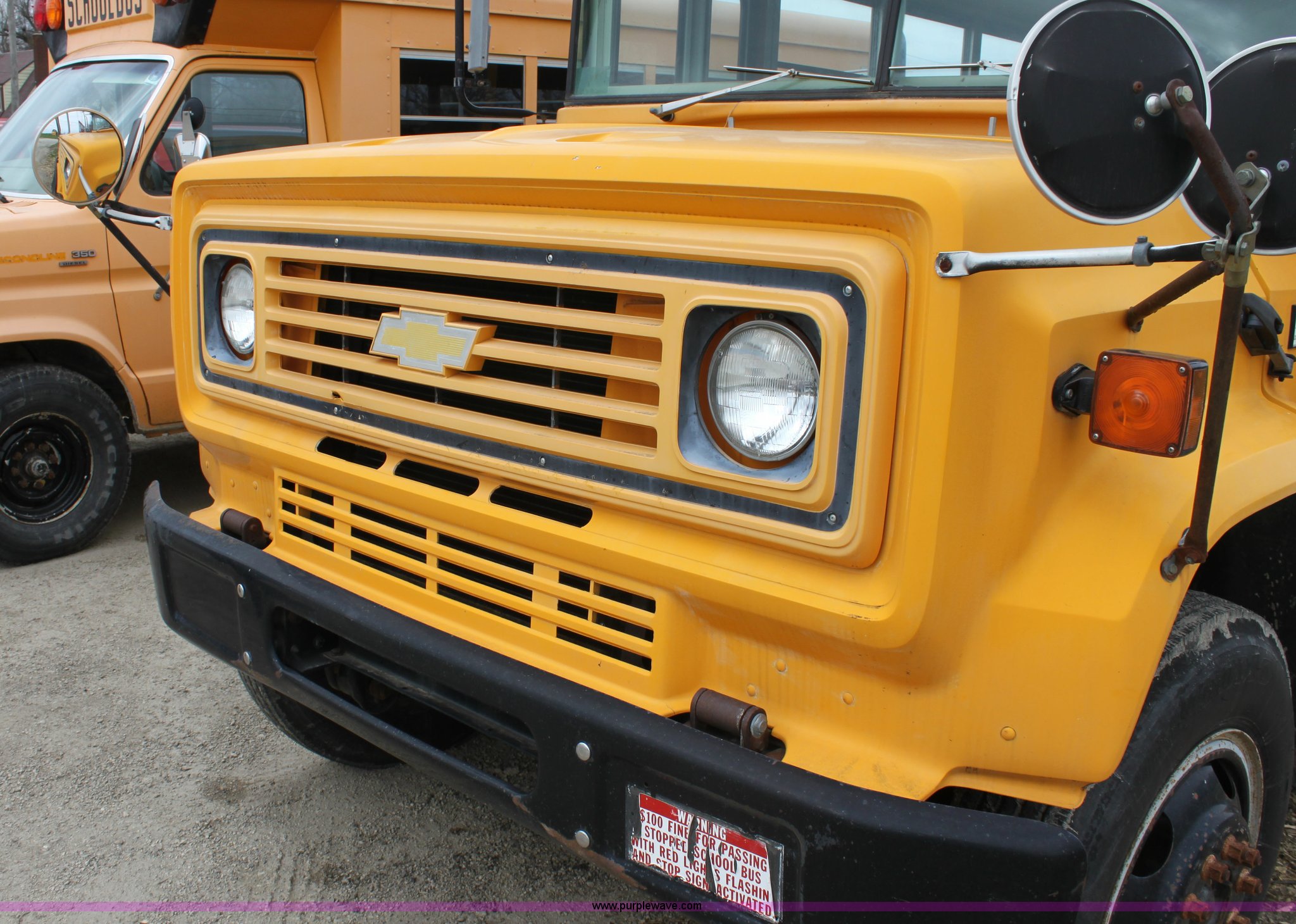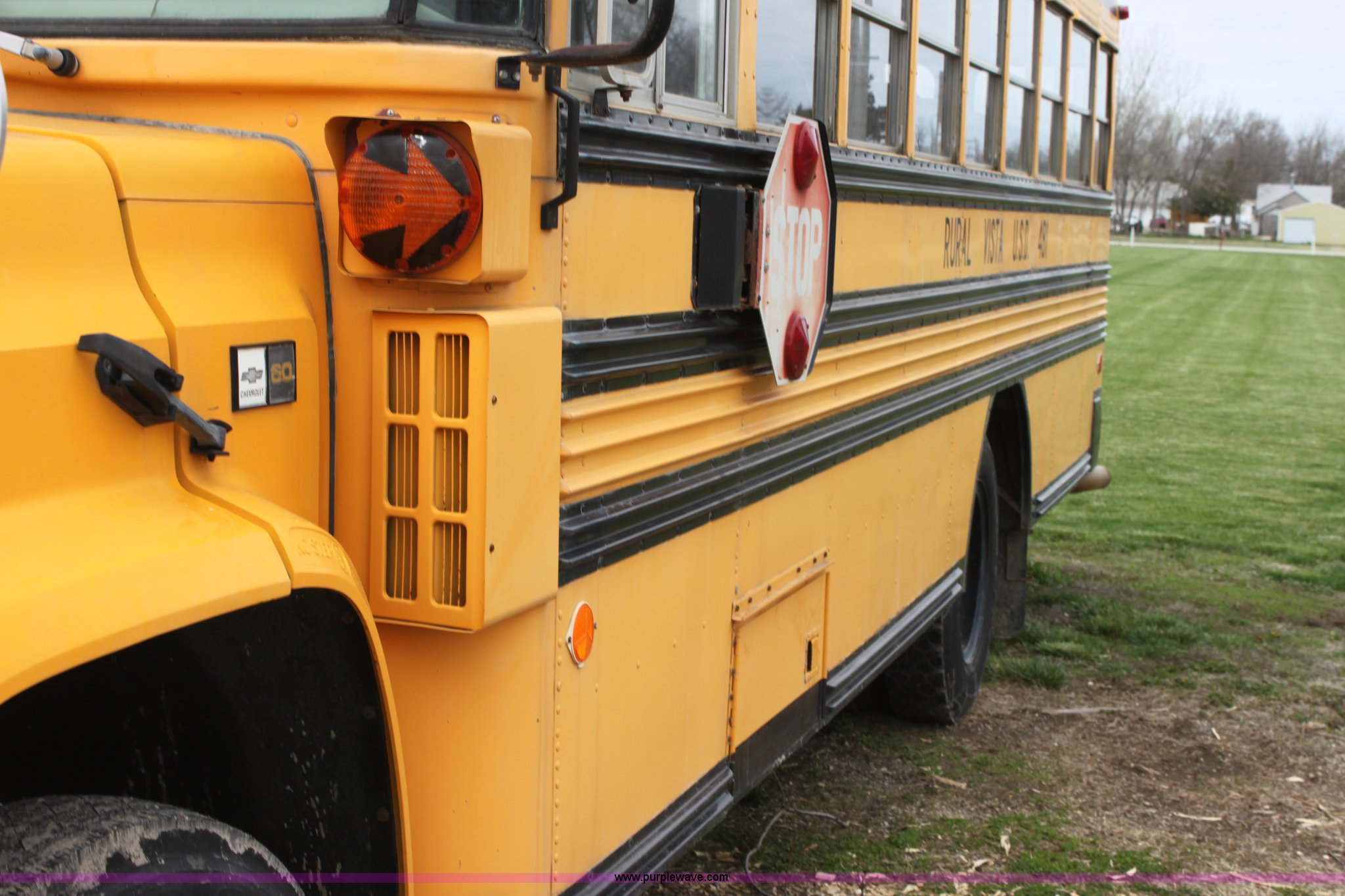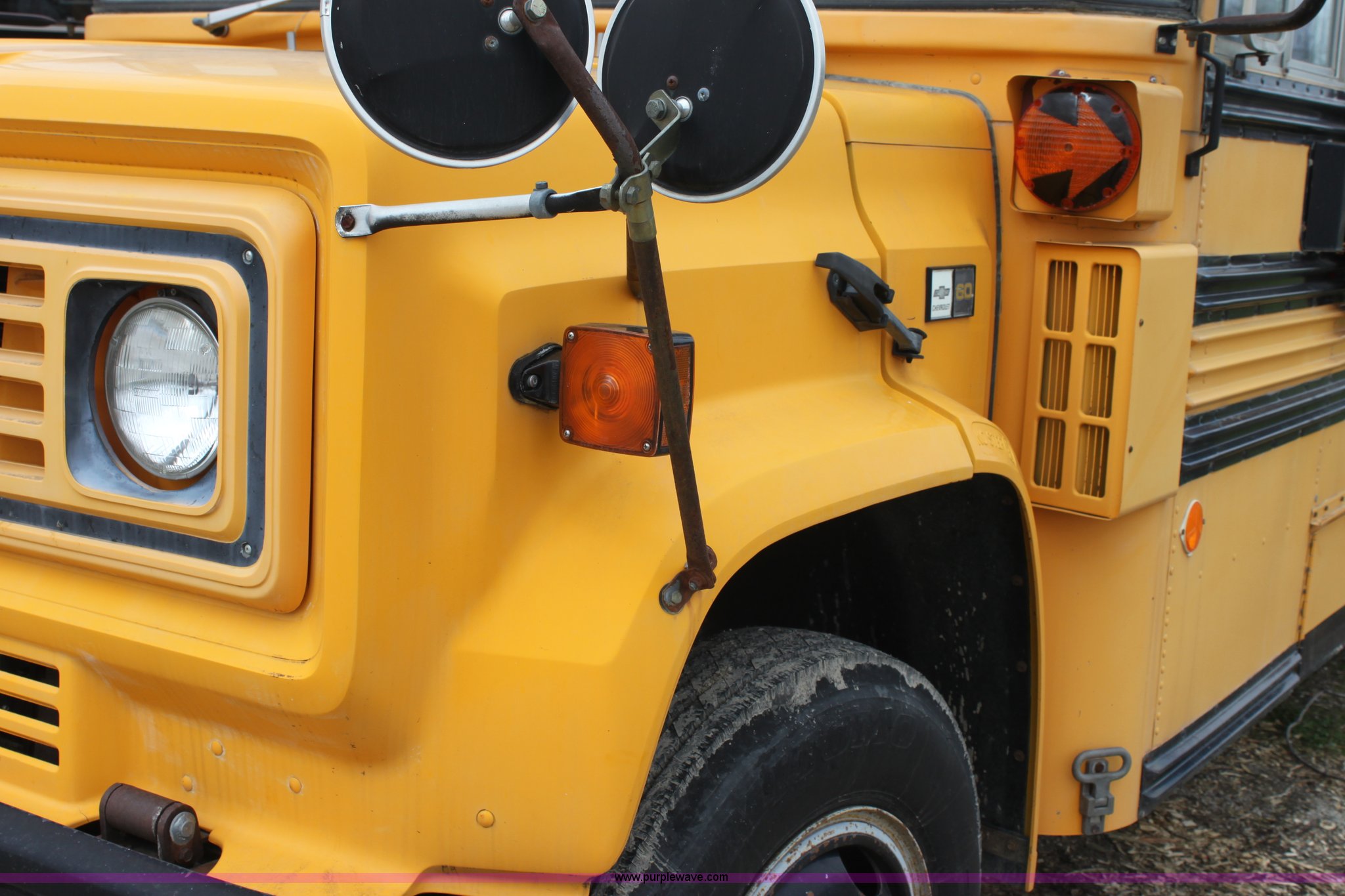 Purple Wave is selling a used Bus in Kansas. This item is a 1990 Chevrolet school bus with the following: 66,429 miles on odometer, 6.0L V8 gas engine, Five speed manual transmission, Heat, AM/FM, 8.25R20 tires