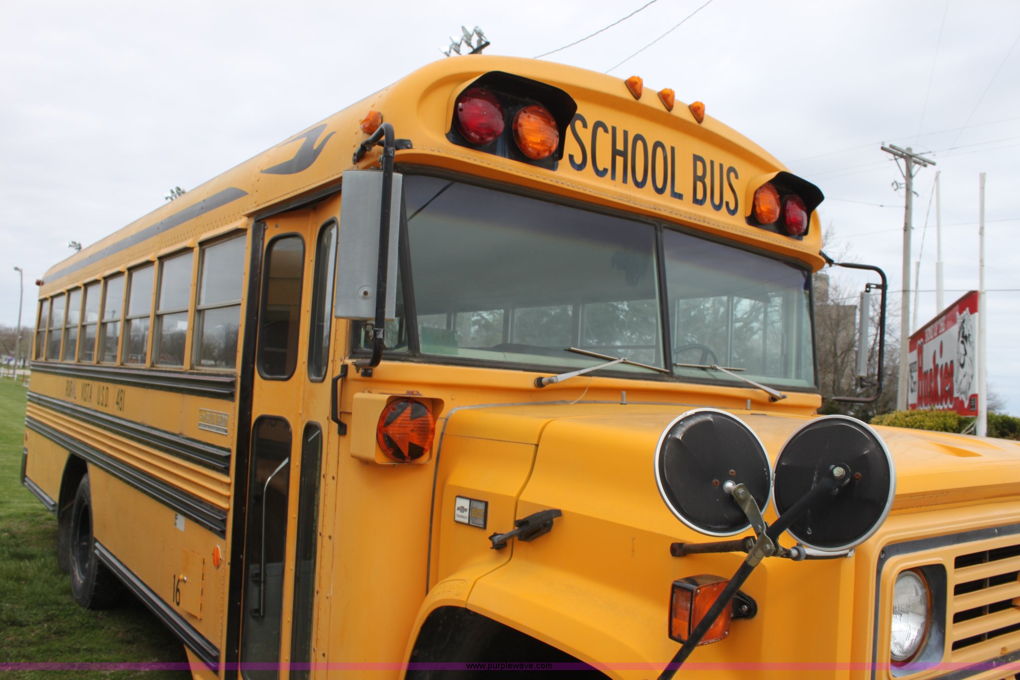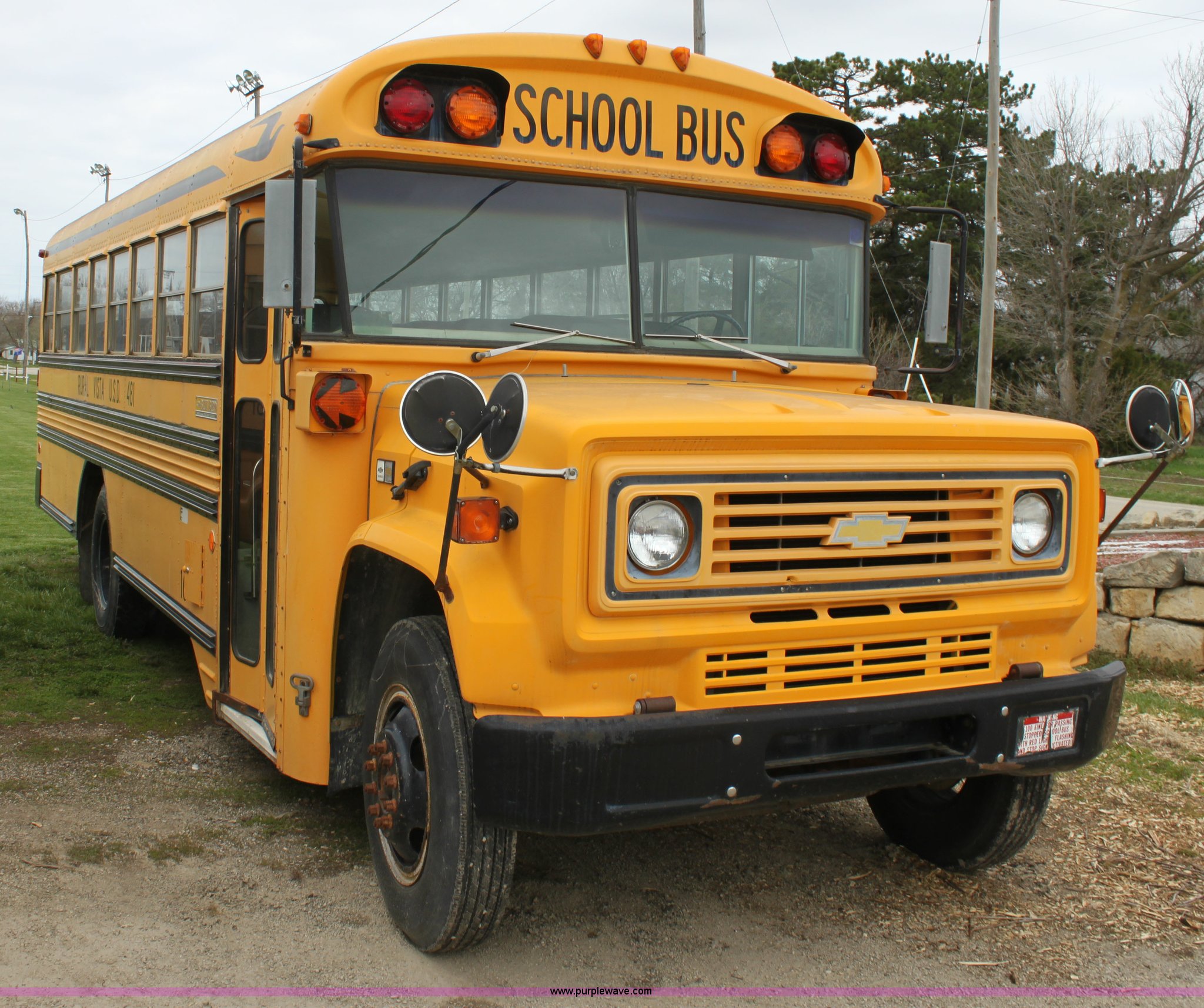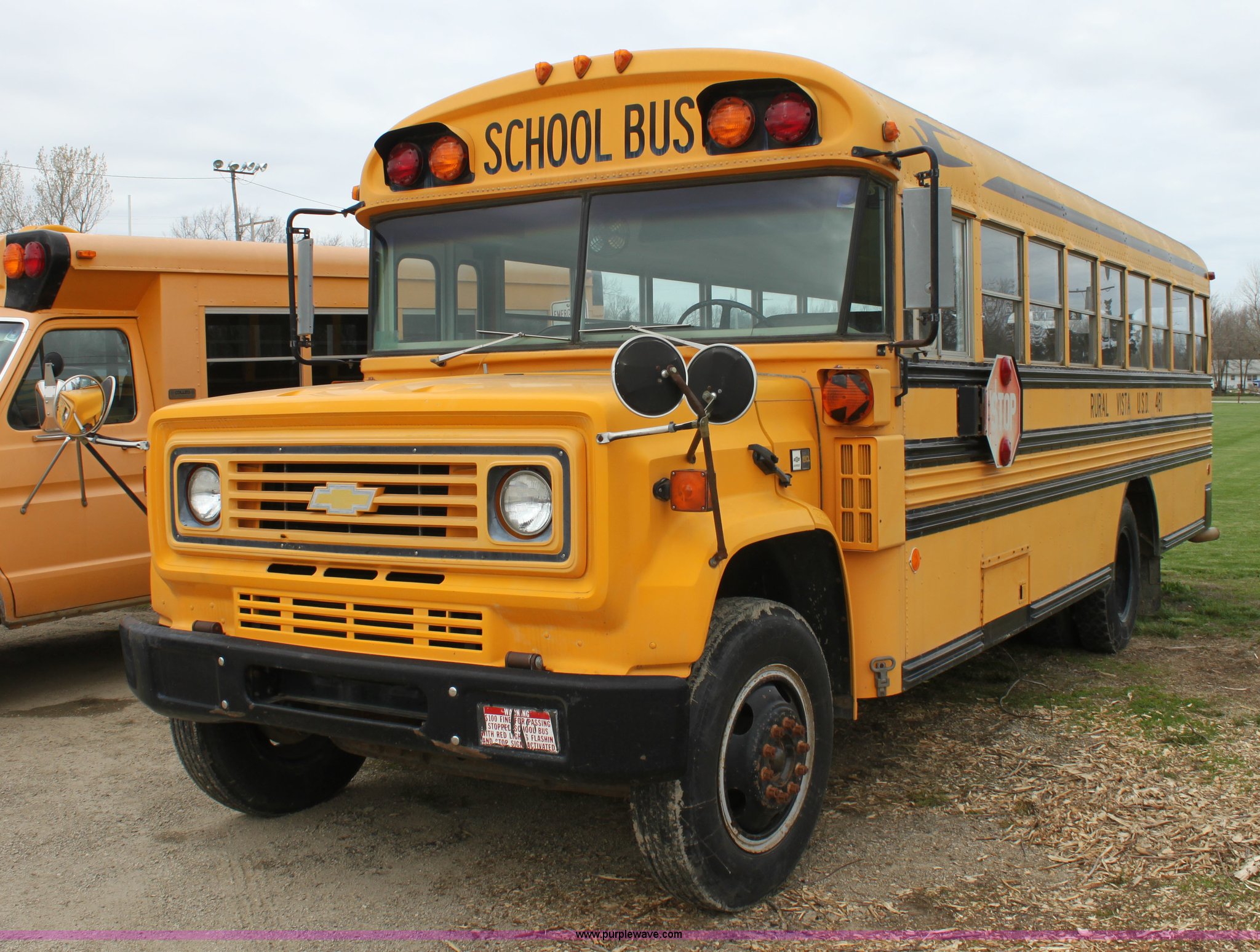 Purple Wave is selling a used Bus in Kansas. This item is a 1990 Chevrolet school bus with the following: 66,429 miles on odometer, 6.0L V8 gas engine, Five speed manual transmission, Heat, AM/FM, 8.25R20 tires