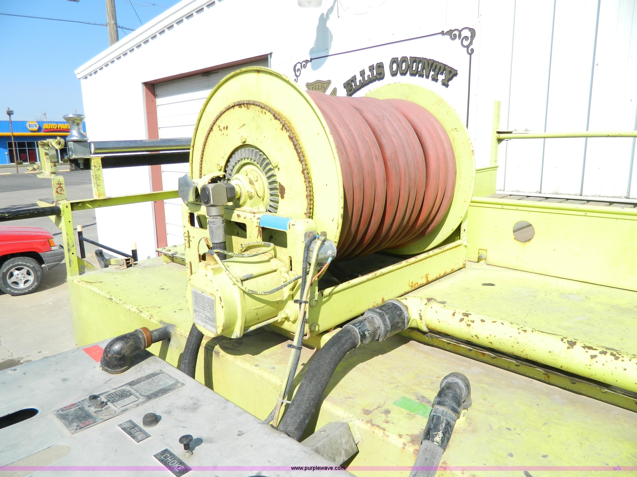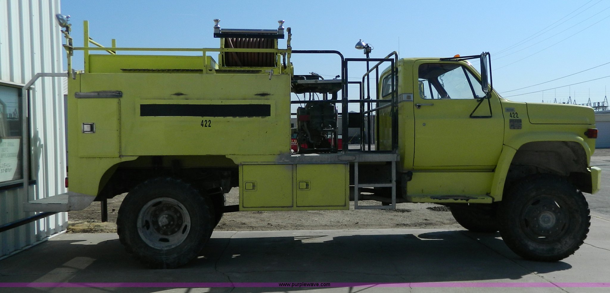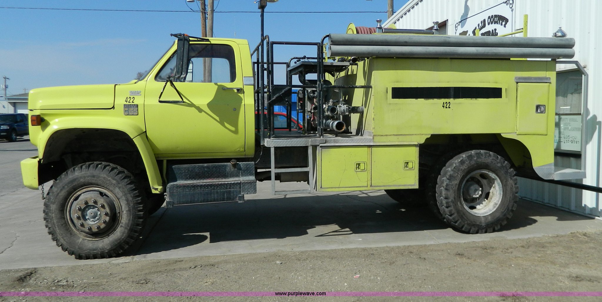 Purple Wave is selling a used Fire Truck or Emergency Vehicle in Kansas. This item is a 1973 Chevrolet C65 fire truck with the following: 3,600 miles on odometer, Not Actual Mileage, 5,018 hours on meter, Chevrolet V8 gas engine, Four wheel drive, Hale 250 gpm pump, 1,000 gallon water tank, Electric hose reel, 10.00-20 tires, Cosmetic damage, Rust