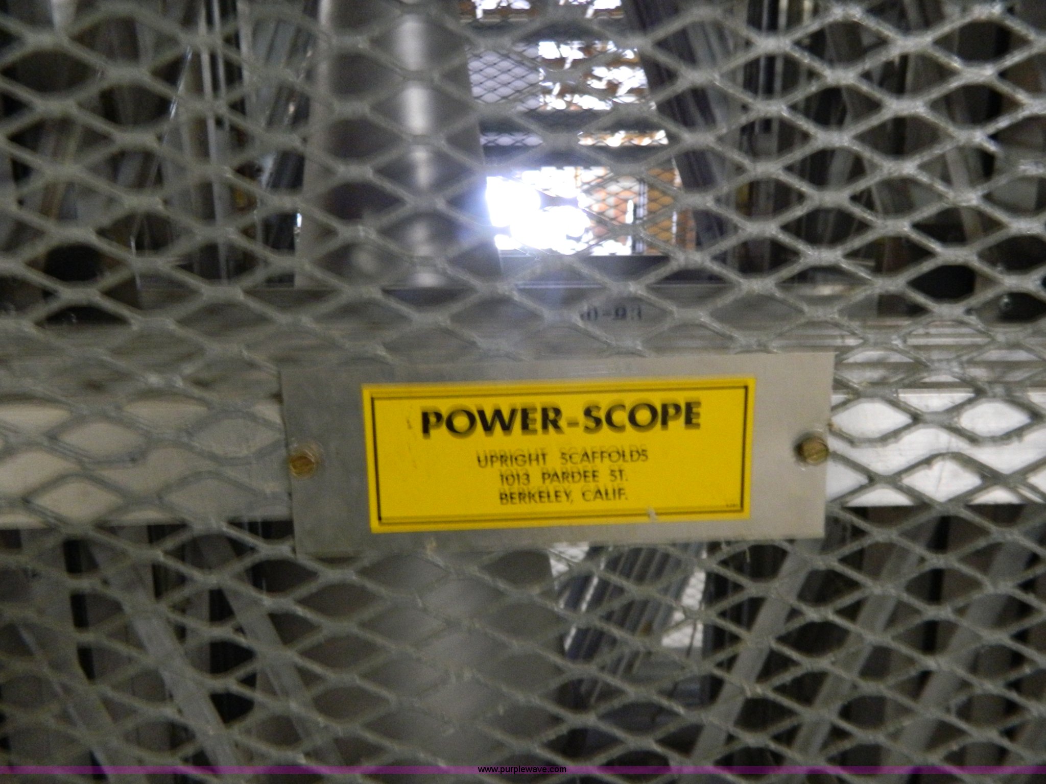 Purple Wave is selling a used Tools in Kansas. This item is a Aluminum Power Scope man lift with the following: 45'H scaffold, 4' x 5' platform, 880 lbs capacity, 115V