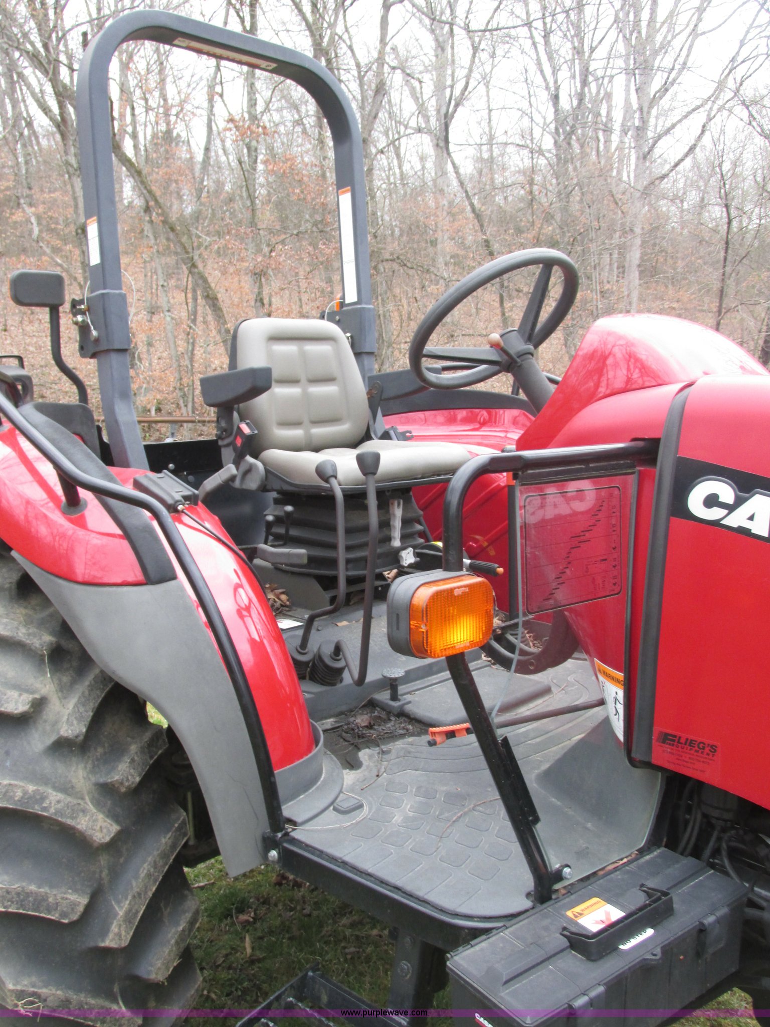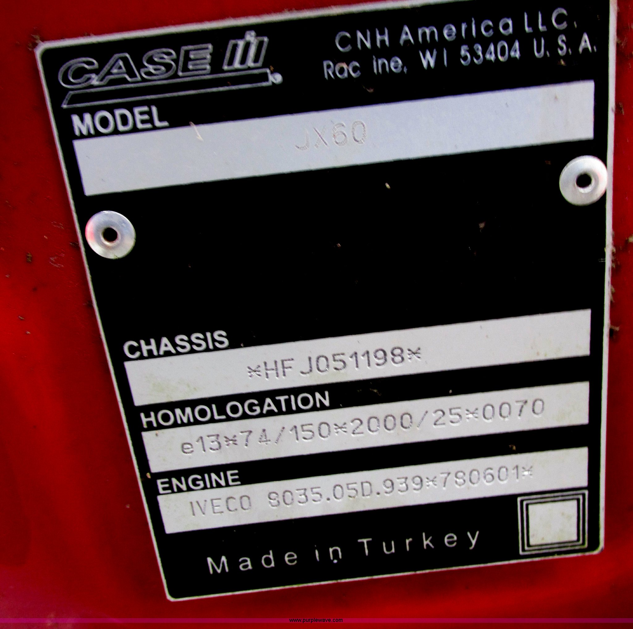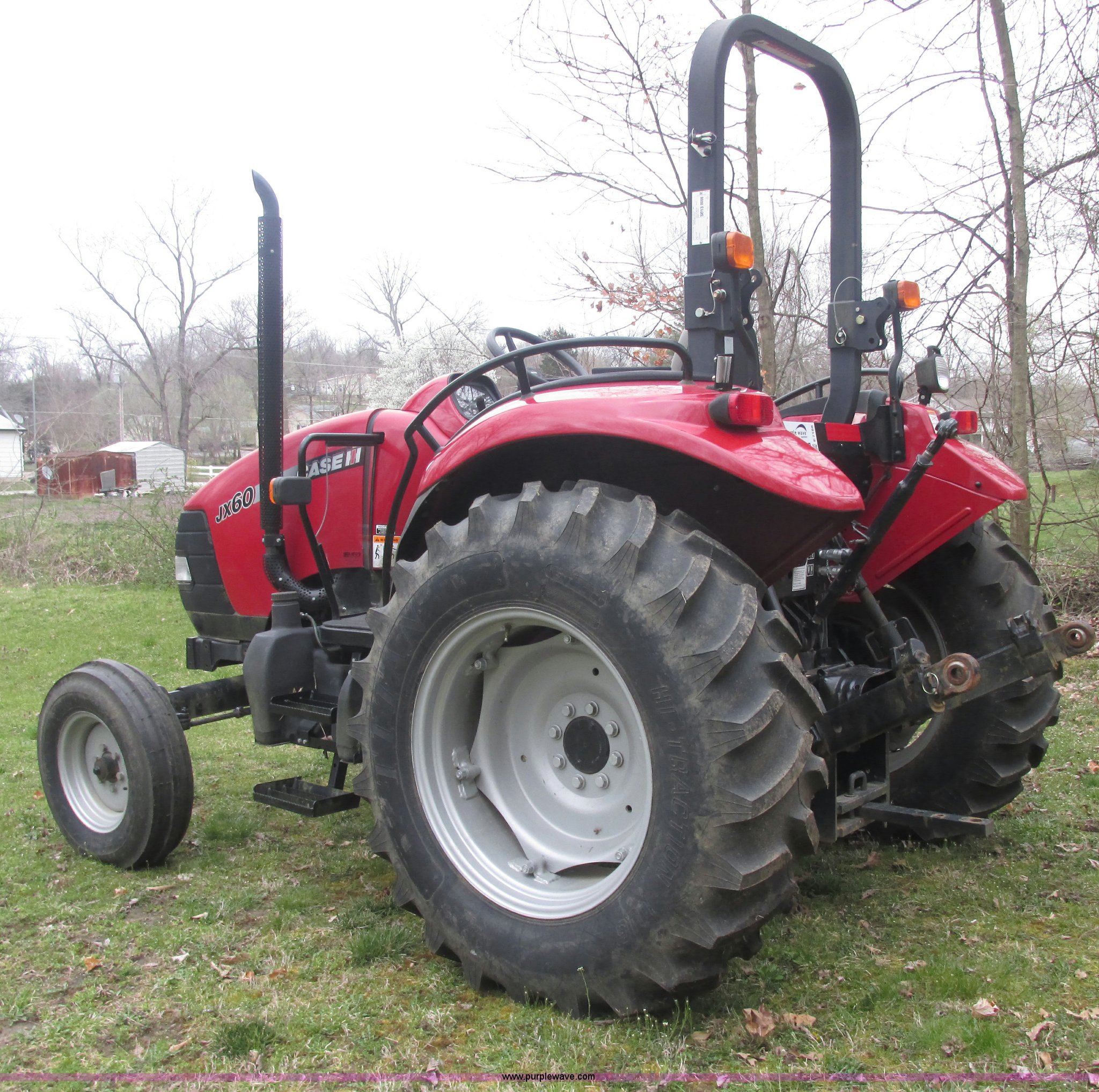 Purple Wave is selling a used Tractor in Missouri. This item is a 2008 Case IH JX60 tractor with the following: 51 actual hours, Three cylinder diesel engine, Serial 50V047535, Four speed transmission, Three range shift on the go transmission, Reverse, Positive traction locking rear end, Fold down ROPS canopy, Seat belt, Adjustable seat, Horn, Power steering, Air cylinder assist hood latch, Dual fender hand rails, Front plexi-glass guards, Parking brake, Exhaust heat shield, Quick hitch, Three point, Stabilizers, PTO, Guard, Dual remotes, Draw bar, Rear lights, Headlights, Blinkers, Auxiliary toolbox, Rear trailer wiring, Adjustable width front axle, 7.50-16SL front tires, 14.9-28 rear tires, Recently replaced battery, Serial HFJ051198