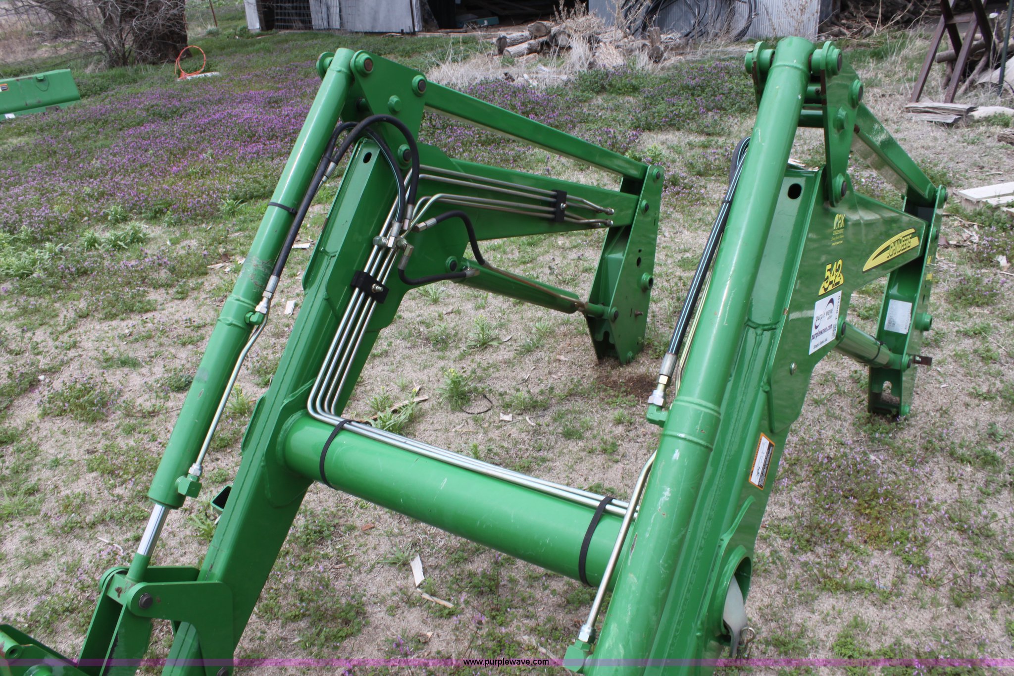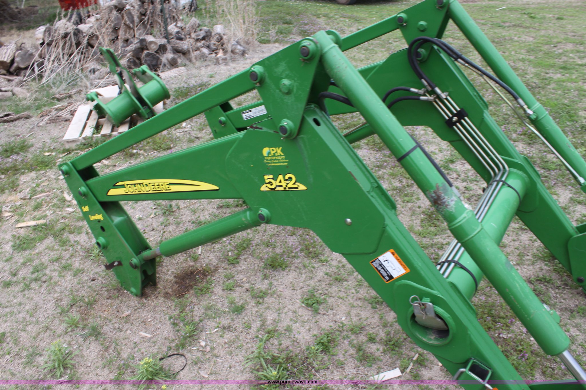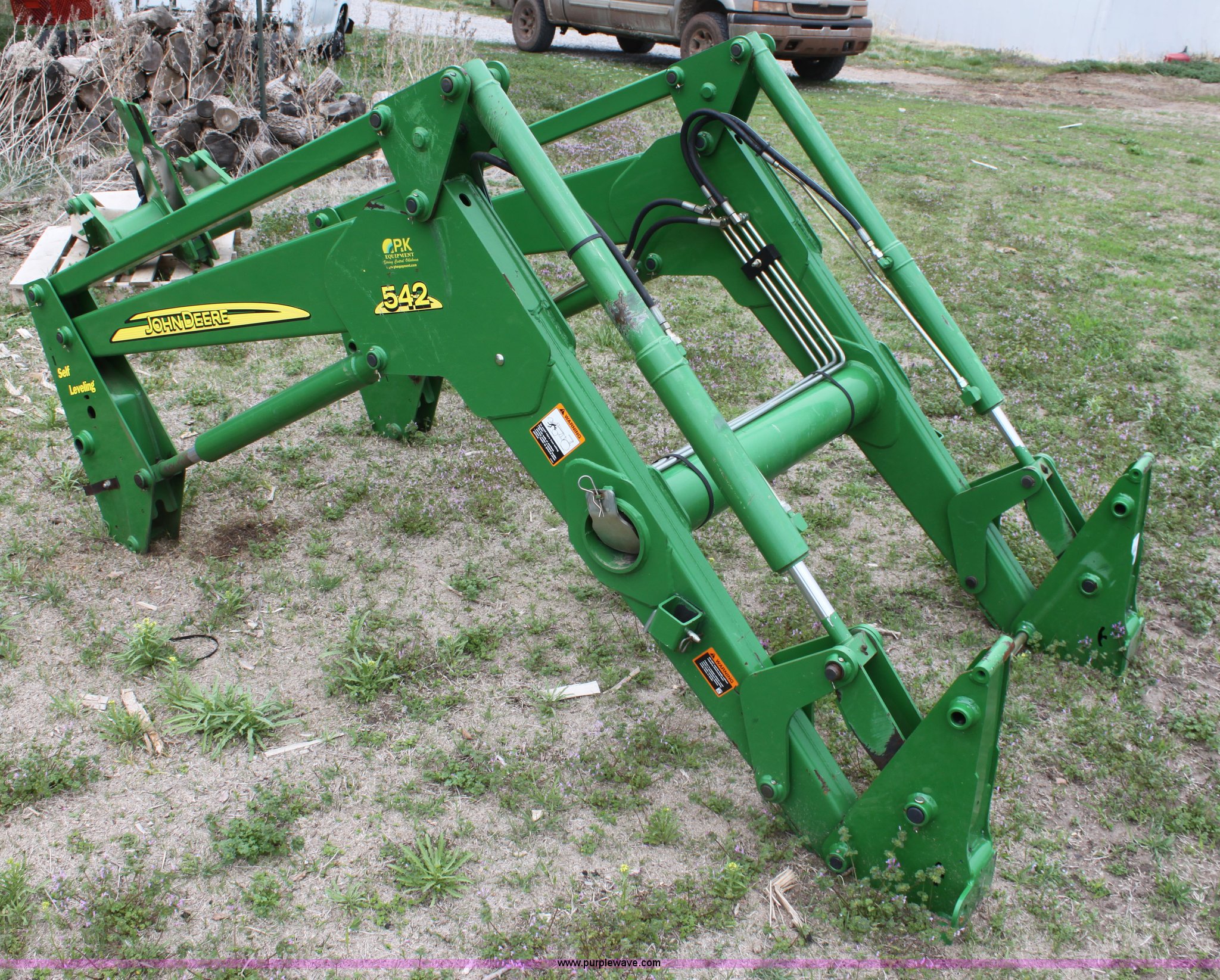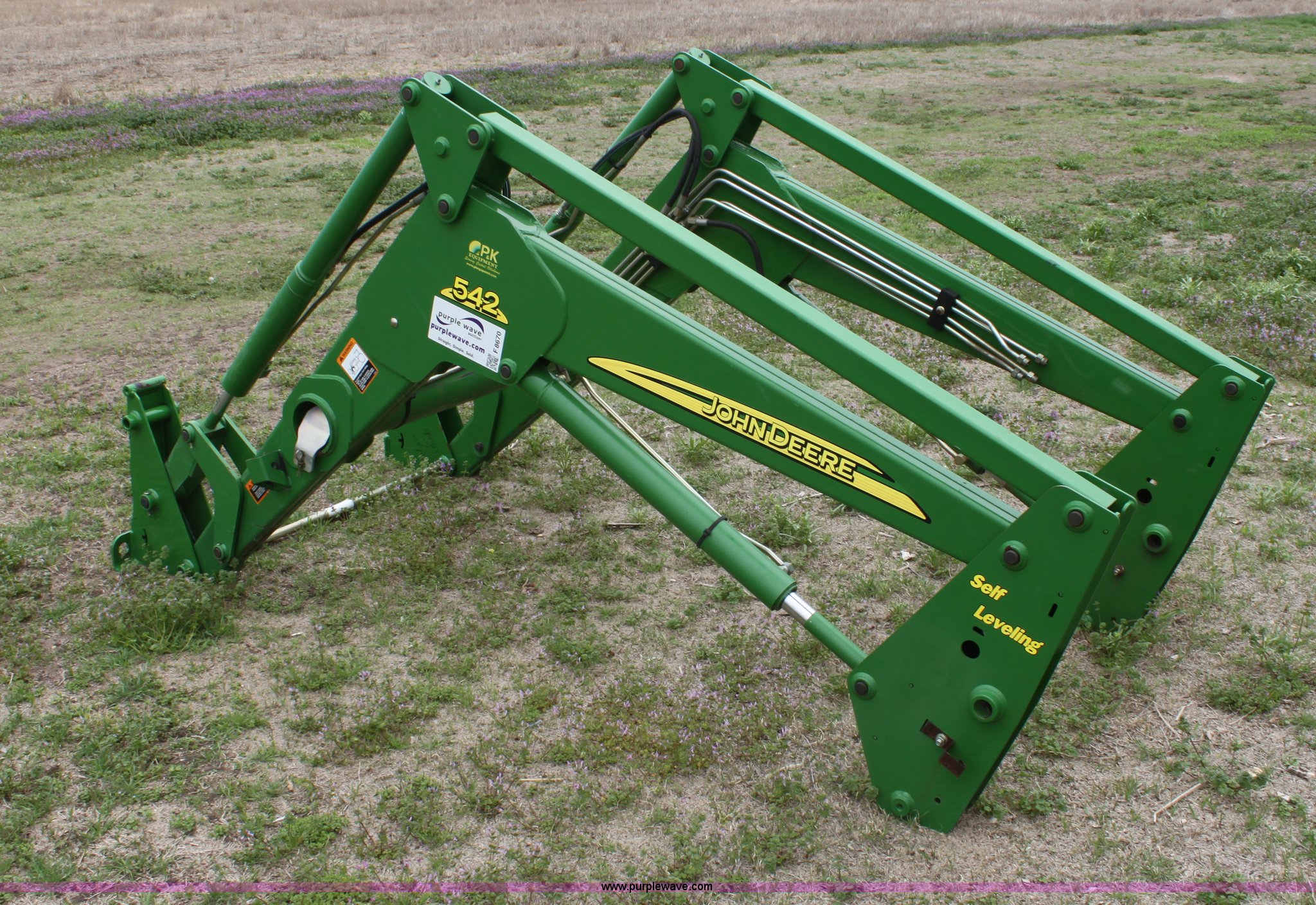 Purple Wave is selling a used Ag Tractor Loader or Attach. in Oklahoma. This item is a John Deere 542 loader with the following: Self leveling bucket, Includes bucket, One arm has slight bend