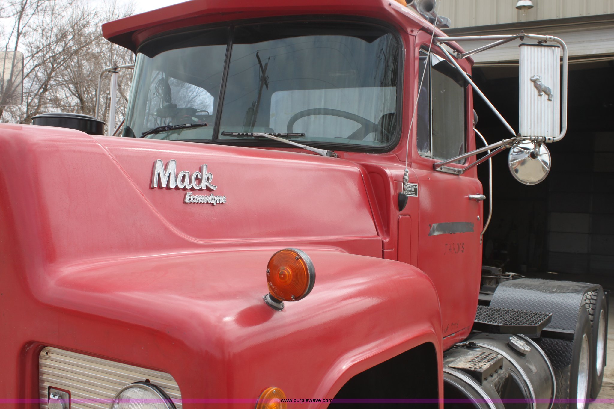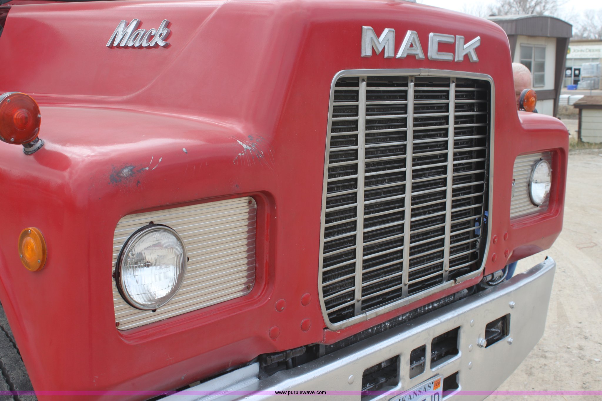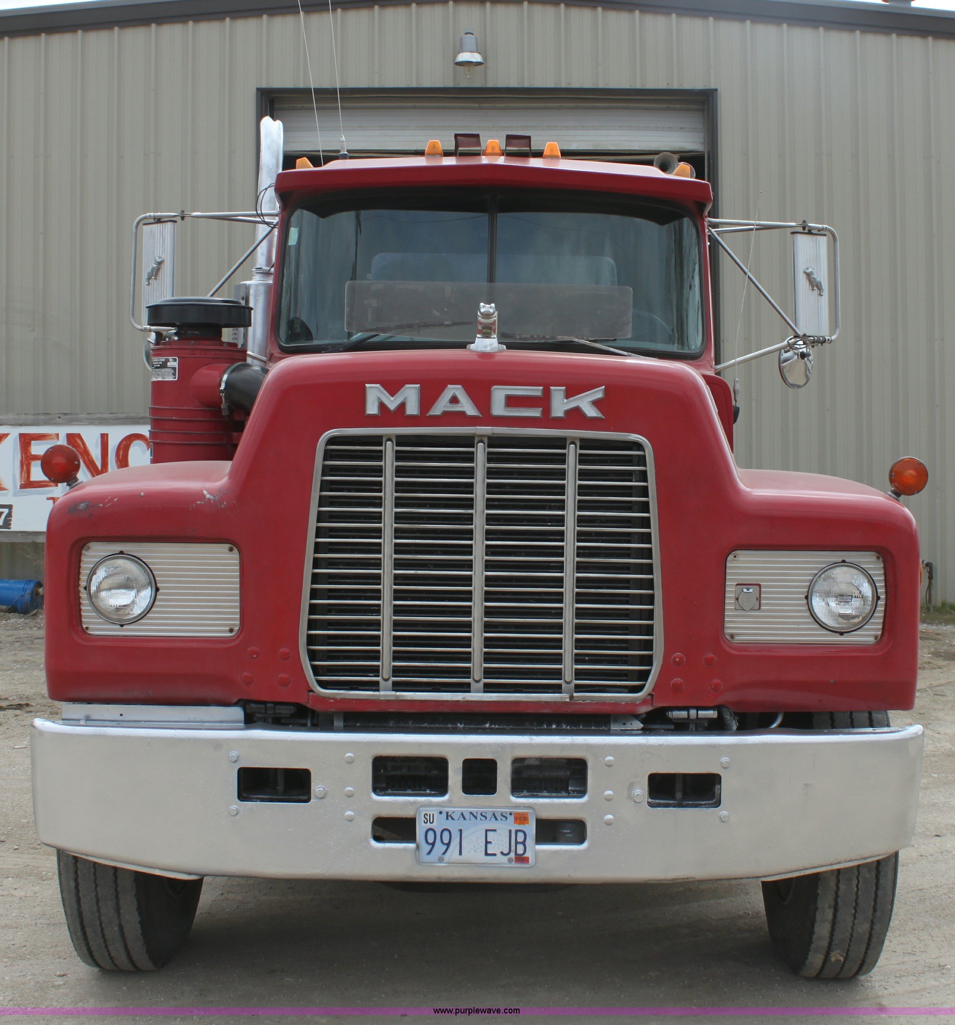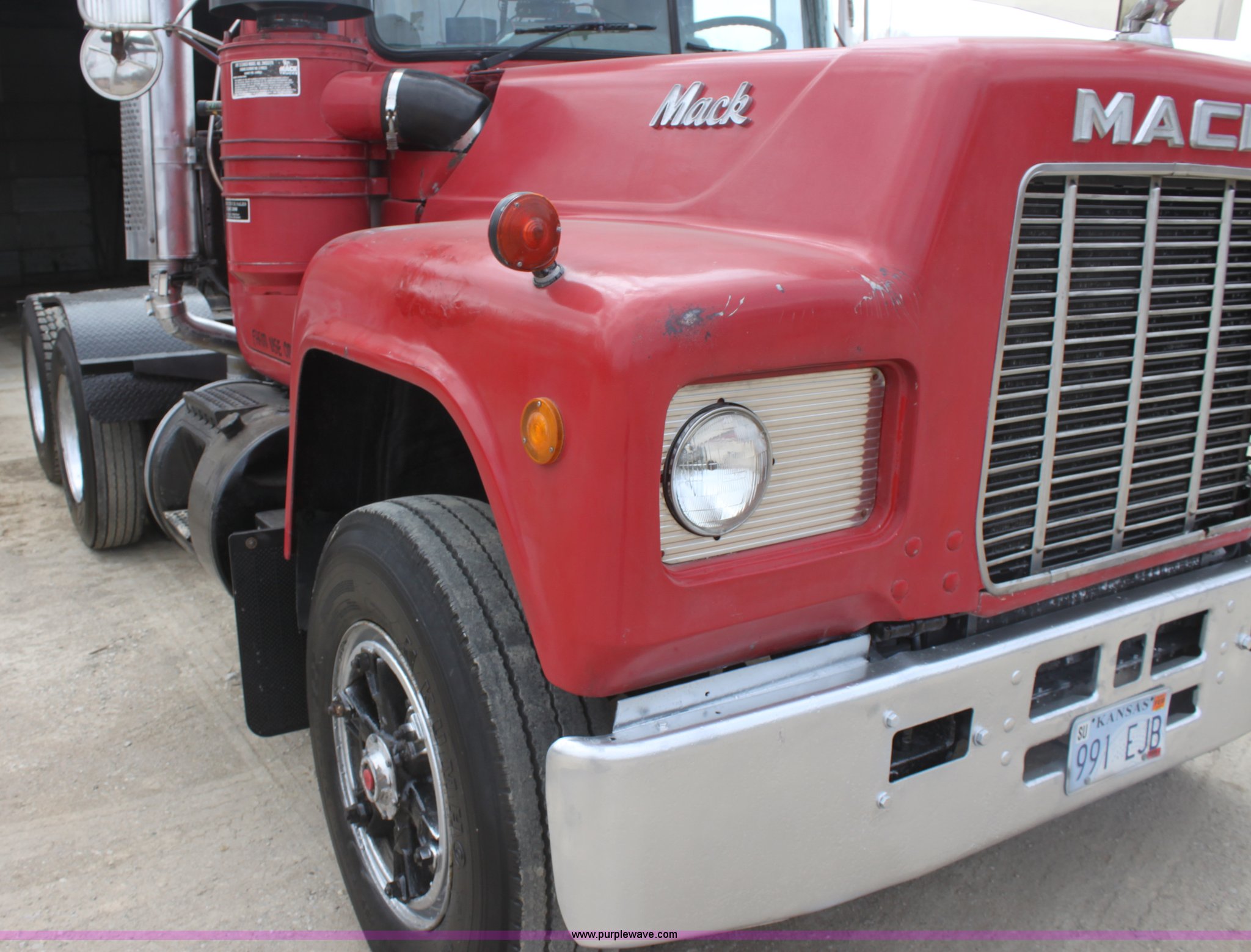 Purple Wave is selling a used Truck Tractor in Kansas. This item is a 1987 Mack R686ST semi truck with the following: 461,131 miles on odometer, Mack E6 11.0L L6 diesel engine, Manual transmission, Twin screw, Heat, Tilt, Air suspension seat, Wet kit, Right hand fuel tank converted to hydraulic tank, Exterior visor, Chrome bumper, Dual fuel tank, Adjustable rear pin hitch, Single rear exhaust stack, Spring suspension, 11R22.5 tires, Interior/exterior cosmetic damage