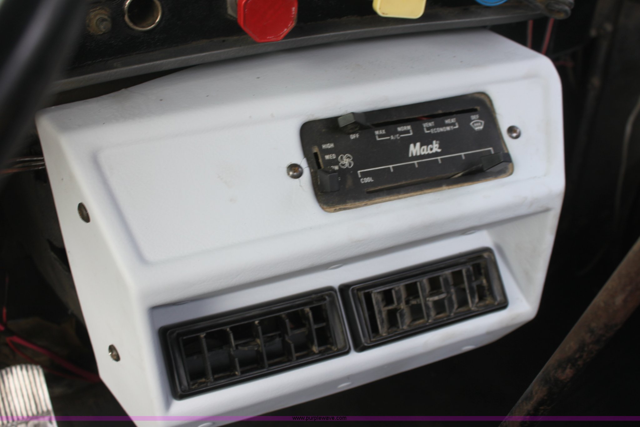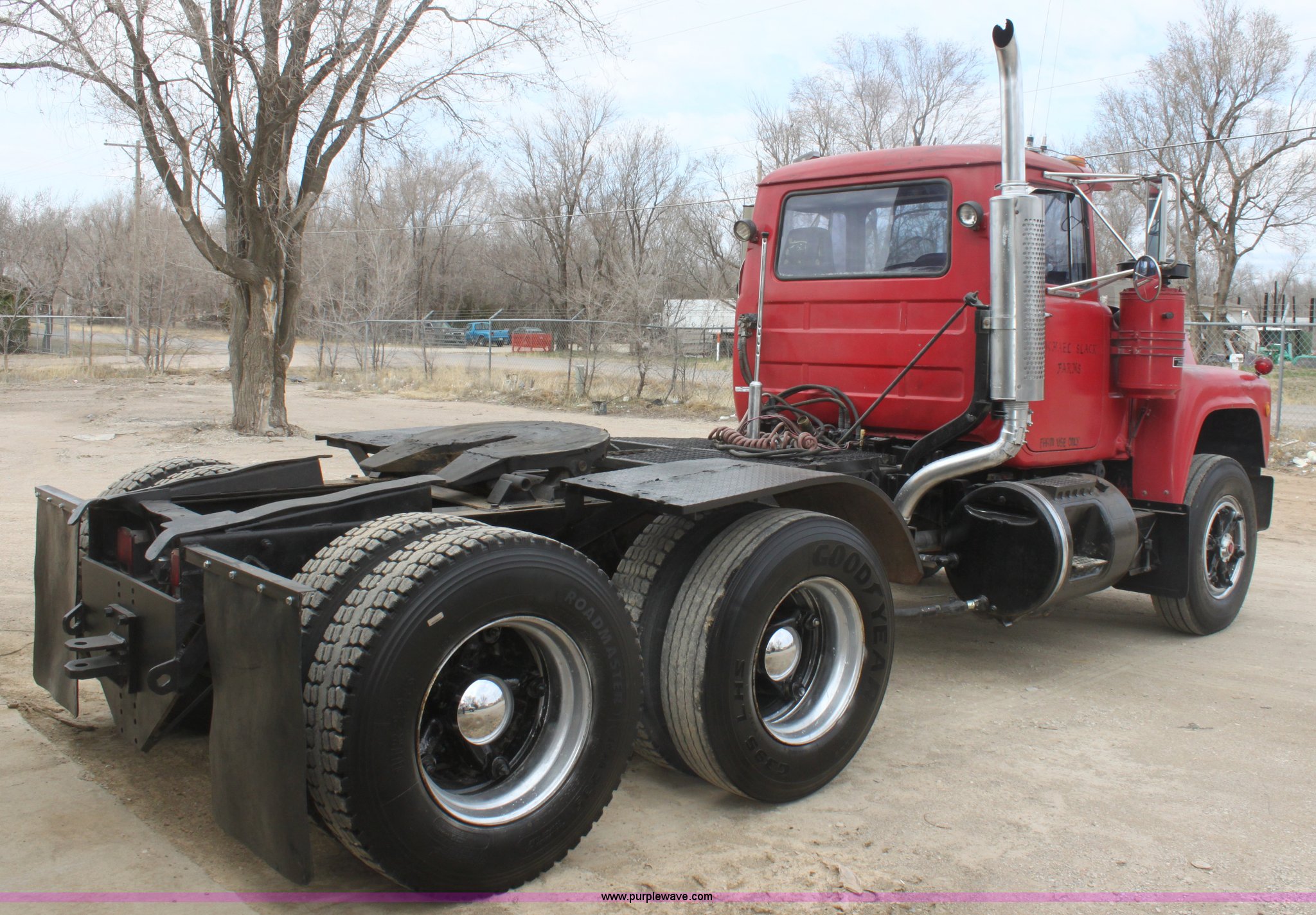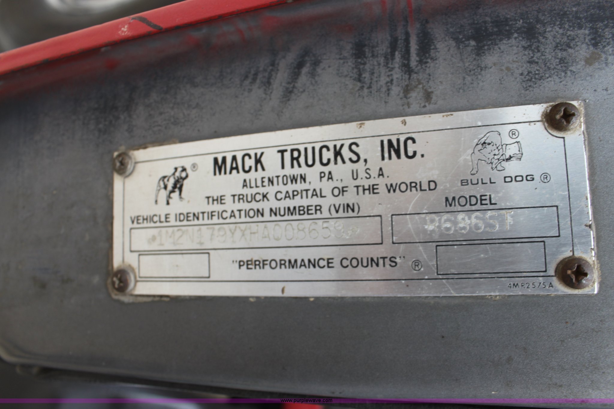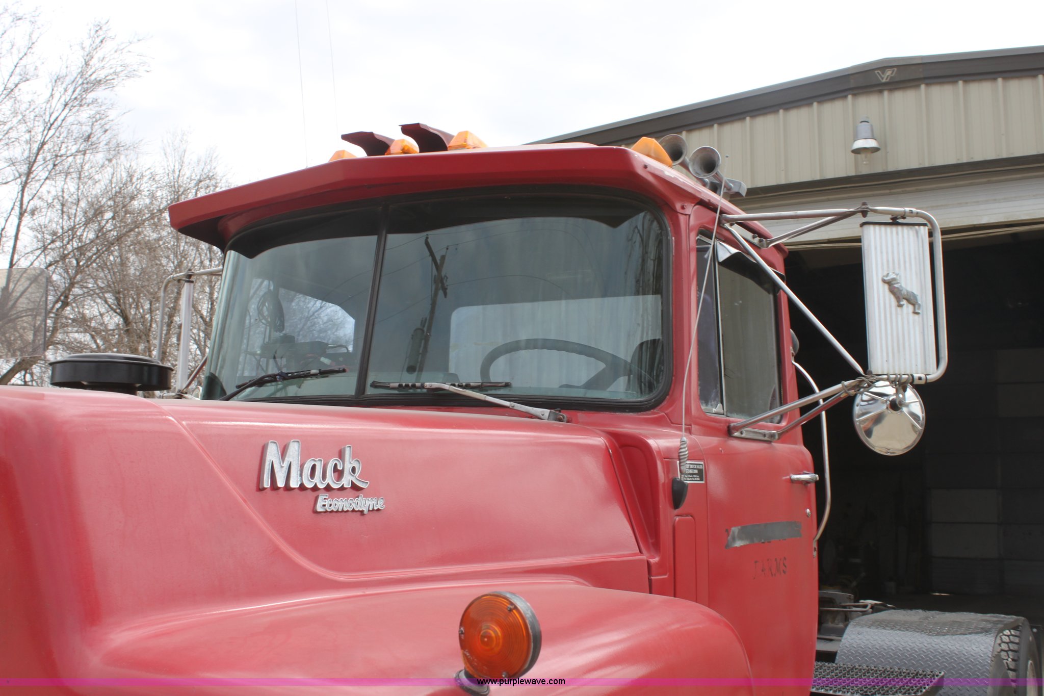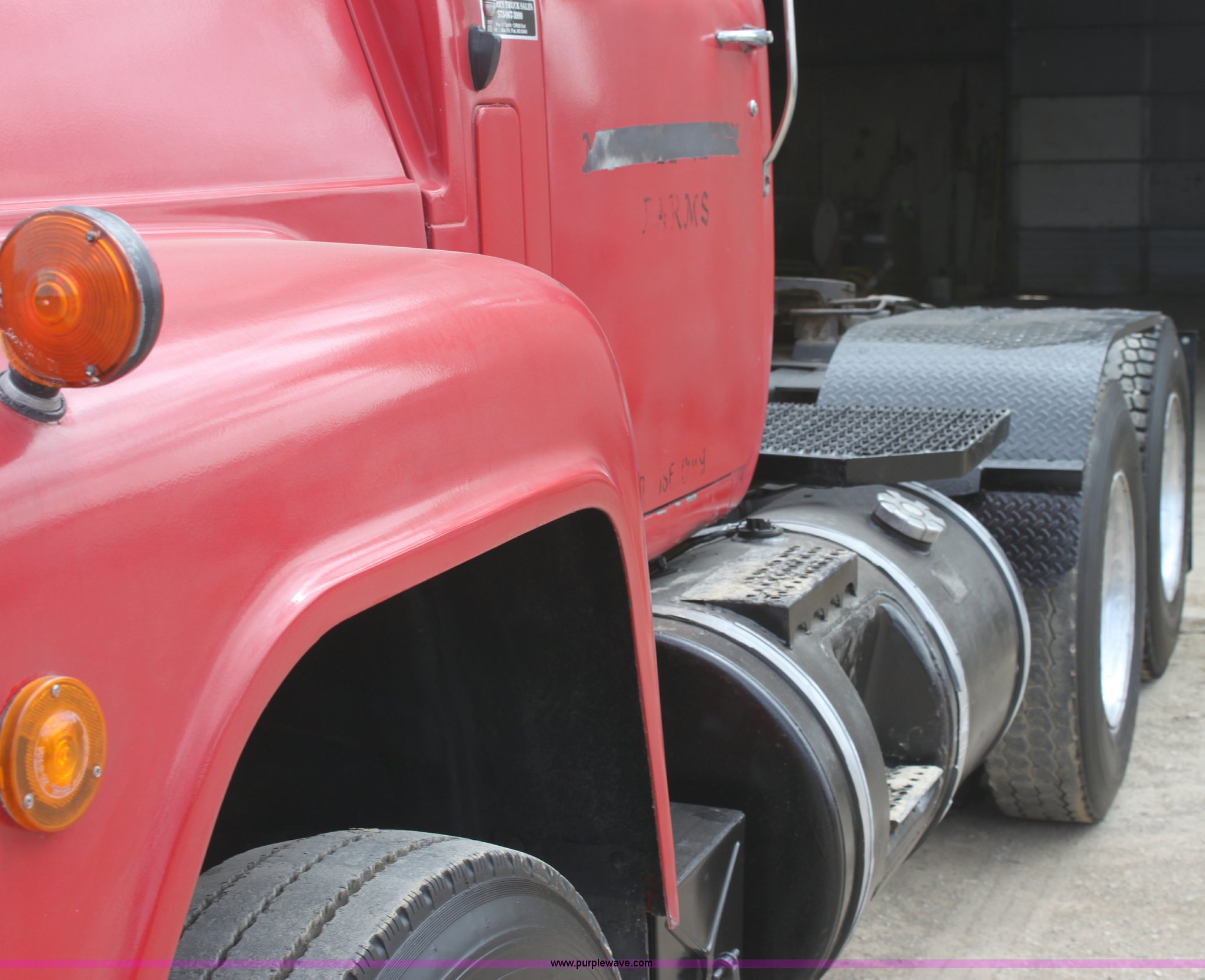 Purple Wave is selling a used Truck Tractor in Kansas. This item is a 1987 Mack R686ST semi truck with the following: 461,131 miles on odometer, Mack E6 11.0L L6 diesel engine, Manual transmission, Twin screw, Heat, Tilt, Air suspension seat, Wet kit, Right hand fuel tank converted to hydraulic tank, Exterior visor, Chrome bumper, Dual fuel tank, Adjustable rear pin hitch, Single rear exhaust stack, Spring suspension, 11R22.5 tires, Interior/exterior cosmetic damage